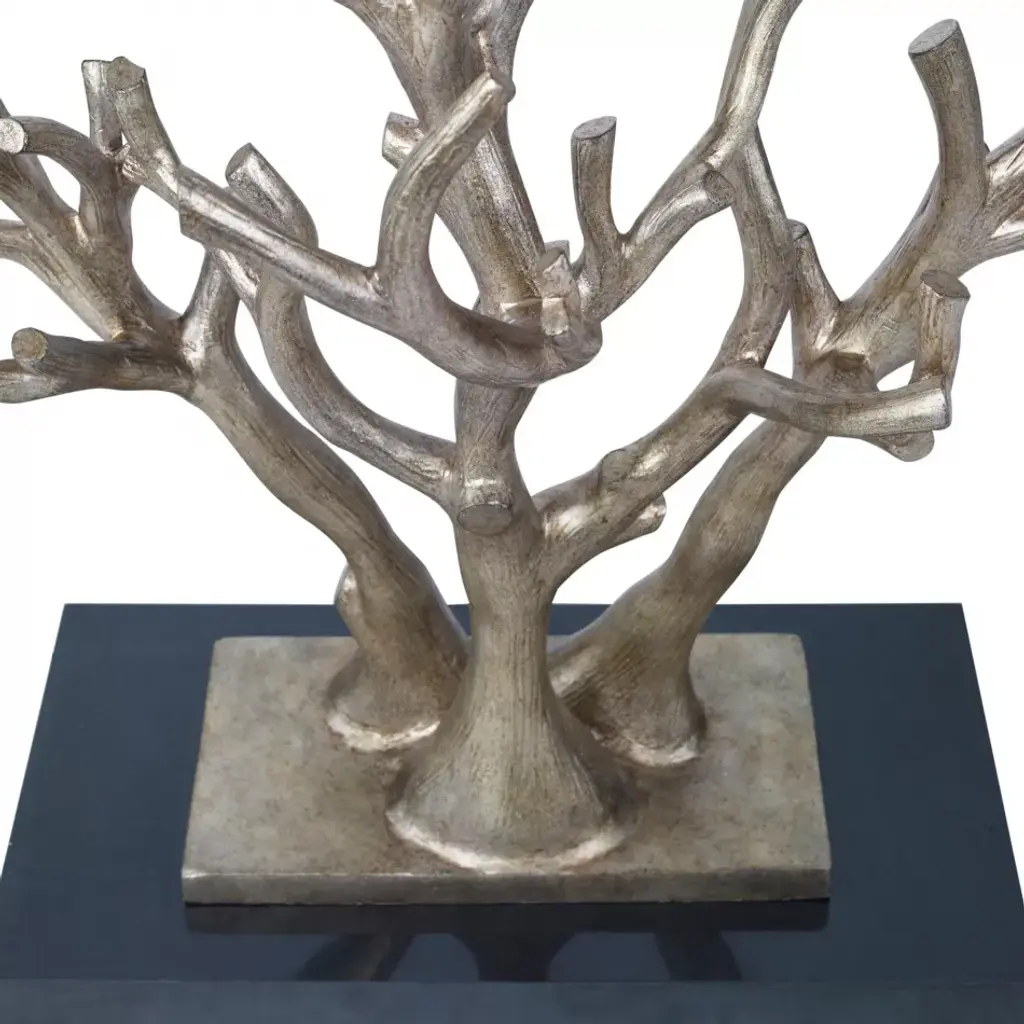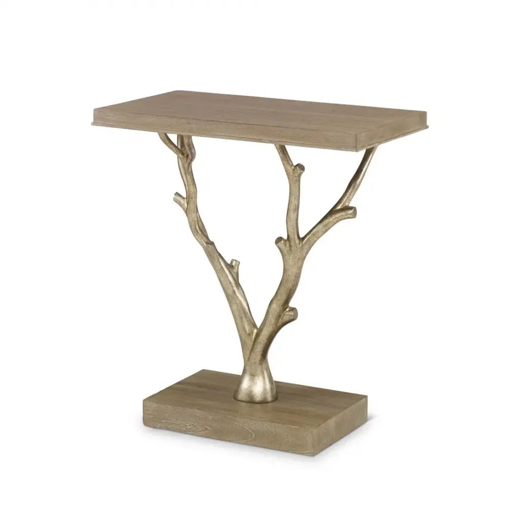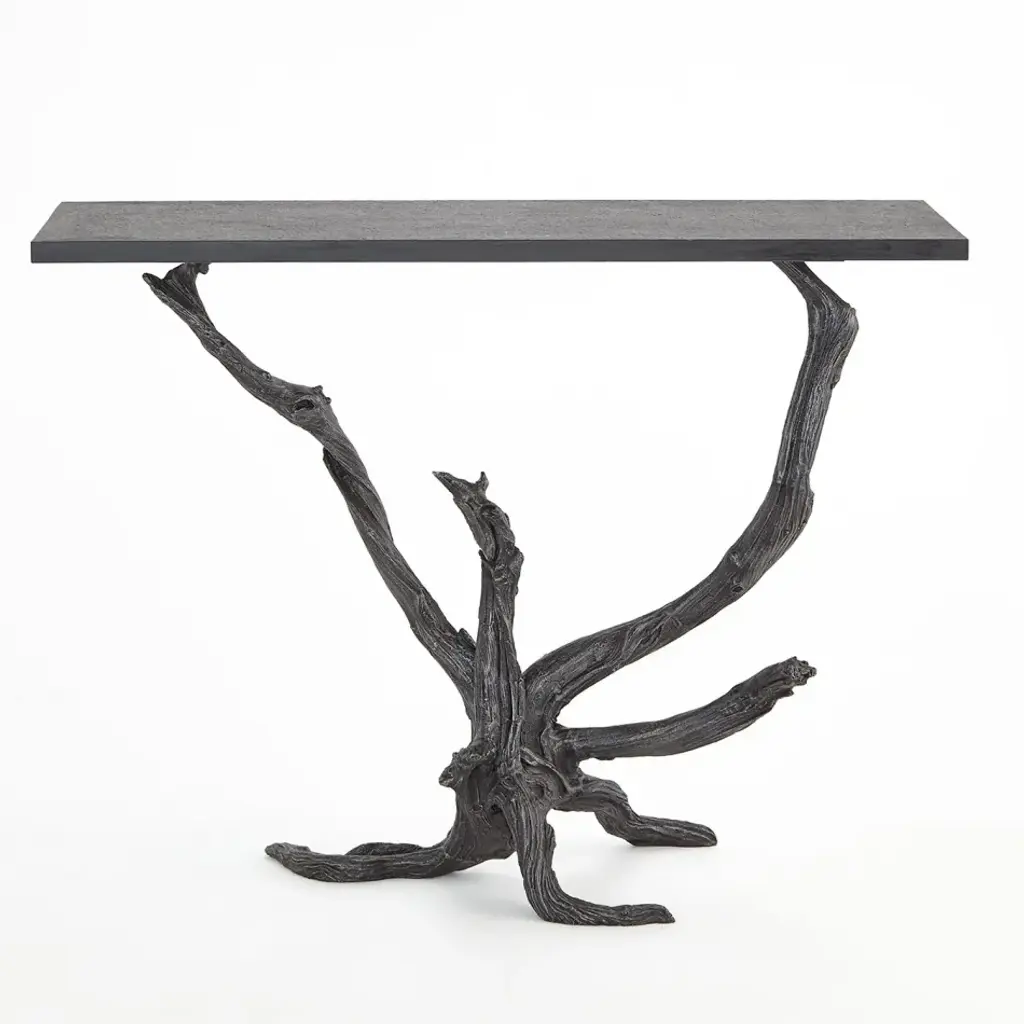 This tree branch inspired console features a small cast aluminum base finished with antiqued silver metal leaf and set on top of a larger black granite base. Top is American White Oak in a ceruse finish.