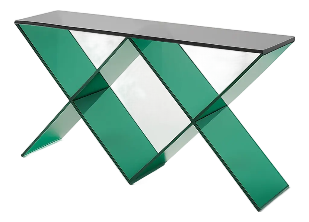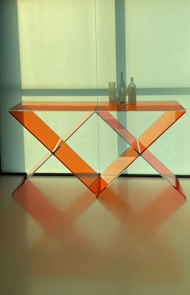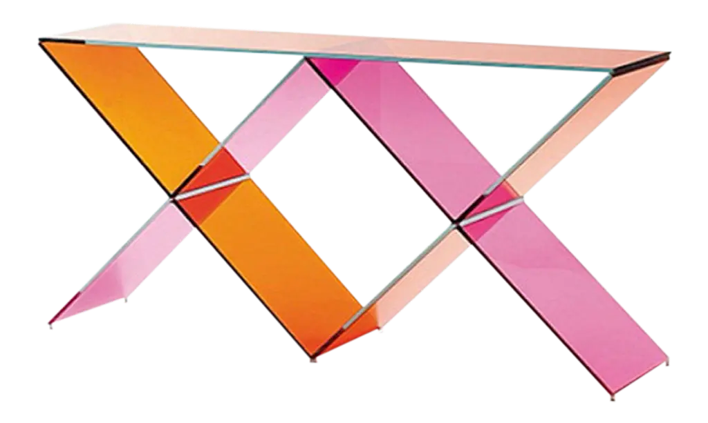XX console table is shown here in transparent pink and orange coloured glass. Console realized in transparent pink and orange coloured glass. The base composed of two Xs in tempered and laminated mm. 8+8 thick glass, with special chamfering and gluing, is embellished by metal polished chrome elements. The top, in laminated 8+8 mm. thick glass, leans on the base.Johanna Grawunder is a designer and architect based in Milan, Italy and San Francisco. Her works spans a broad range of projects and scales, from large-scale public installations, to architecture and interiors, to limited edition furniture and lights for various galleries in Europe and the USA. She also designs products for select companies including Flos, Boffi, and Glas Italia among others. Recent work includes private commissions for lights, furniture and interiors, as well as large-scale lighting installations. For the Freeport Singapore, she designed a permanent installation of “light ceilings” through out the building, as well as a unique light façade. And for Robert, in the Museum of Art and Design, NYC, she designed a total light ceiling covering the entire space. Her work has been shown and is included in many museum permanent collections, including LACMA, FNAC, San Francisco MOMA and the High Museum Atlanta. She worked with Sottsass Associati from 1985-2001, becoming a partner in 1989. At the Sottsass Studio she was involved primarily with architecture and interiors, co-designing with Ettore Sottsass, many of the firm’s most prestigious projects. In 2001 she left Sottsass Associati and opened her own studio in San Francisco and Milan. Graduating in 1984 from California Polytechnic State University in San Luis Obispo with a Bachelor of Architecture degree, she completed her final year of studies in Florence, Italy and in 1985 moved to Milan. She was born in 1961 in San Diego, California.Additional Information:-Dimensions: XX03; W 175 - D 40 - H 89 -Finishes: Transparent glass.Please note that the list price excludes VAT. An additional VAT charge may apply.