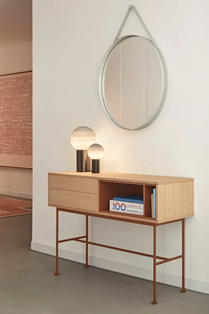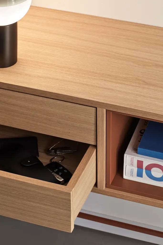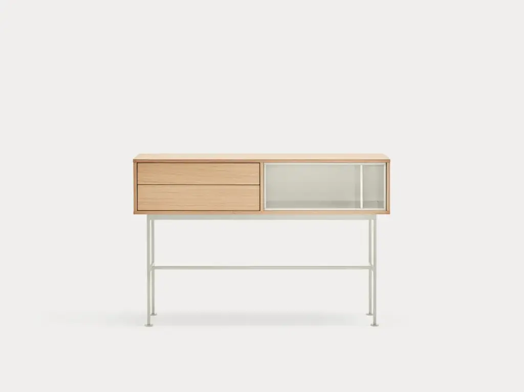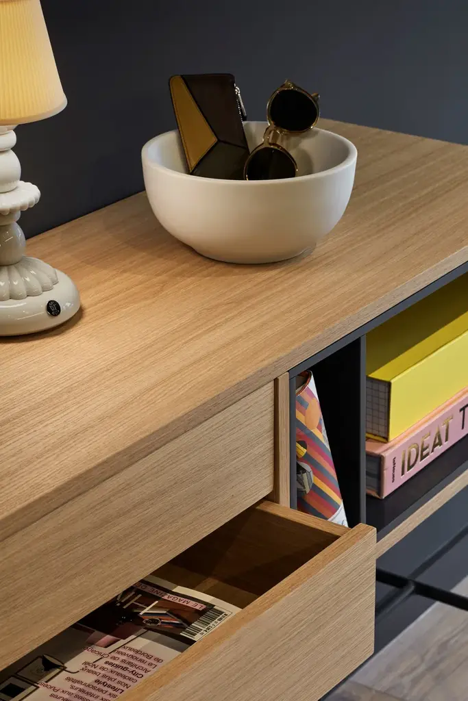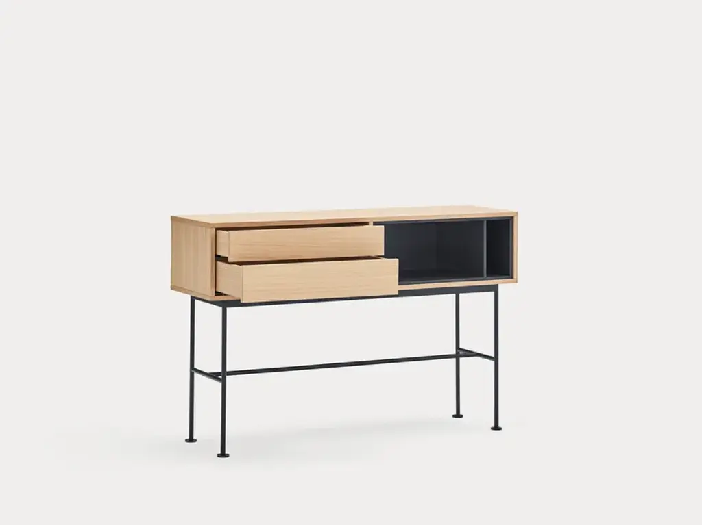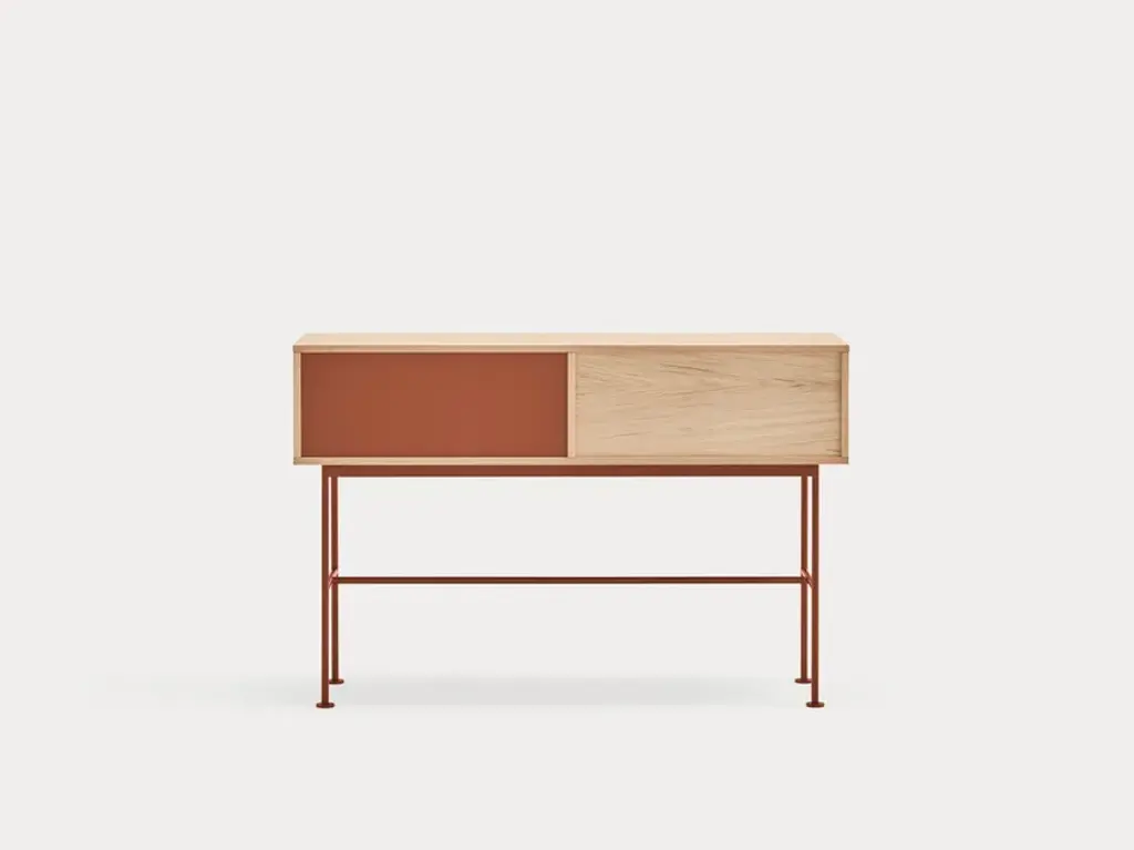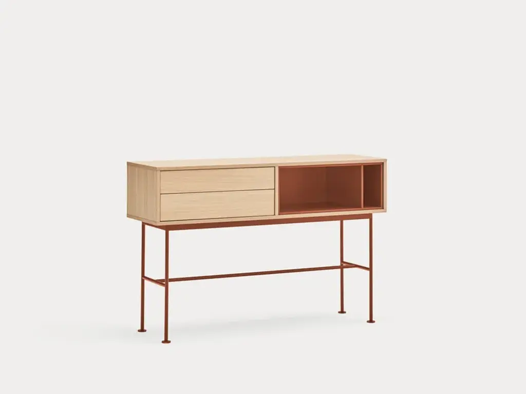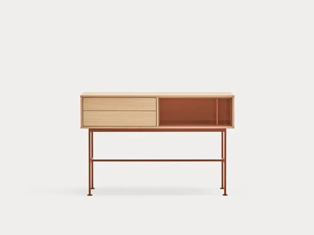 Yoko is an oak veneer console except for some fronts, which are lacquered MDF. The legs are metallic and lacquered with the same colour as the fronts.Yoko is a collection that aims, through its simplicity and versatility, to offer a modern furnishing solution suited to the needs of contemporary homes.Completely veneered in oak, Yoko combines the natural beauty of wood with color accents, making it perfect to fit into different environments.
