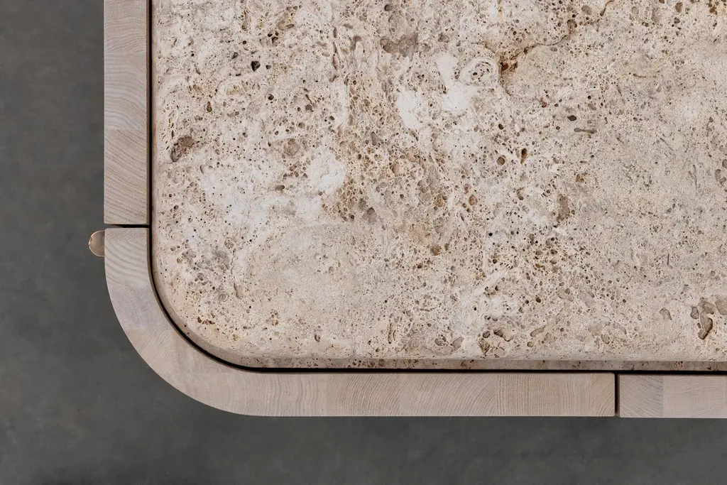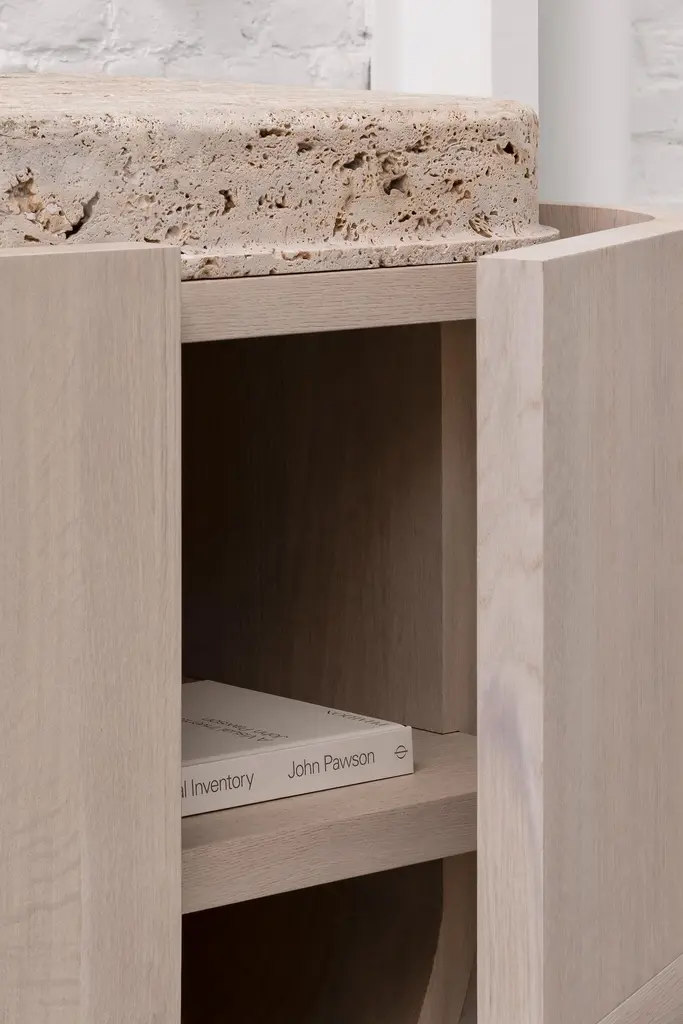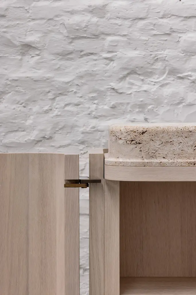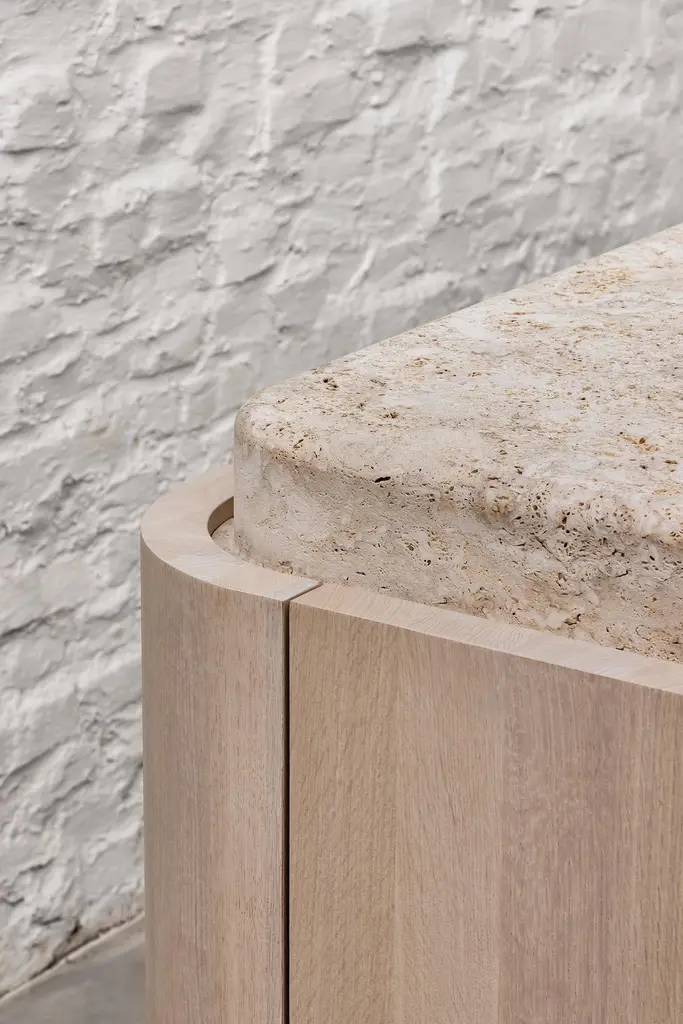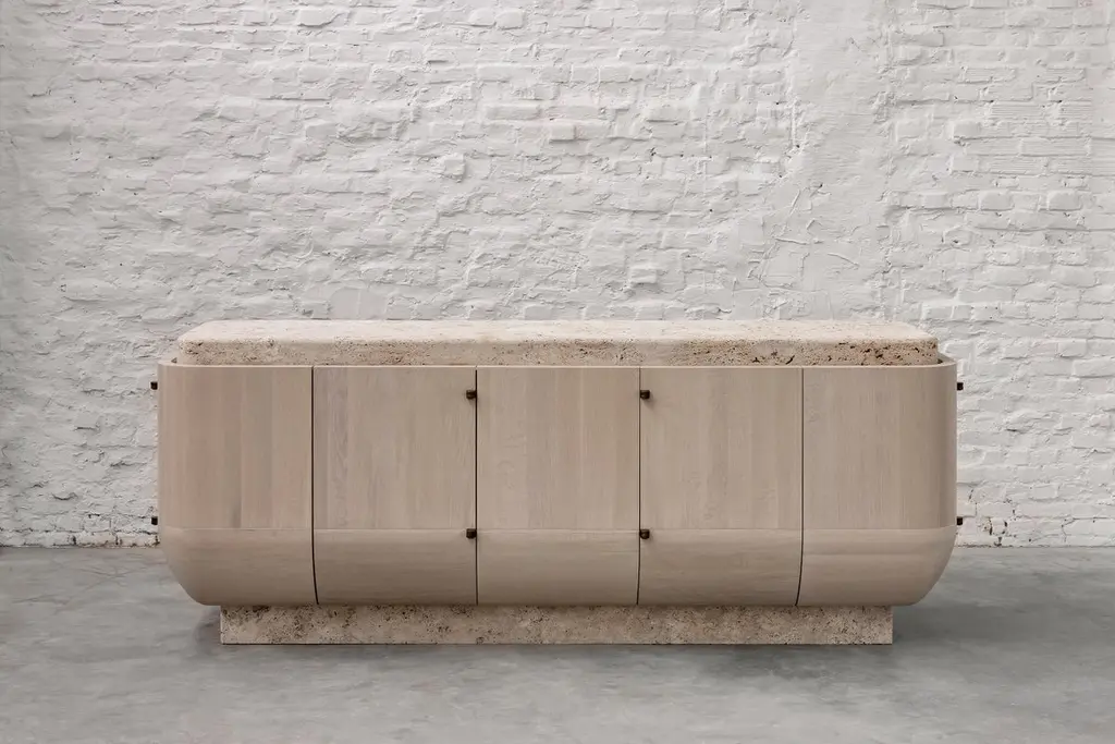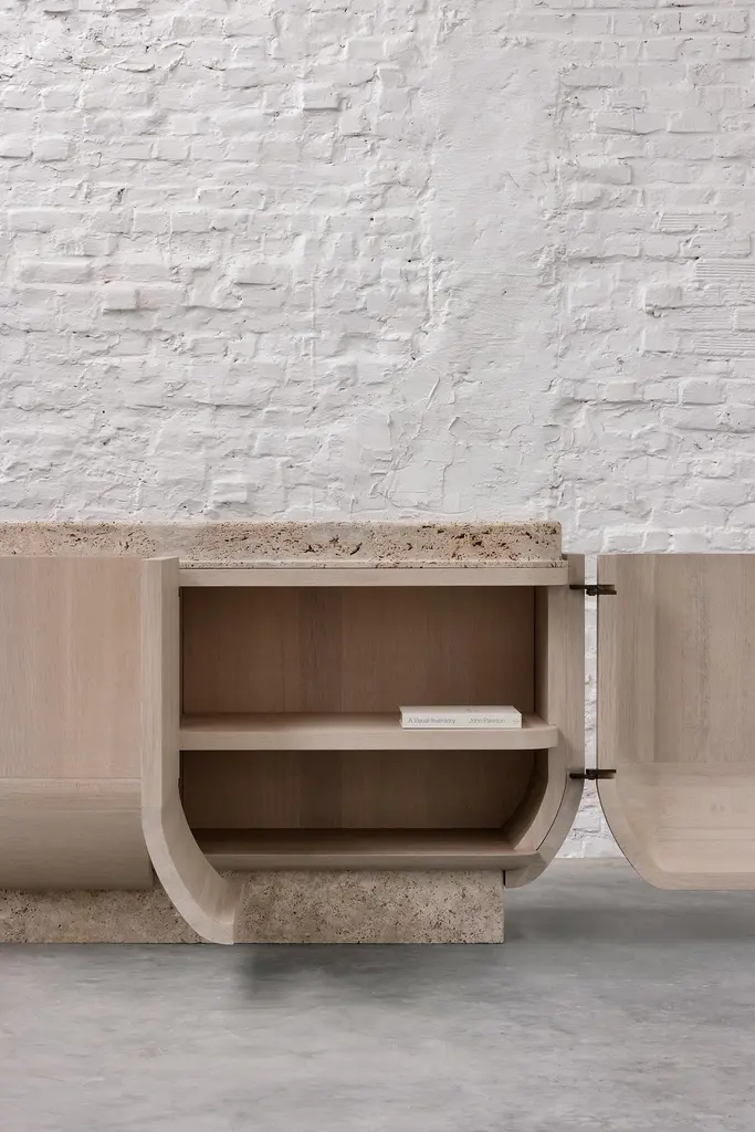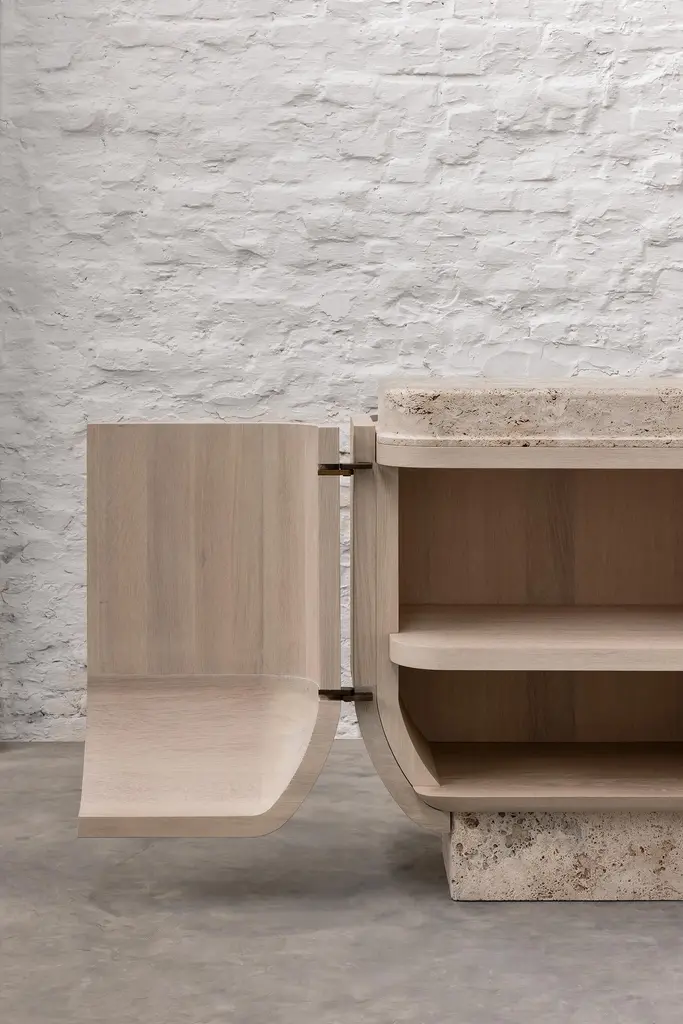Yoma Console by Andy Kerstens.Limited Edition of 20 Dimensions: W 255 x D 70 x H 100 cmMaterials: Wood bleached and brushed European oak, solid + veneerMetal solid brass with patinated bronze finish, Stone cross-cut open pore travertino silver,Weight: 810kgMore beige variant. The solid stone is a sandblasted, open pore, travertine and is untreated all visible wooden and metal parts are varnished by standard metal parts are processed of solid brass and treated with a bronze patina all wood comes from responsible resources and is stained to the bleached colour more hidden construction parts like screws and bolts are made from stainless steel.The elegant curves represented in fashion design, are reinterpreted in an abstract way. Soft lines are used to create a balanced and honest design, resulting in a monolithic centrepiece. By standard there are two double cupboards with pivoting doors, as well a drawer unit in the middle with one internal drawer. All accessible from one side. The body is completely crafted out of European oak and bleached to create a consistent ambiance with the travertine countertop and plinth. Rough, yet tactile brushed and sandblasted finishes of the surfaces result in a deeper emotion by the owner of the unique piece. Extra authentic details are created by wooden Craft connections and visible bronze pivots. The harmonious console is offered by standard in a certain Size and materialization.Kerstens was founded in 2015 and is based in Antwerp. Kerstens is a multidisciplinary design studio with a clear vision of architecture, interior design, and furniture design. The focus is on total projects in which an affinity for craftsmanship, detail, and atmosphere are essential. This applies both to the residential market and to catering and retail projects.Our vision on interior is to create an atmospheric quality within a refined architectural design language. We strive for simplicity, a timeless, minimal design combined with rich, natural materials for a warm and sober look. The atmosphere created by a dialogue between unique objects, intriguing art, and tactile materialization results in contrast to a larger architectural whole and leads to a deeper emotion. Craftsmanship and sustainability are inextricably linked and form the basis of a project. Our work exudes a certain serenity, resulting from a monochrome and timeless signature, combined with a touch of understated luxury.Each assignment is unique and analyzed extensively to obtain a balanced basis for the concept and its further elaboration. Research into the program, use, context, layout and proportion, light and space, materialization, and budget are an important part of the process. A project is a combination of wishes, ideas, and designs in which we work in a detailed manner and on various scales. The interior is the extension of our senses and actions and is central to daily life. The personal interpretation and perception of the user, therefore, form a guideline throughout our process. Designing the smallest details is crucial to achieving a total design, whereby the mutual relationship of all elements is enhanced by one IDEA, concept, and design.Andy Kerstens graduated in 2015 as a Master of Science in Interior Architecture (cum laude) at the University of Antwerp. With the preparatory trajectory, in 2013 he obtained his Bachelor of Arts in Interior Design at the Thomas More College in Mechelen. Freelance interior designer at Dieter Vander Velpen Architects and previoulsy at De Meester Vliegen Architects.