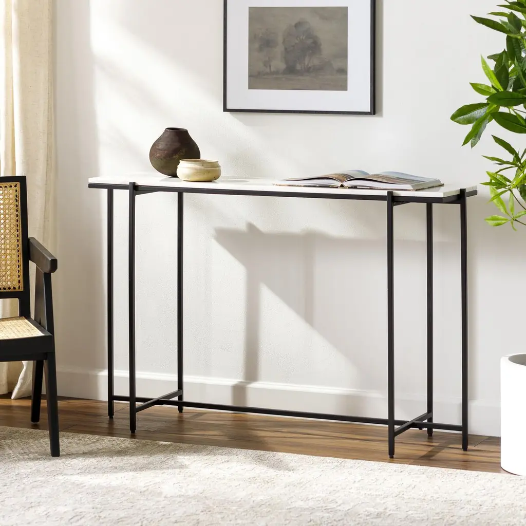 Introducing the Zarina Console Table, a striking addition to any space that values both functionality and style. Inspired by mid-century modern design, this stunning piece is sure to be an instant conversation starter. The table's solid marble top exudes a sense of sophistication and luxury, while the durable metal base ensures stability and long-lasting use. Manufactured in India, this console table perfectly marries aesthetics with practicality. It is easy to maintain too; simply wipe clean with a dry cloth and avoid harsh cleaners to preserve its gorgeous finish. From hallways to living rooms, make a statement with the chic and elegant Zarina Console Table.