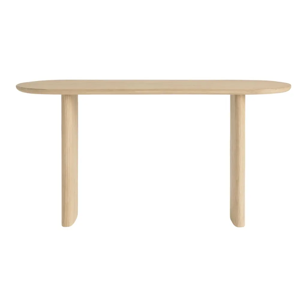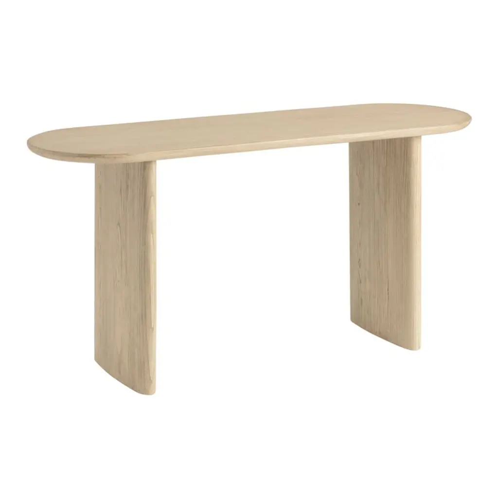 The sleek, minimalist silhouette of our Zeke console table is made of wire-brushed wood with an oval surface balanced atop a slender pair of curved leg posts. The wire brushing brings out the warm natural grain of the wood, displaying its unadorned rustic beauty. A family-friendly living room or foyer table with gentle curves and no sharp edges, this modern piece blends into any setting.