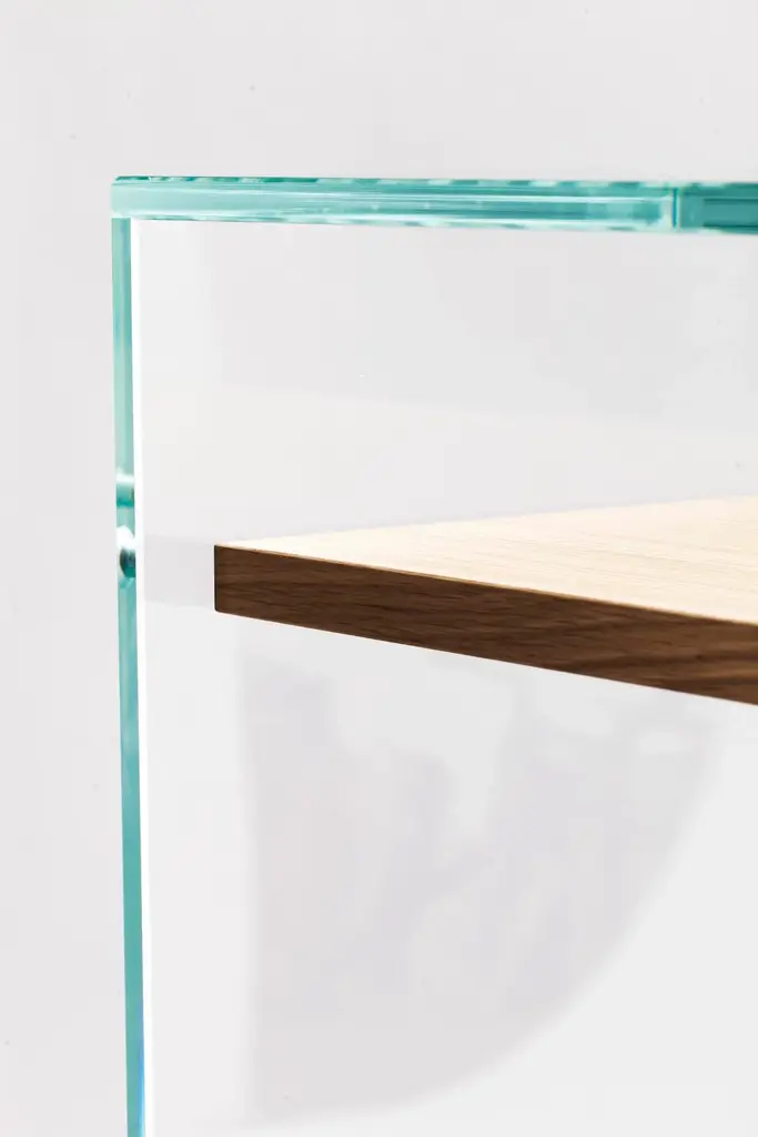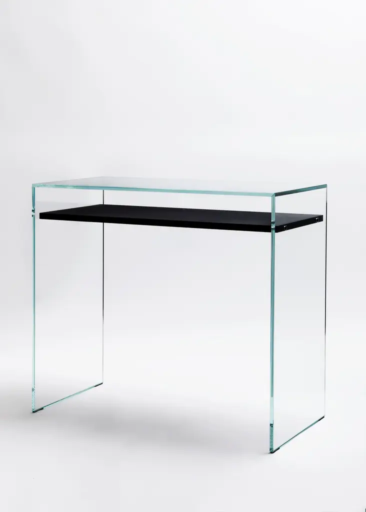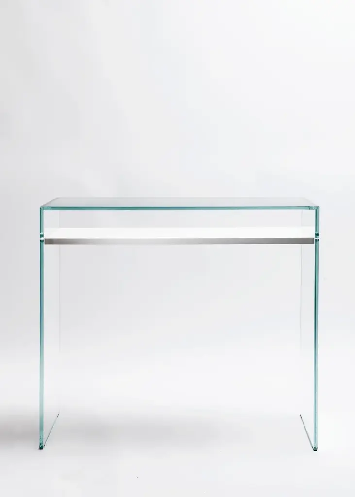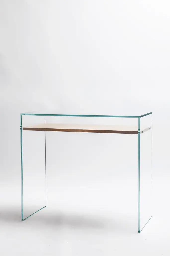 This console table from the ZEN collection is made of extra-clear tempered glass. It has three choices of finish: oak veneer and stained grey Wenge, clear with an oak veneer tray, and white matte-lacquered. The table is also available with an extra clear glass bottom plate. Labeled by Maker Labeled by Maker,Labeled by Maker