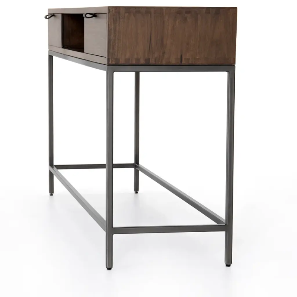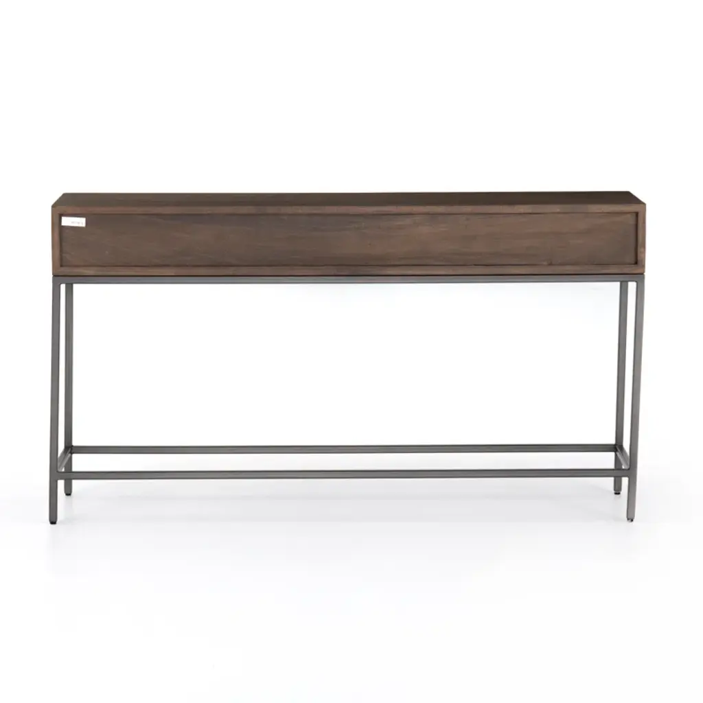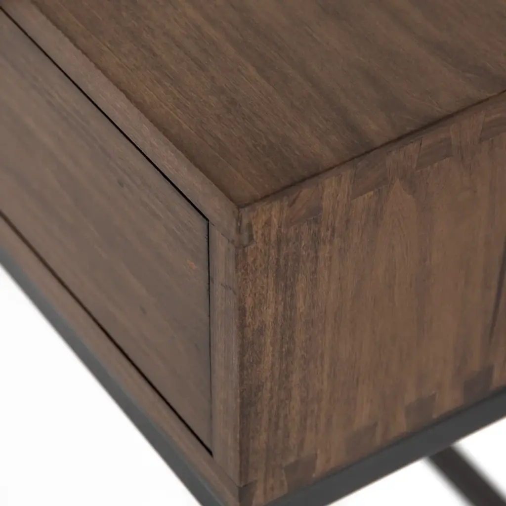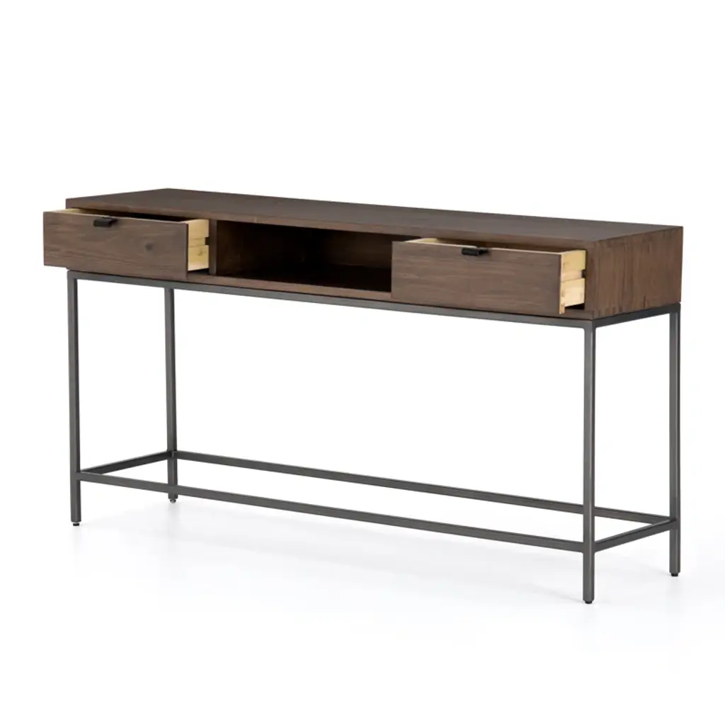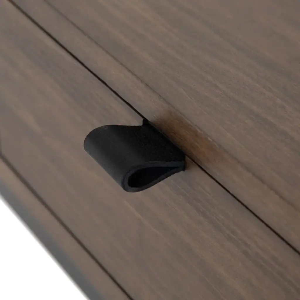 Inspired by a clean midcentury design, solid poplar offers media storage and more by way of a center cubby and dual-side drawers. Metal-secured top-grain leather pulls add a textural element of surprise