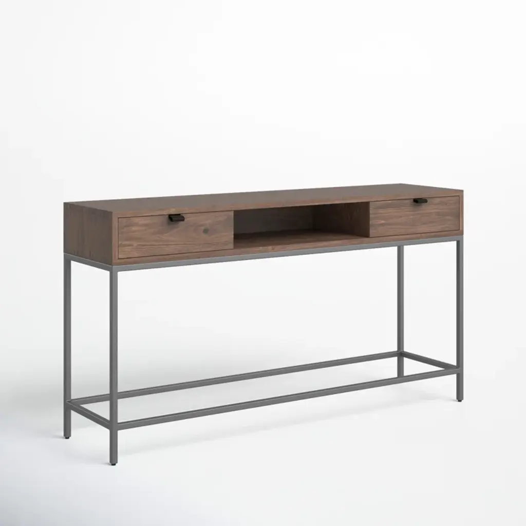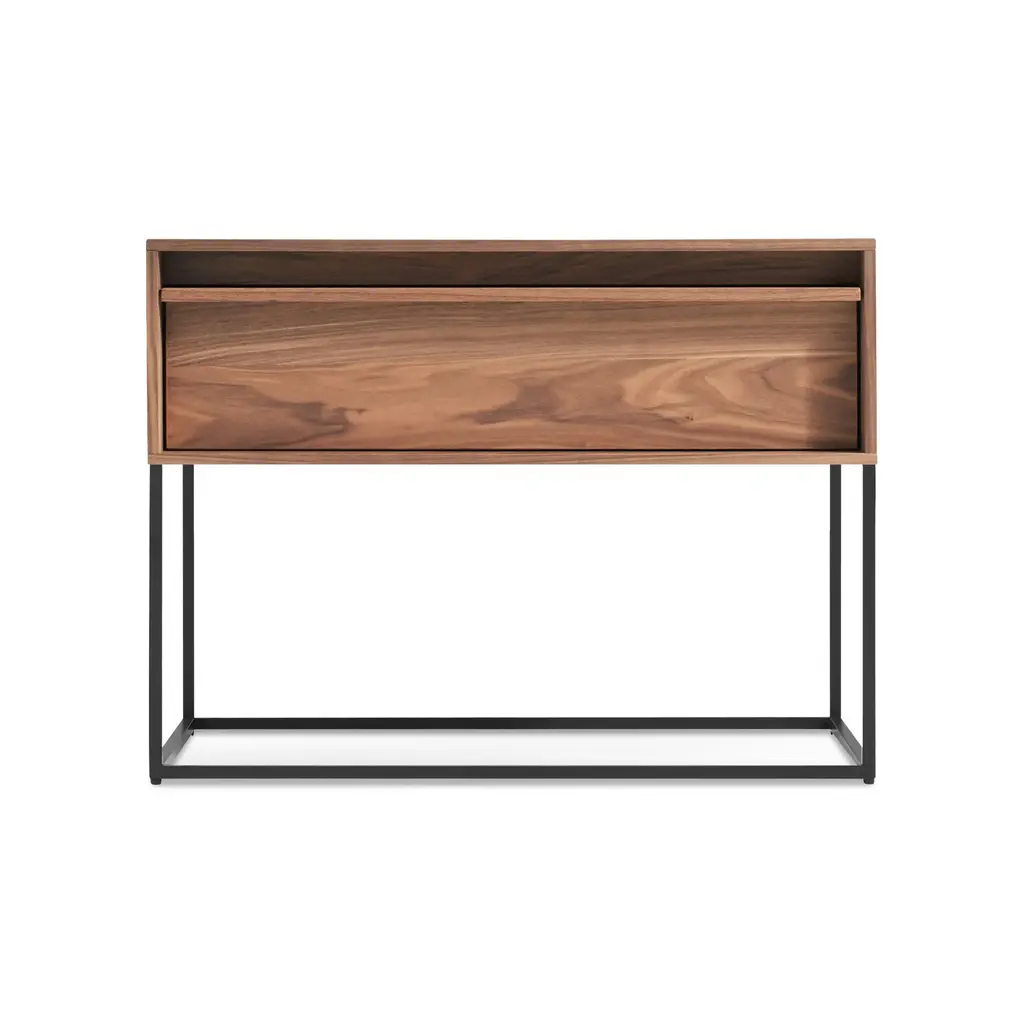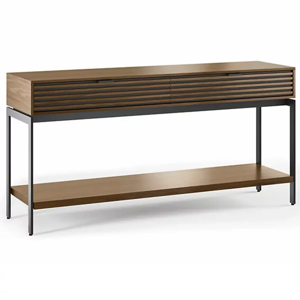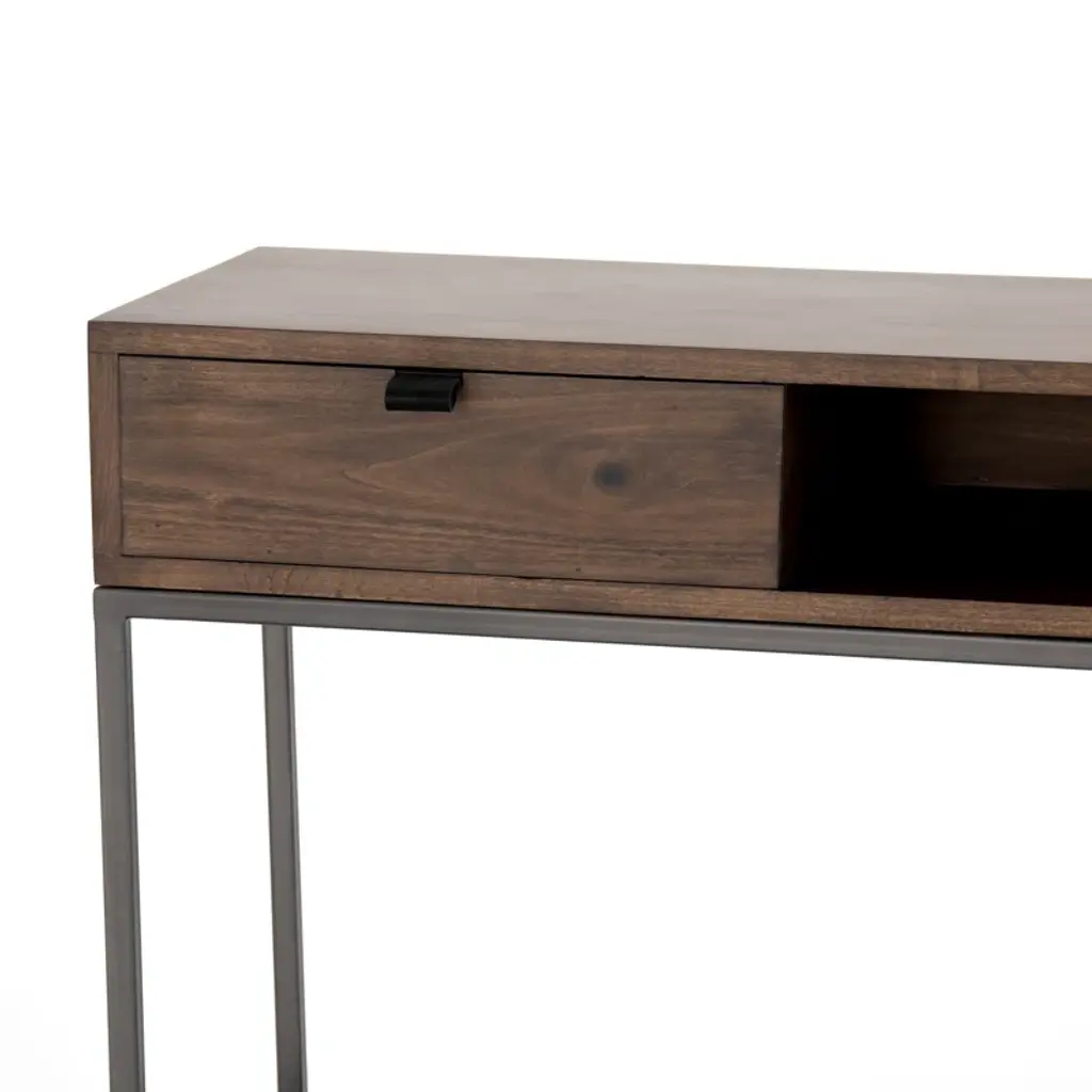 Inspired by a clean midcentury design, solid poplar offers media storage and more by way of a center cubby and dual-side drawers. Metal-secured top-grain leather pulls add a textural element of surprise
