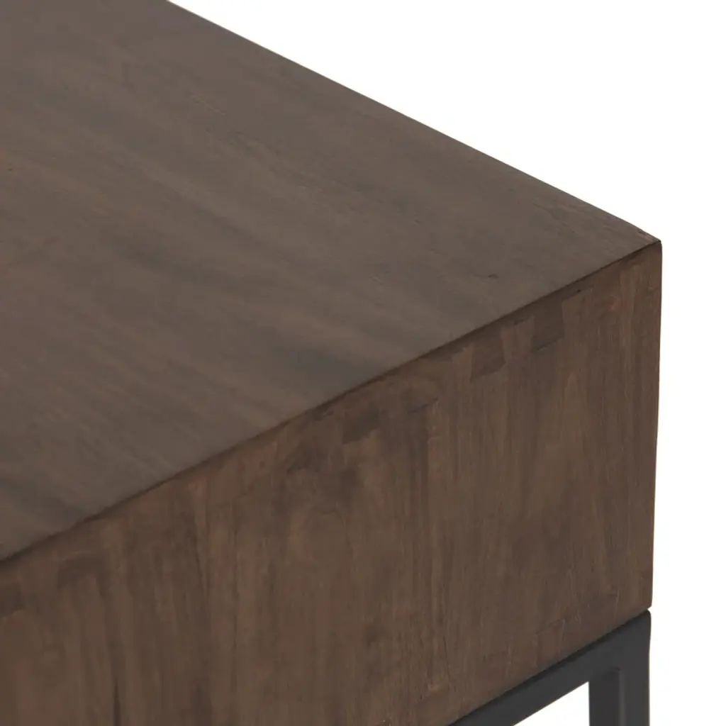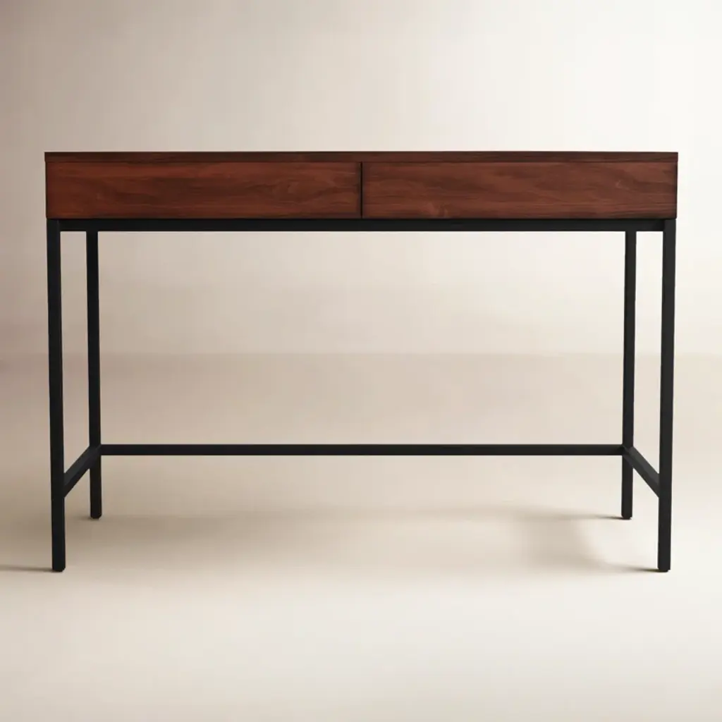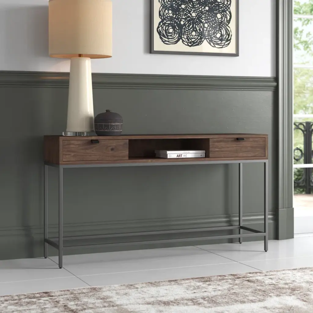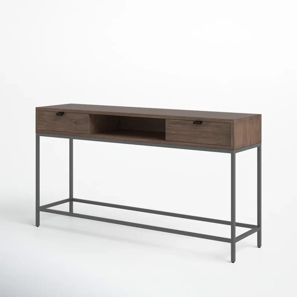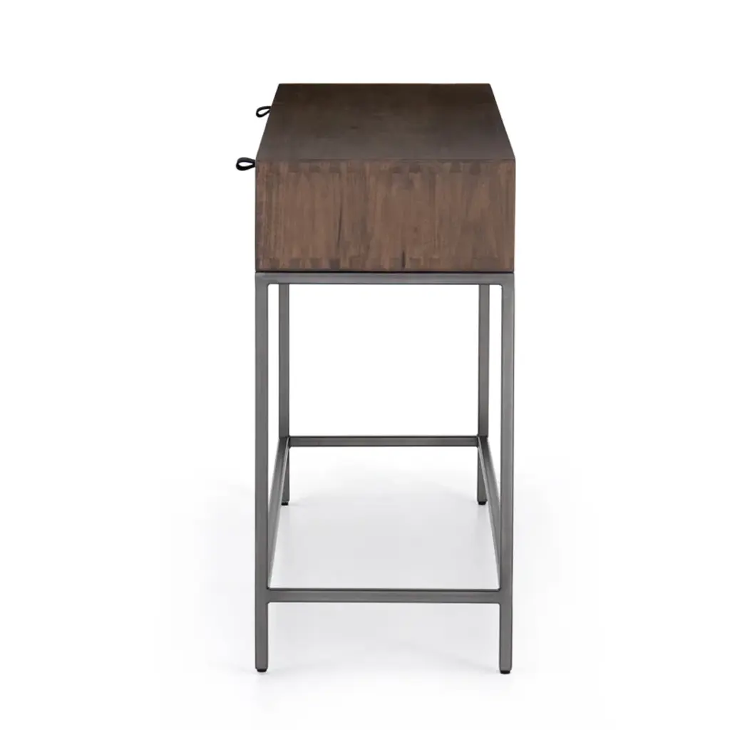 Inspired by a clean midcentury design, solid poplar offers media storage and more by way of a center cubby and dual-side drawers. Metal-secured top-grain leather pulls add a textural element of surprise
