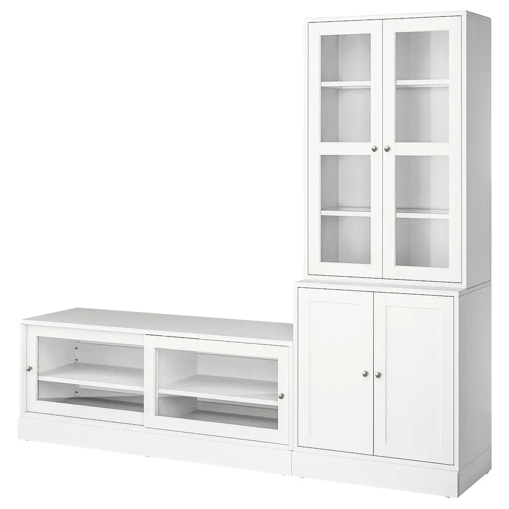 BESTÅ Storage combination with doors - white/Ostvik/Kabbarp white clear glass 70 7/8x16 1/2x29 7/8 ". Doors both protect and decorate - choose a door that matches well with your home and storage combination. Adjustable shelves, so you can customize your storage as needed.