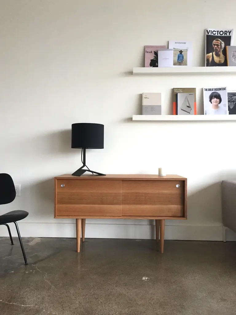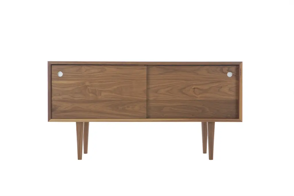 Modeled after the design of our Classic Credenza, this space efficient piece is two-thirds the size of the original. And yet, this Credenza still makes room for all the essentials – electronic equipment, books, clothes, dishes, art supplies, or anything else you see fit. With all the perks of our standard credenza, like the interior adjustable shelves and wire management portals allowing for unlimited configurations, our small Credenza still offers all the media-ready features you need. Reinforced mitered joinery and two solid wood doors are grain matched, rolling open effortlessly with smooth sliding hardware. The Classic Credenza Small is handcrafted from locally harvested, solid wood and finished with a durable, non-toxic finish. Made in Minnesota.