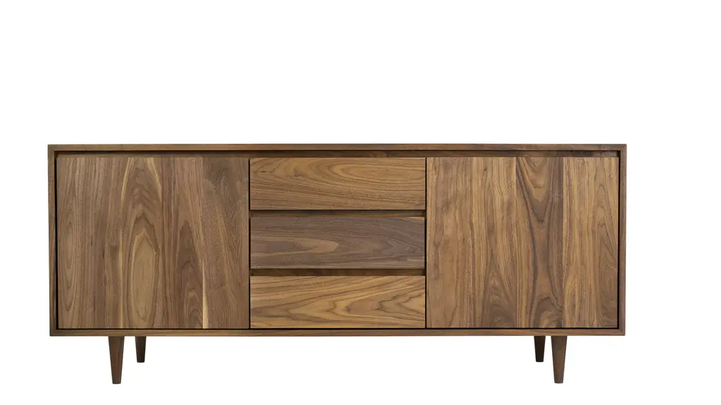 Offering an alternate storage configuration to the original design, the Classic Credenza With Drawers achieves the same sophisticated mid-century aesthetic with ease. The addition of three soft close drawers are encased by the same locally harvested solid wood grain and strengthened by reinforced mitered joints. Not compromising on storage capabilities, we’ve kept the adjustable shelving and wire management portals so this piece can be used as easily as a dining sideboard as it can an entertainment center. Finished with a durable, non-toxic finish, you can even set a drink on this timeless beauty without hesitation or worry. Made in Minnesota.