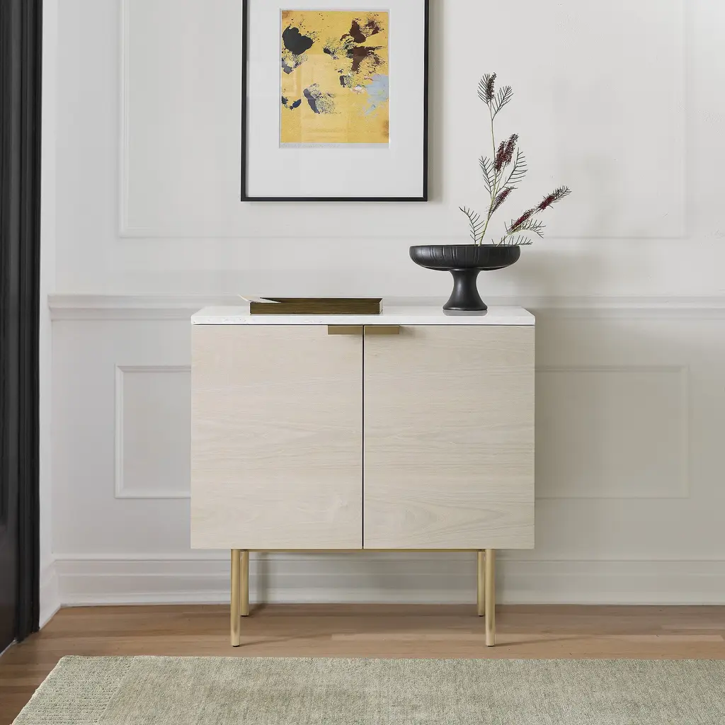 Designed with a sleek marble top. Perfect for an entryway or to hold cocktail essentials. Two cabinets offer plenty of storage space. Contract Grade, so you know it's built to last.