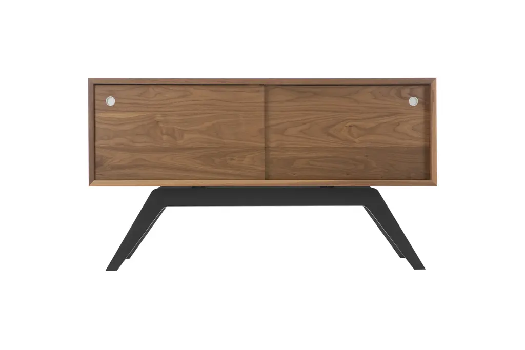 While designed for a more compact space, the Elko Credenza Small delivers enough storage capacity for your media equipment, books, clothes, dishes or whatever else you’d like to conceal. Like it’s slightly larger predecessor, the Elko Credenza Small begins with your choice of six colors, powder coated on the steel base, and complemented by the warmth of several solid wood cabinet choices. Reinforced mitered joinery and two, grain-matched wood doors roll open effortlessly, revealing two adjustable shelves and wire management portals that allow for numerous media configurations. All finished with a durable, non-toxic finish, the Elko Credenza Small is a perfect fit for your office or living space, no matter what size. Made in Minnesota.