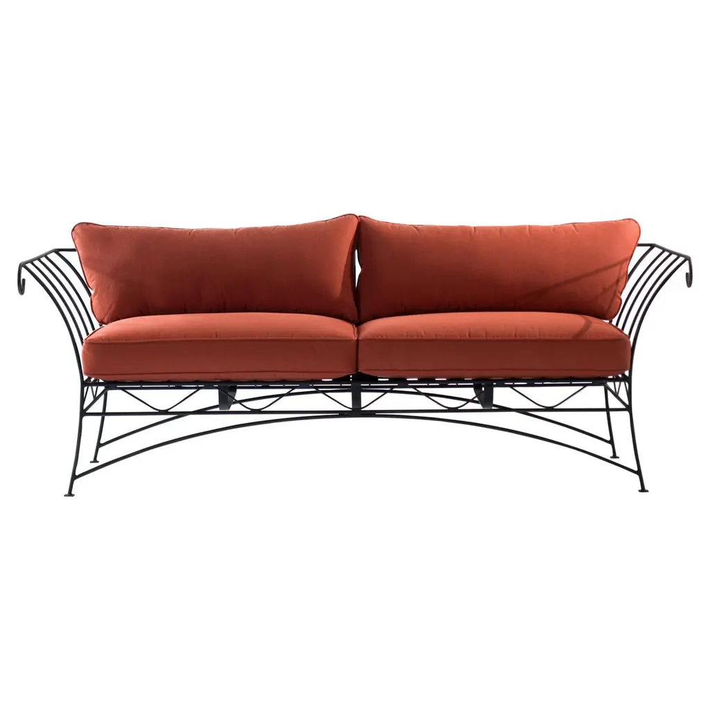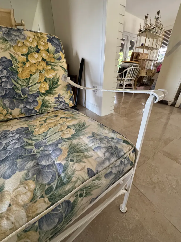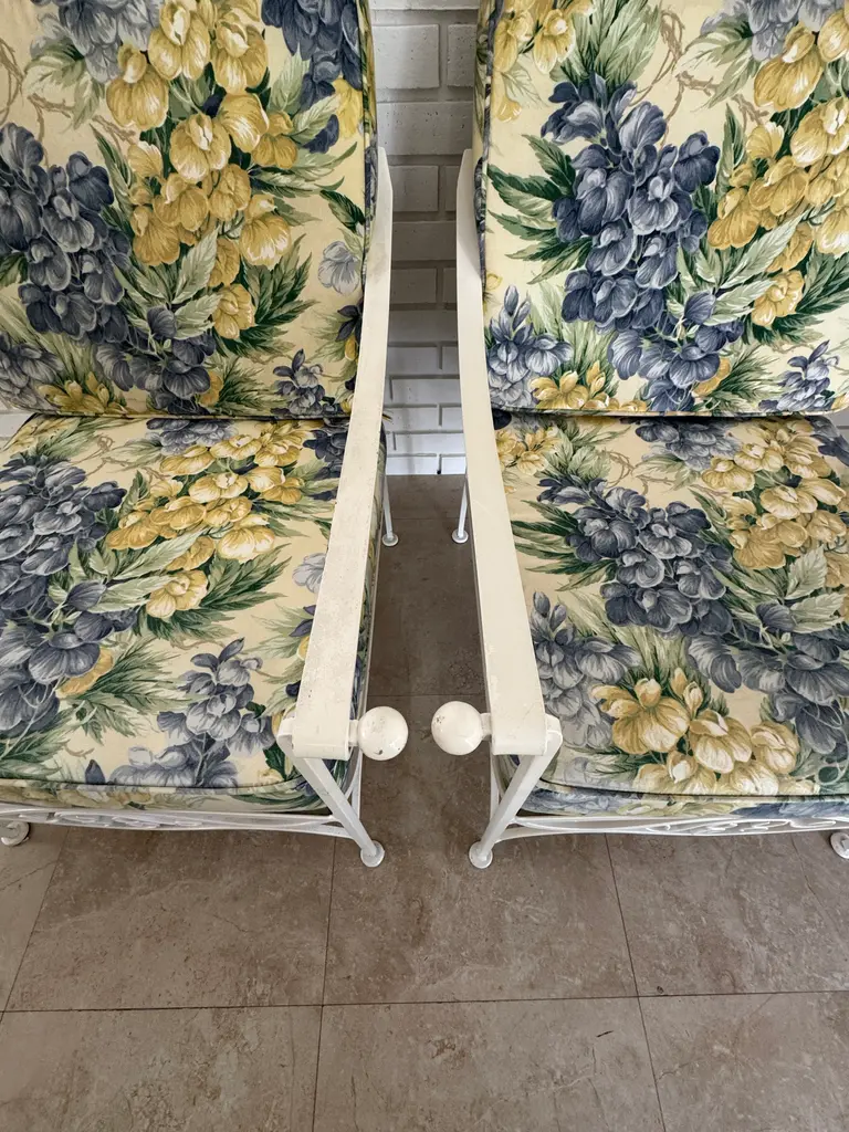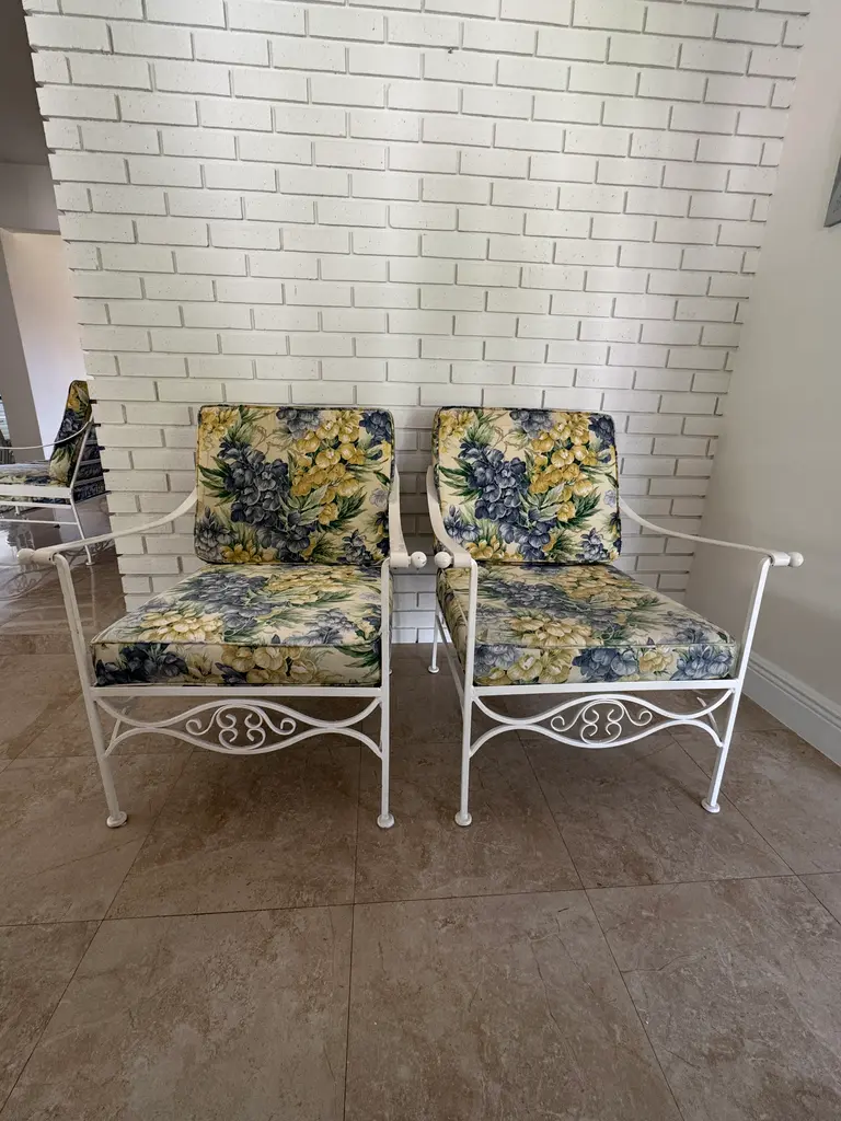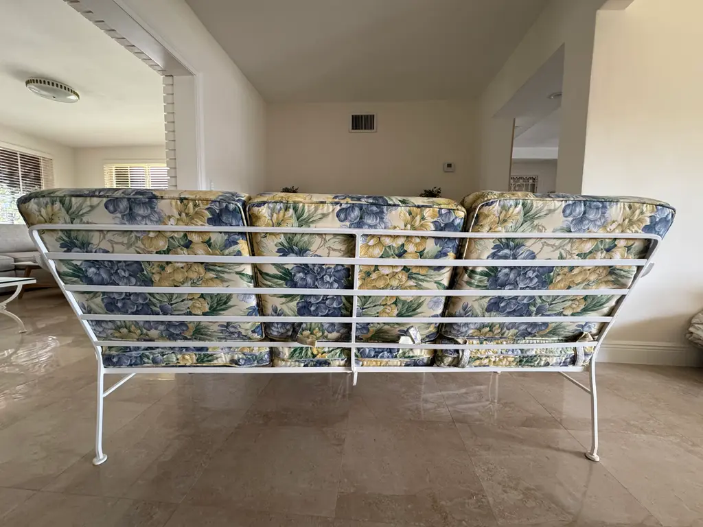 Bring timeless Palm Beach Regency style to your outdoor living space with this elegant wrought iron patio set. Featuring a classic white finish and graceful scrolling details, the set includes a spacious sofa and two matching armchairs. The sturdy wrought iron frames ensure durability while maintaining a light, airy silhouette, perfect for both covered patios and garden seating areas. This vintage set exudes resort glamour with its refined lines and versatile design, easily pairing with bright cushions or bold prints to complete the Palm Beach look. Ideal for entertaining or relaxing, it offers both sophistication and comfort in a chic mid-century style. Sofa measures 72" wide, 33" deep, 34" tall, 20" seat depth, 67" seat width, 18" seat height. Chairs measure 28.5" wide, 30" deep, 34" tall, 22" seat width, 20' seat depth, 17" seat height. This is a vintage item, it is in very good vintage condition. Some wear and tear expected with age and use. See pictures for details. This set was once black but was professionally painted white. There are some chips to the paint as seen in the pictures. The cushions were reupholstered 6 years ago.