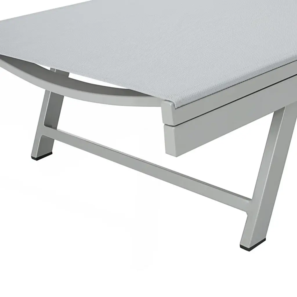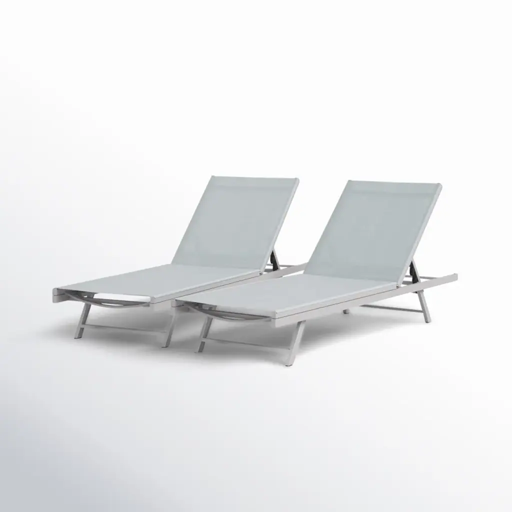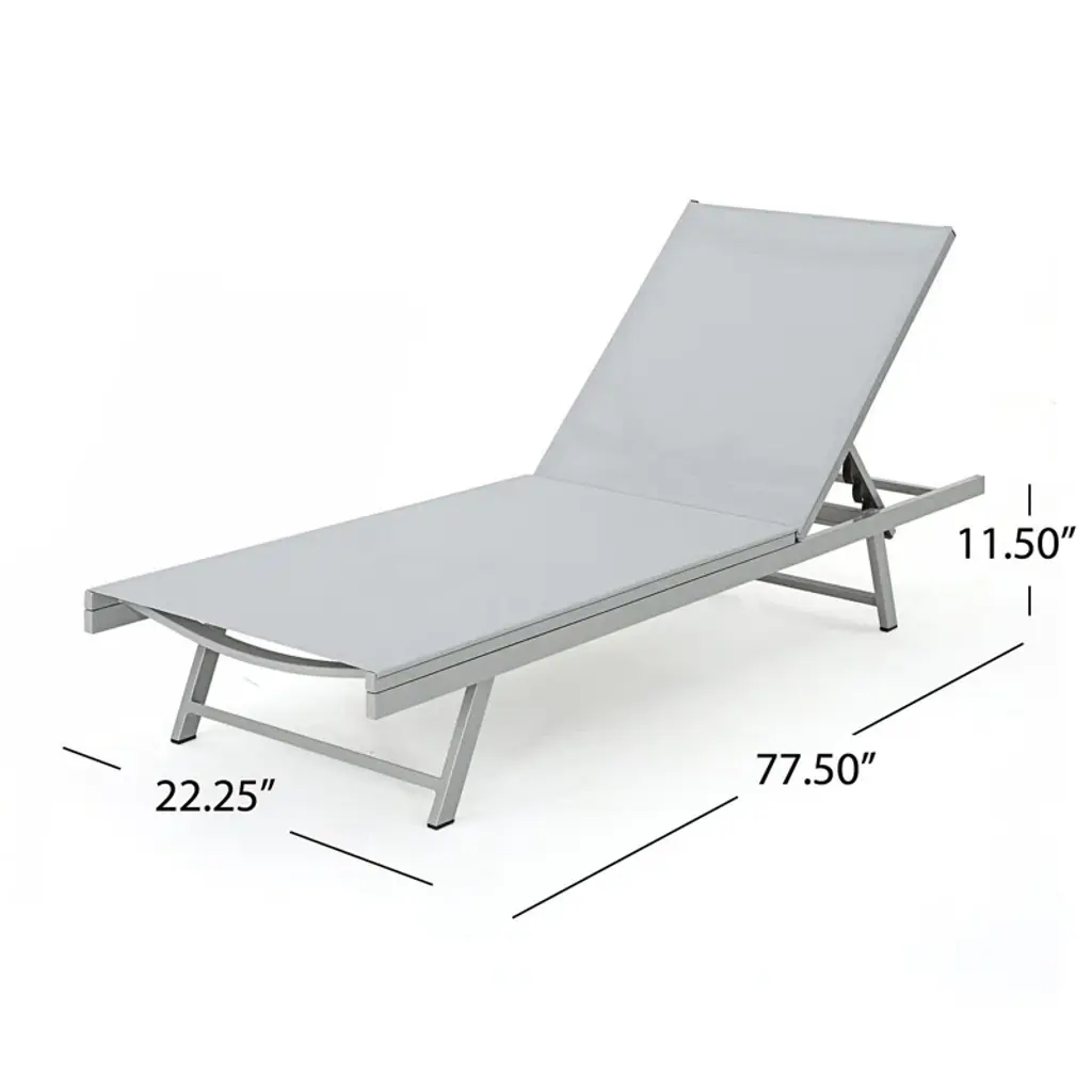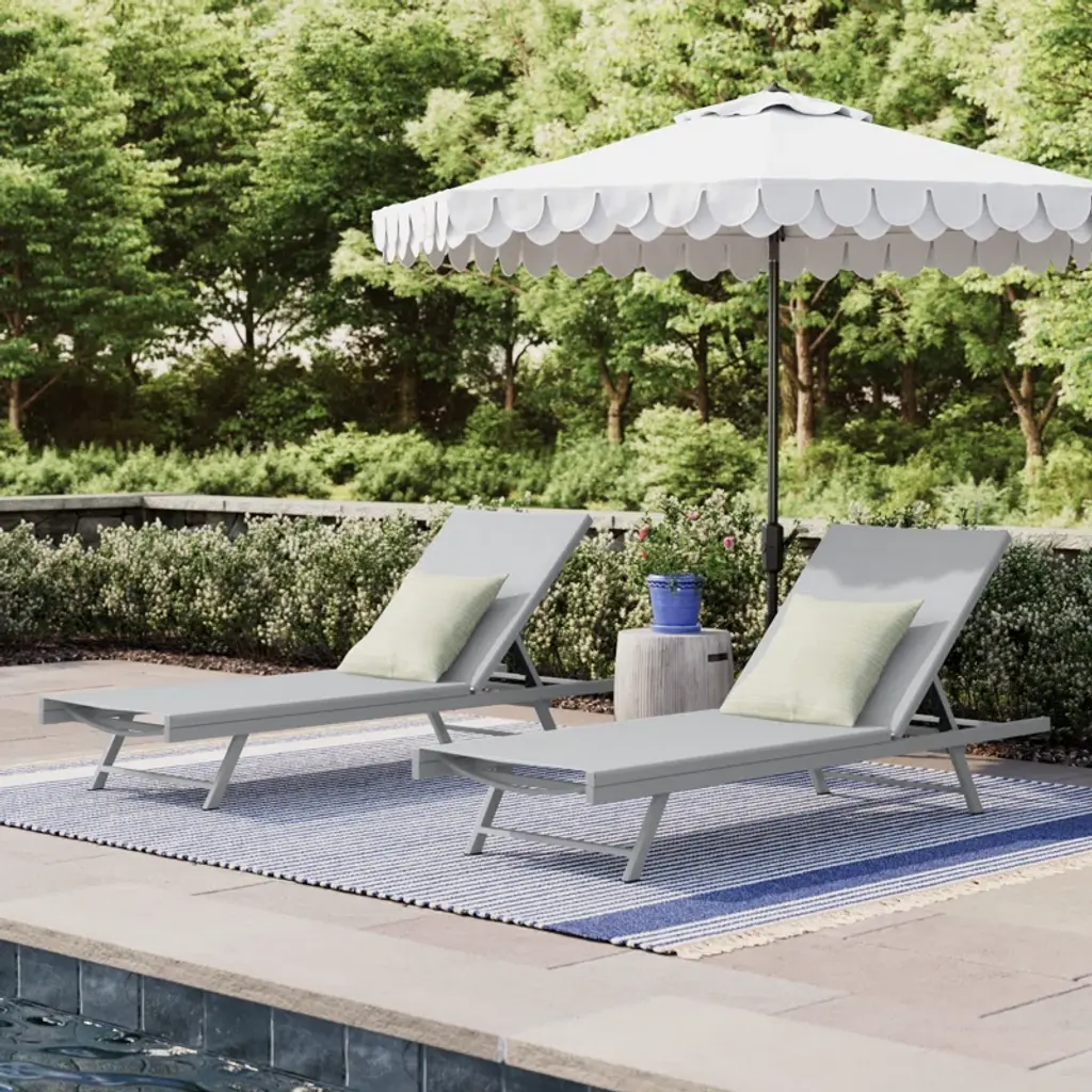 Bring streamlined, contemporary style to your patio or porch with this two-piece chaise lounge set. Crafted of aluminum in a matte gray or black finish, each chaise features a clean-lined frame on four flared legs. Gray or black mesh fabric lines each sling-style seat for quick drying and comfort, while a seven-position recline lets you kick back in style.