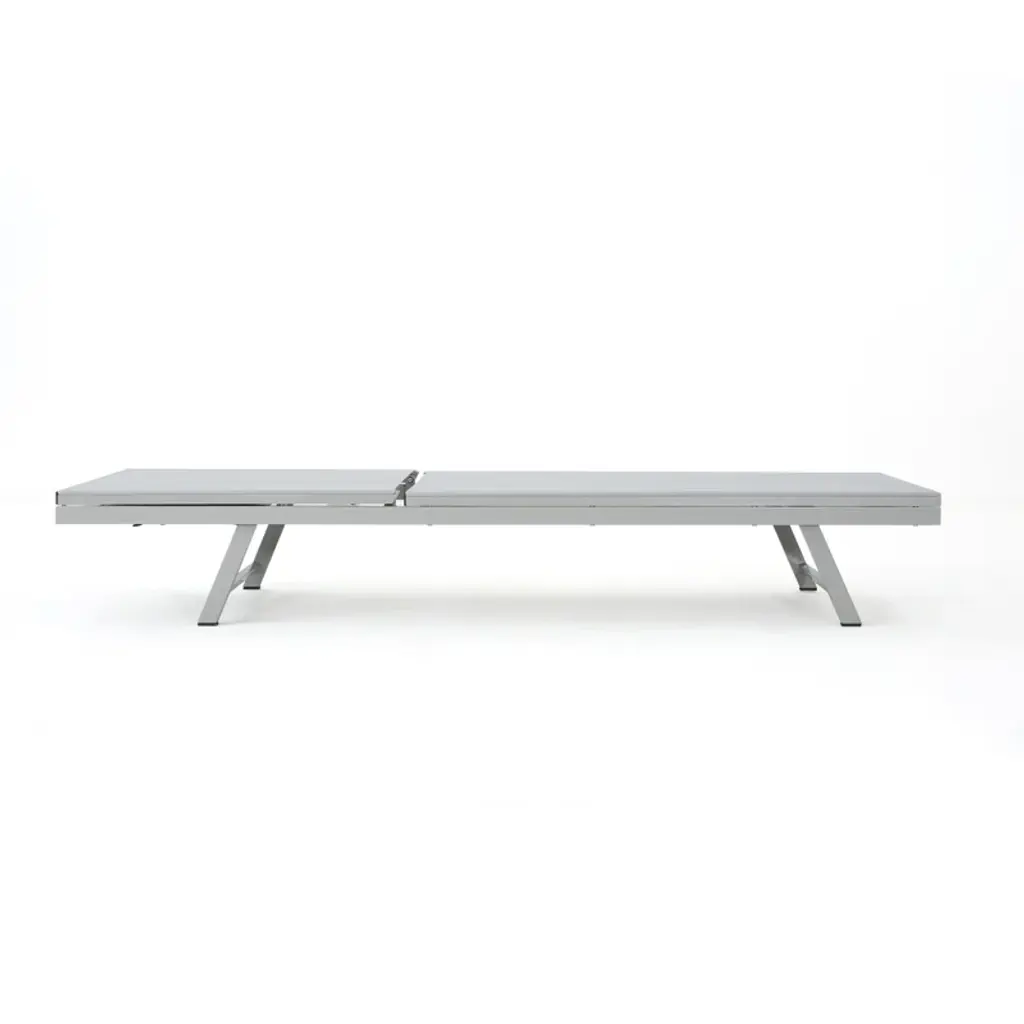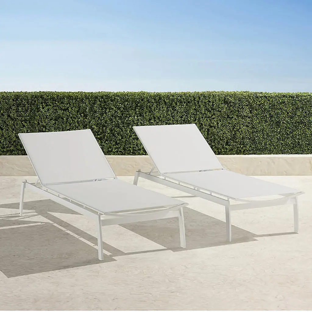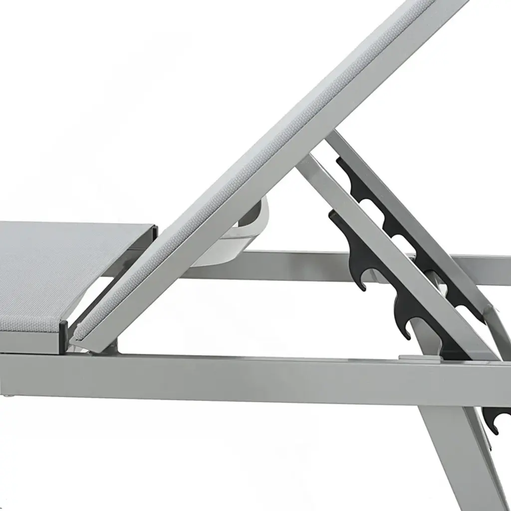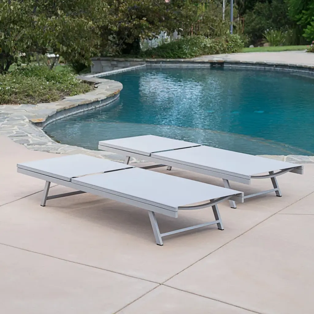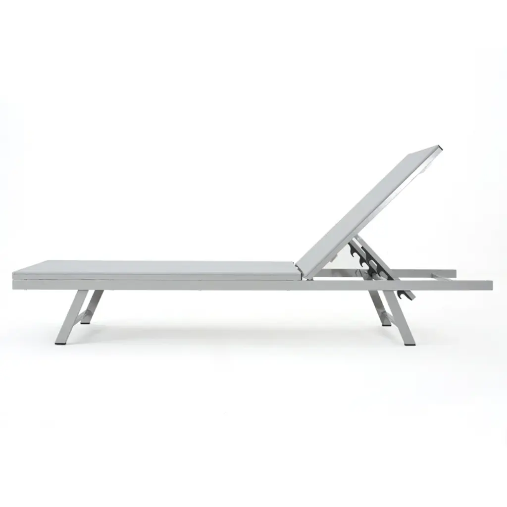 Bring streamlined, contemporary style to your patio or porch with this two-piece chaise lounge set. Crafted of aluminum in a matte gray or black finish, each chaise features a clean-lined frame on four flared legs. Gray or black mesh fabric lines each sling-style seat for quick drying and comfort, while a seven-position recline lets you kick back in style.