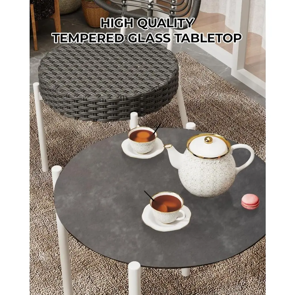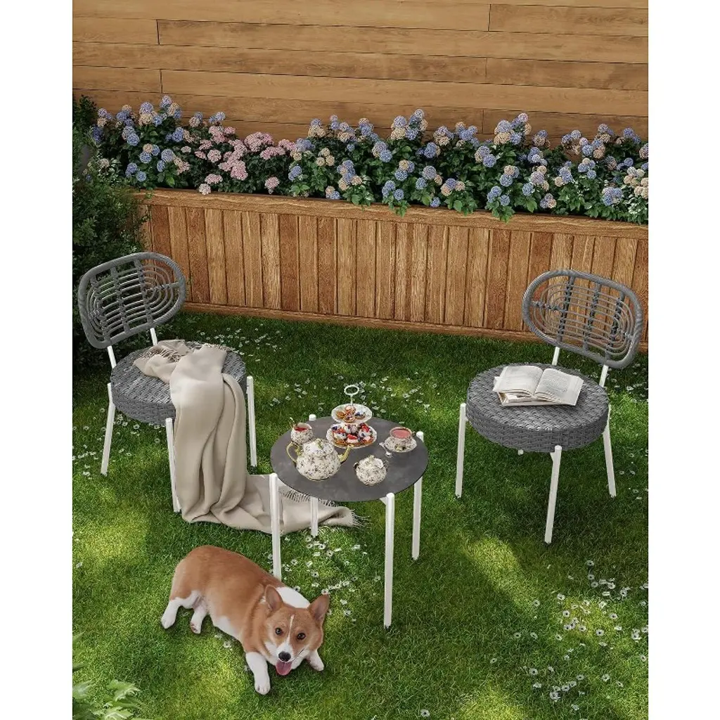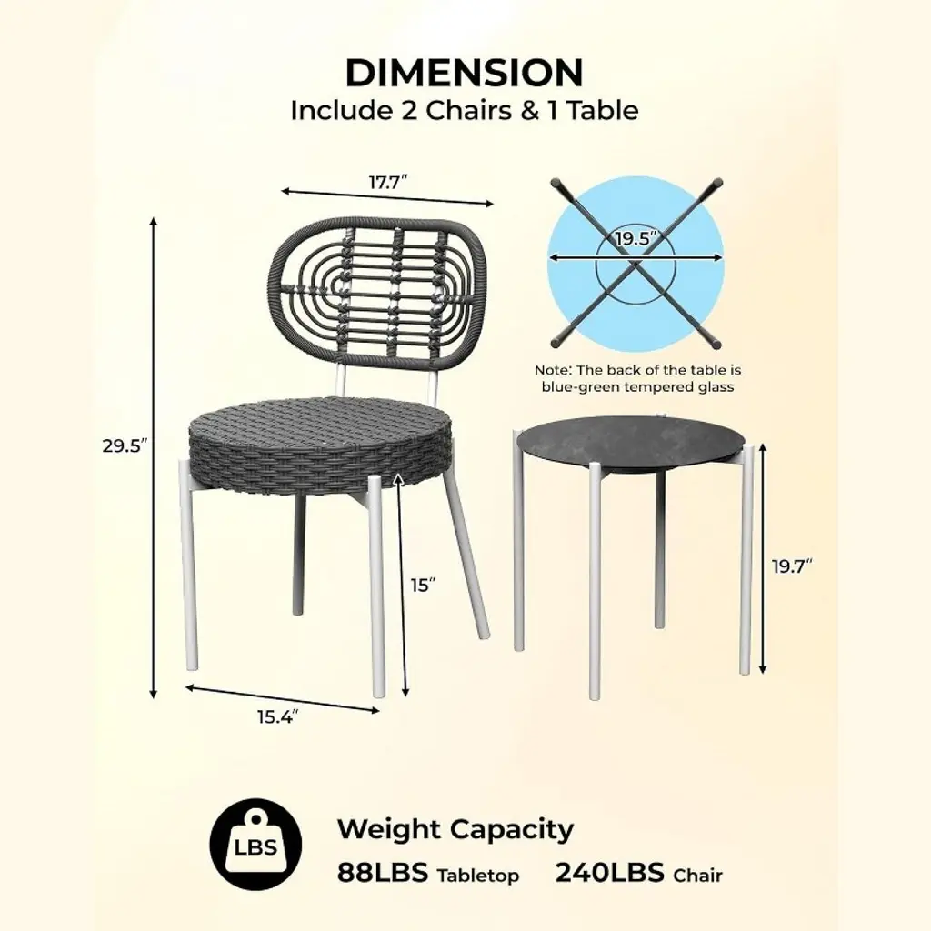 This outdoor bistro set includes 2 wicker chairs and 1 matching coffee table—perfect for creating a cozy seating area on your patio, balcony, or garden. Its compact footprint makes it ideal for small spaces without sacrificing comfort or style.