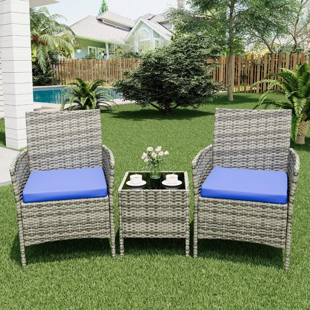 This 3-piece patio set is designed for the outdoors, combining UV-resistant PE rattan with rust-resistant powder-coated iron frames to withstand wind, rain, and hot weather. The tightly woven rattan resists wet and fading, and reinforced seams prevent loosening.Besides, the wicker chairs' backrest feature an ergonomic design that reduces lower back fatigue during long periods of rest. The high density foam cushion is soft and comfortable, and retains its shape after repeated use, bringing you more comfortable experience.