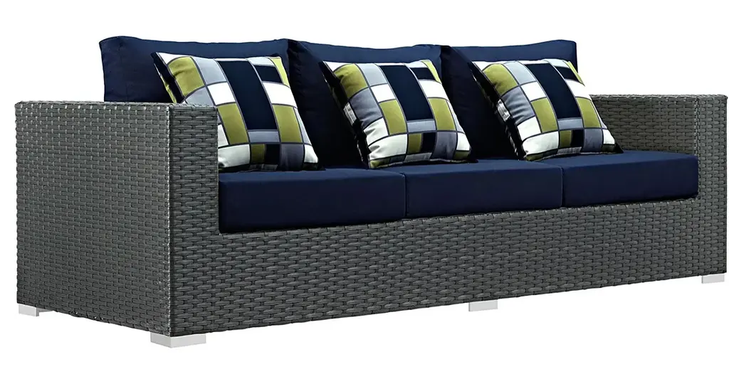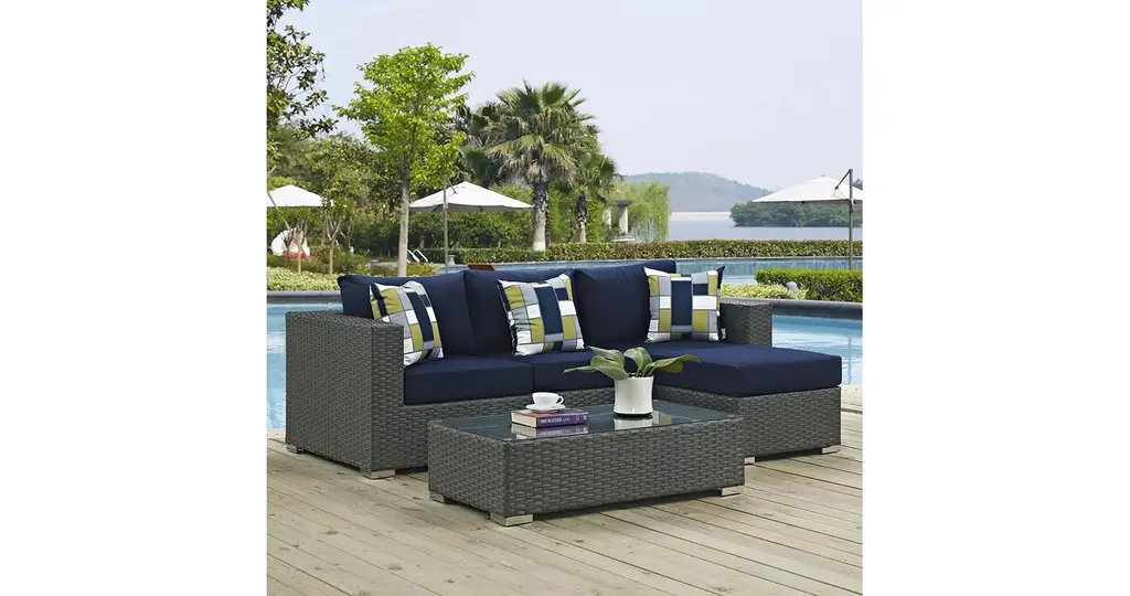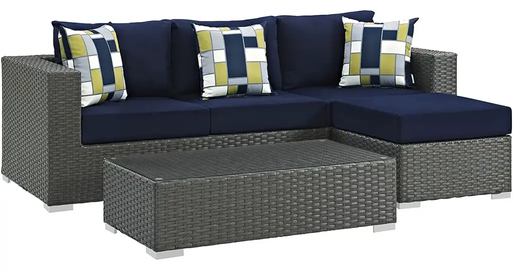 PATIO REFRESH - Update your backyard or porch with inviting outdoor furniture. Effortlessly accommodate the needs of your outdoor space with patio furniture that's great for entertaining and relaxingWEATHER-RESISTANT - Featuring a powder-coated aluminum frame, this modern outdoor patio furniture set comes with a chocolate brown synthetic rattan weave, with UV protection for years of outdoor useCONTEMPORARY STYLE - Clean lines, squared corners, and a sleek profile enhance the modern look of this patio sofa set. The modular collection opens up endless configurations to suit many occasionsSUNBRELLA FABRIC - Indulge in good weather while enjoying industry-leading support. Stain, fade and water resistant, the 5" thick cushion comes with a Sunbrella fabric cover that is machine washablePATIO SET - Set Includes: 1 Coffee Table, 1 Sofa, 1 Ottoman, 3 Pillows