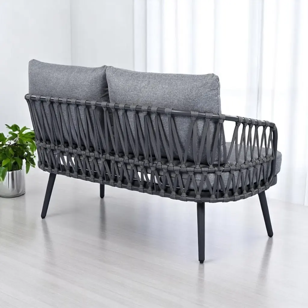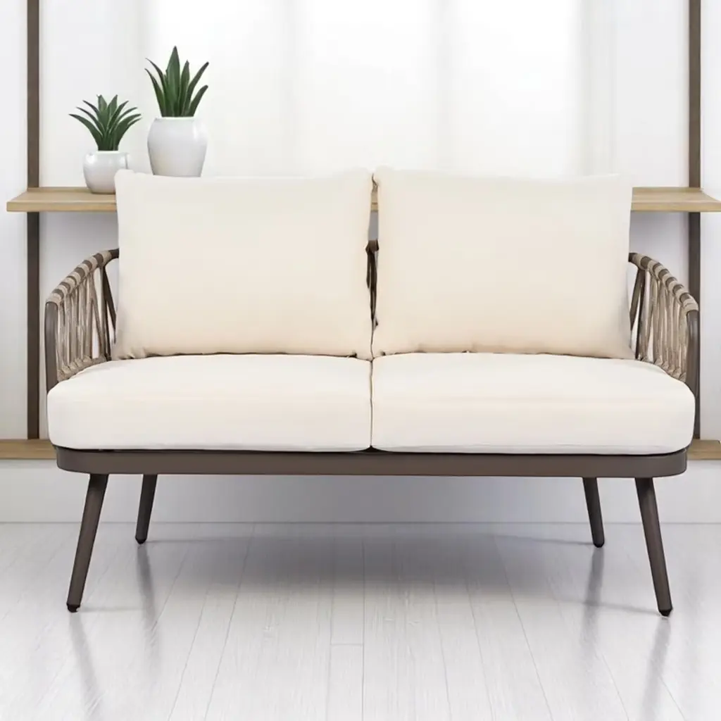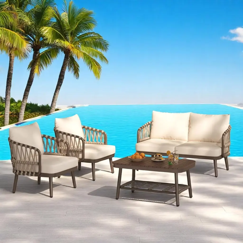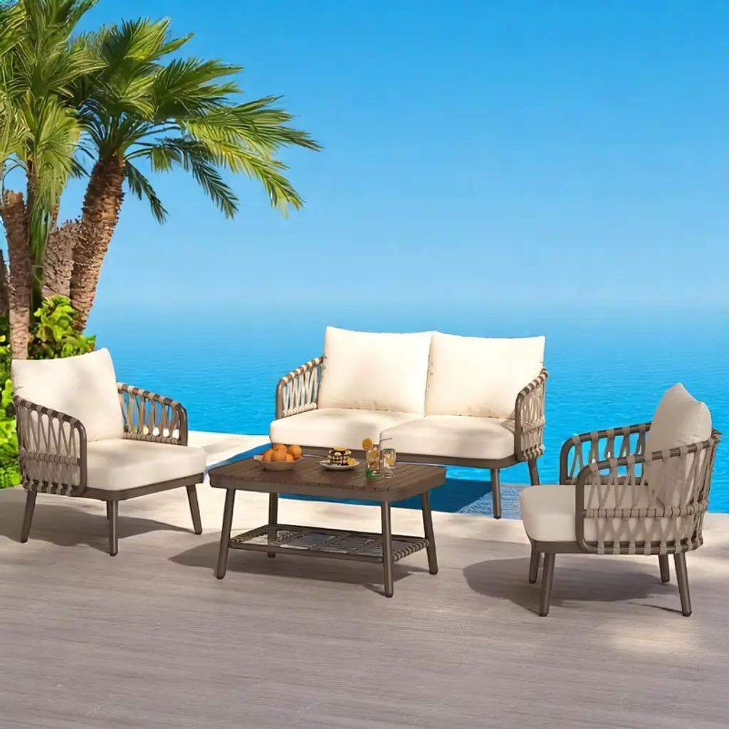 Product Overview Transform your patio into a stylish and relaxing retreat with this 4-piece outdoor conversation set. Featuring a sleek powder-coated steel frame, breathable handwoven rope, and plush water-repellent cushions, this set combines modern comfort with long-lasting durability. The ergonomic U-shaped backrest offers supportive wraparound comfort for your back and shoulders, ideal for reading, lounging, or entertaining guests. The woven rope design adds texture and breathability, while resisting UV rays for lasting outdoor performance. Product Features Each seat includes a 4-inch thick high-resilience sponge cushion with a 4.75-inch back cushion. Zippered cushion covers are made from water-repellent polyester and feature banding ropes to keep them neatly in place. The included coffee table features a natural Acacia wood top that offers excellent water resistance and easy maintenance, providing ample space for drinks, décor, or snacks. The powder-coated steel frame and handwoven rope provide structural strength and visual appeal for year-round outdoor use. Specifications Chair Dimensions: 26" W x 27.25" D x 26.5" H Loveseat Dimensions: 49" W x 27.25" D x 26.5" H Coffee Table Dimensions: 35.75" W x 22.5" D x 17.75" H Seat Height with Cushion: 16.25" Back Cushion: 22" x 17" x 4.75" Seat Cushion: 23.25" x 22.75" x 4" Weight Capacity: 400 lbs per chair, 600 lbs loveseat, 250 lbs table Total Product Weight: 94.8 lbs Materials: Steel, Rope, Acacia Wood, Polyester, Sponge Origin: Made in Vietnam Suitable Scenarios Perfect for patios, balconies, gardens, or poolside areas. This compact conversation set enhances any outdoor space with its elegant style and practical comfort. Notes Clean with a dry cloth and avoid submerging cushions. Assembly is required. Color may vary slightly due to lighting or screen differences. Manual measurements may result in minor variances. Align screw holes before tightening for best results.