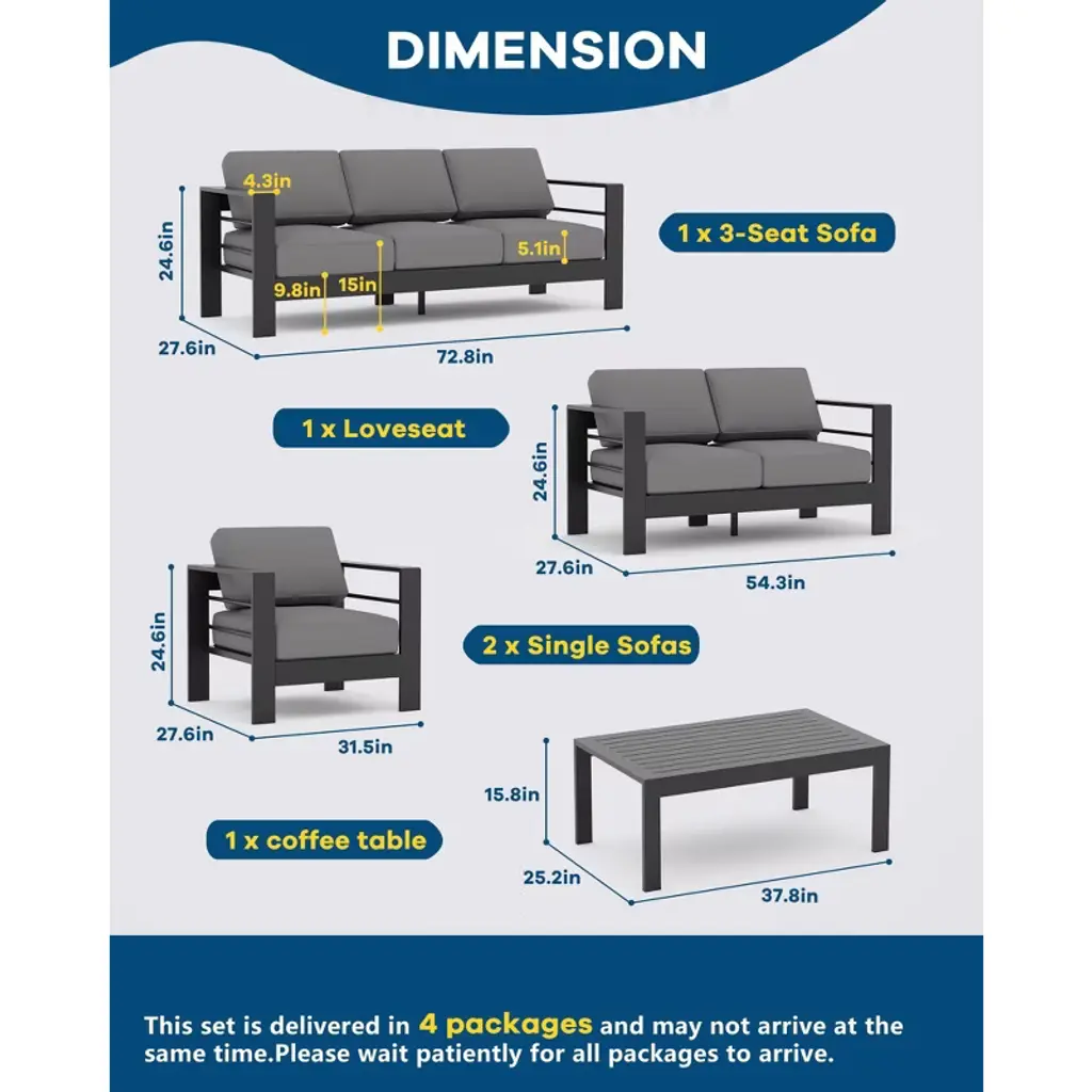 4-Piece Blue Aluminum Patio Furniture Set, 5-Seat Sectional Sofa with 10" Arms & Blue Cushions (2 Singles+1 Sofa+1 Table), Modern Outdoor Living Set