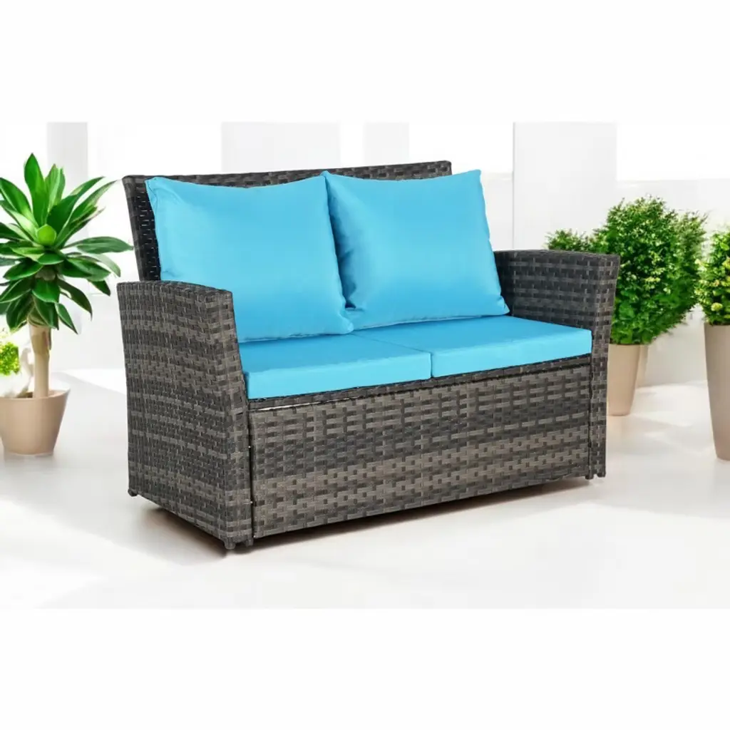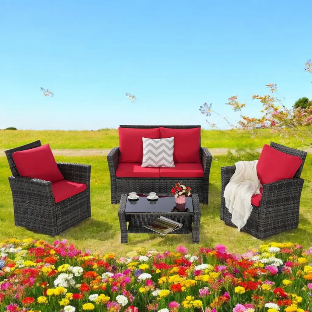 Product Overview Elevate your outdoor living space with this 4-piece Outdoor Patio Furniture Set. Crafted with durable PE rattan and a powder-coated steel frame, this set includes a modular sectional, individual chairs, and a tempered glass coffee table. The weather-resistant cushions provide long-lasting comfort, making it ideal for your patio, backyard, poolside, or garden. The sleek red cushions and versatile design add a touch of elegance, perfect for both relaxation and entertaining. Product Features Durable All-Weather Wicker: The set is made with handwoven PE wicker over fully-welded, powder-coated steel, ensuring a durable and sturdy construction that can withstand outdoor conditions. Comfortable Cushions: Cushions are large, wide, and machine washable with smooth zippers for easy cleaning. Made from breathable polyester fabric, they offer long-lasting comfort and are resistant to fading. Modular and Versatile: This 4-piece set can be configured in various ways, offering flexible seating arrangements to fit your space and needs. Whether you want a sectional sofa or separate chairs, this set adapts to your style. Weather-Resistant Fabric: The cushions are made with anti-UV and water-repellent fabric, designed to maintain comfort and color retention while enduring outdoor exposure. Tempered Glass Coffee Table: The included coffee table features a tempered glass top, adding an elegant and practical surface for drinks, snacks, or decorative items. Specifications Material: PE Rattan, Steel Frame, Polyester Cushions Cushion Color: Red Rattan Color: Gray Dimensions (Sofa): 47.6” L x 26.3” W x 30.3” H Dimensions (Chair): 26.3” L x 26” W x 13.8” H Dimensions (Coffee Table): 34.3” L x 19.7” W x 13.8” H Weight Capacity (Seat): 250 lbs Net Weight: 83.6 lbs Gross Weight: 88.22 lbs Suitable Scenarios This 4-piece modular set is perfect for any outdoor setting such as patios, poolside areas, gardens, or balconies. It’s ideal for relaxing, entertaining guests, or enjoying meals outdoors. The weather-resistant materials make it suitable for year-round use, providing comfort and style no matter the season. Notes Assembly: Some assembly is required. Please follow the included instructions for easy setup. Color Variation: Colors may vary slightly due to lighting or monitor display settings. Maintenance: Spot clean the cushions or remove them for a machine wash. The wicker is easy to clean with a damp cloth.