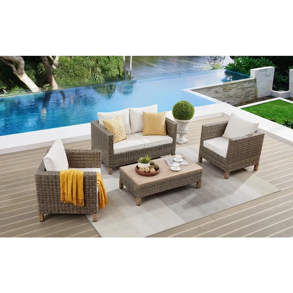 Upgrade your outdoor space with this elegant resin wicker patio set. Includes 1 loveseat, 2 chairs and 1 coffee table with 8 cushions and 2 toss pillows. Features all-weather durability, deep seating with lumbar support, UV-resistant fabrics and zero-maintenance construction.