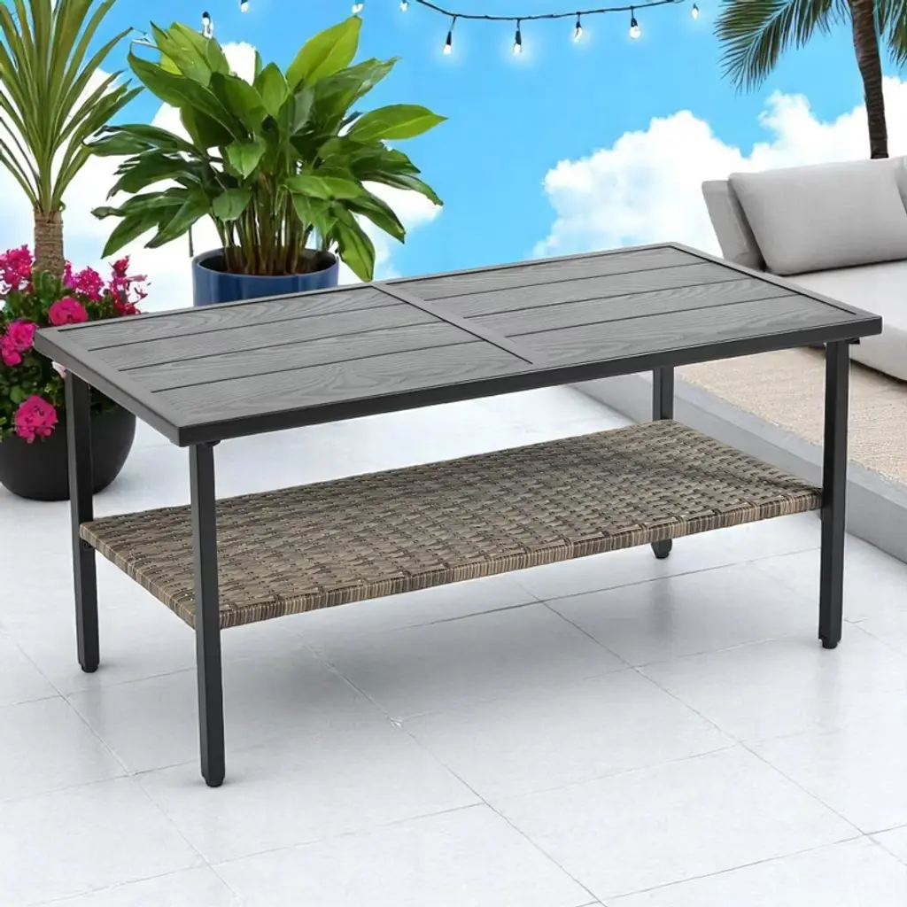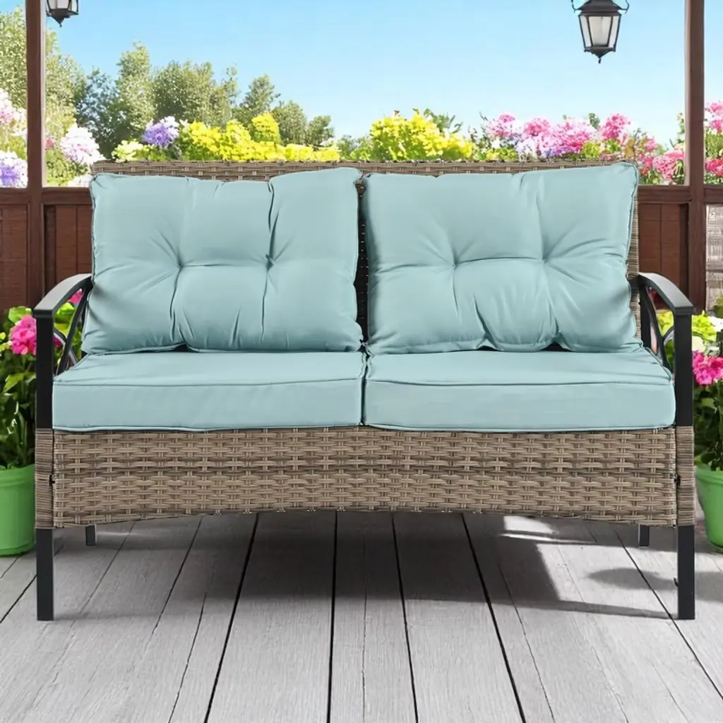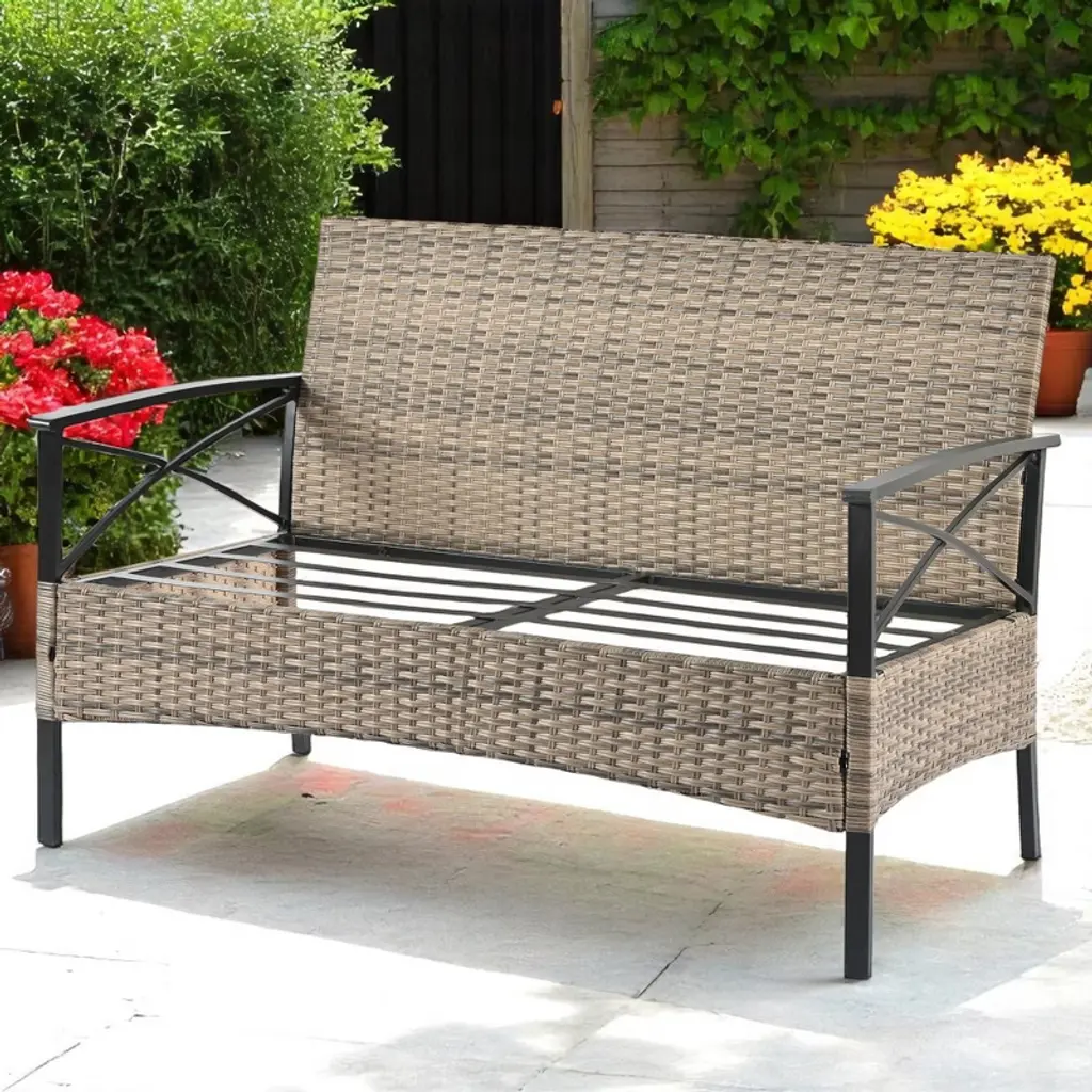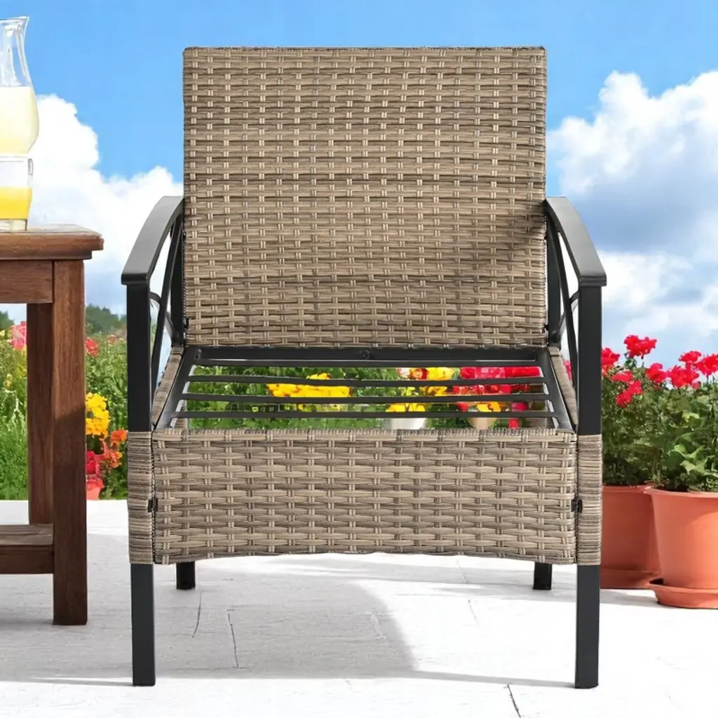 Product Overview This 4-piece patio furniture set combines style, durability, and comfort, making it the perfect addition to your outdoor space. The set includes two single chairs, one 2-seat sofa, and a black metal table with a wood-grain surface. The hand-woven PE wicker and sturdy metal frame ensure long-lasting use, while the plush cushions provide ultimate comfort for you and your guests. Whether you’re enjoying a sunny afternoon or hosting a gathering, this set offers the perfect solution for outdoor relaxation. Product Features Durable Construction: The square metal tube frame is powder-coated for added strength and protection against harsh weather, while the UV-resistant PE wicker ensures long-term use in the summer. Comfortable Seating: The bent back design, along with four seat cushions and four back cushions, offers superior comfort. Iron handrests enhance the experience, providing a cool and relaxing spot to enjoy the outdoors. Versatile Seating: The set includes two single chairs and one 2-seat sofa, perfect for creating a cozy outdoor seating arrangement for family or guests. Functional Metal Table: The black metal table with a wood-grain finish offers a sophisticated look and includes a shelf to conveniently store drinks or snacks, keeping your space tidy and organized. Easy Maintenance: Cushions are made with water-resistant fabric and feature zippers for easy removal and cleaning. The metal table top can be easily cleaned by wiping with a damp towel. Specifications Color: Black/Brown Material: Tempered Glass, PE Wicker, Metal Tube, Plastic End Cap Product Dimensions: Love Set: L46.75" x W27.10" x H31.50" Chair: L24.75" x W27.10" x H31.50" Table: L34.62" x W18.1" x H16.50" Weight: 85.60 lbs Package Included: 1 x 4-Piece Patio Furniture Set Suitable Scenarios This 4-piece furniture set is ideal for outdoor spaces such as patios, gardens, poolside areas, or backyards. Perfect for casual relaxation, family gatherings, or hosting friends in style and comfort. Notes Assembly is required; instructions and tools are included for easy setup. Product dimensions and weight may vary slightly due to manual measurements. Color and texture may vary depending on your monitor settings or lighting conditions.