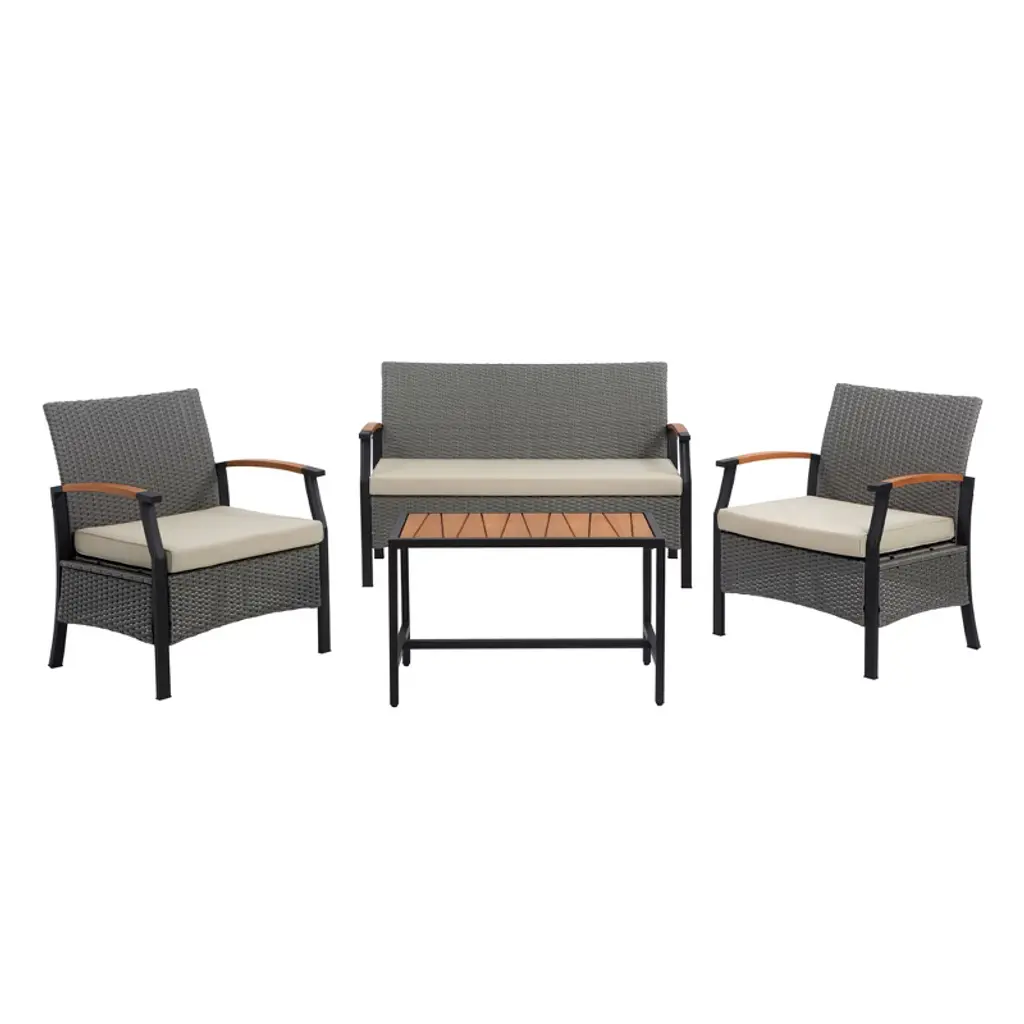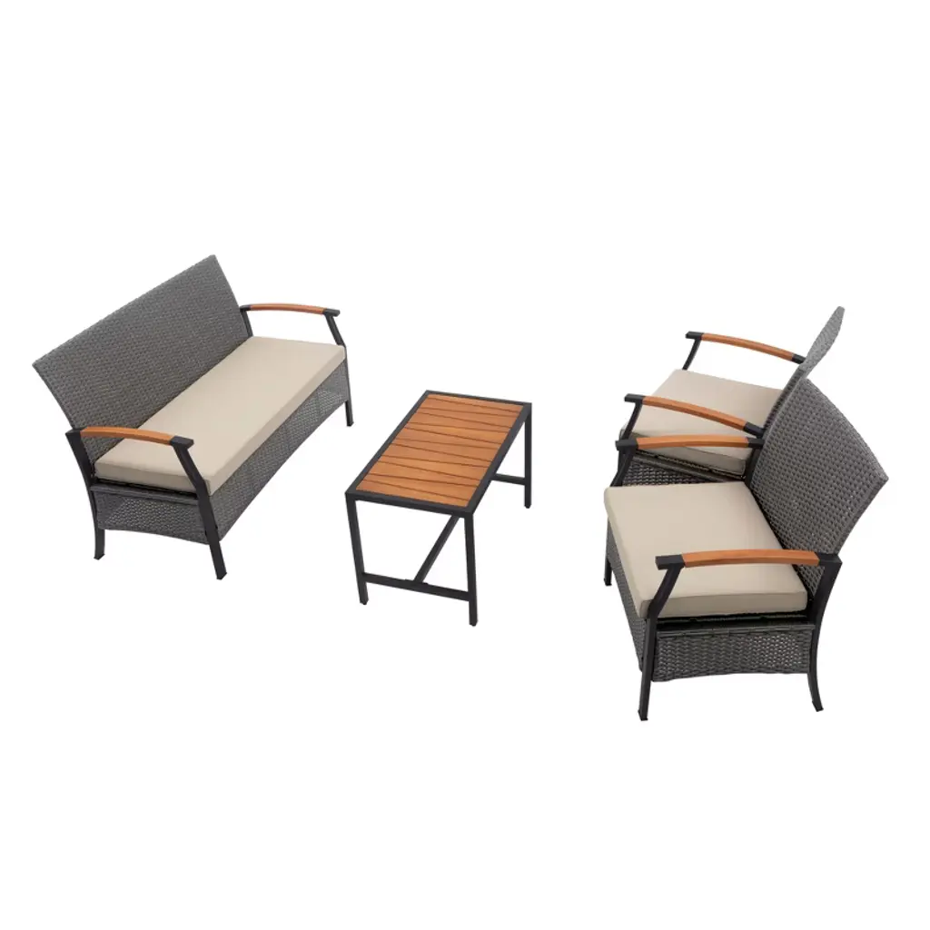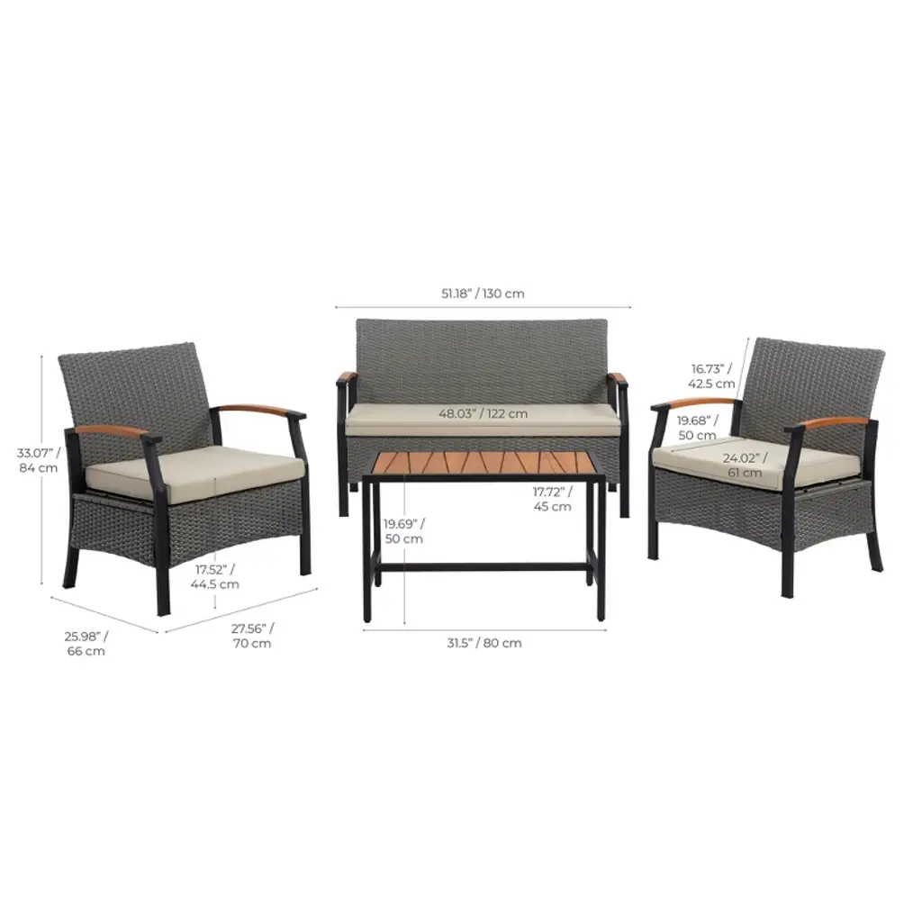 Welcome to your new go-to hangout spot. Whether you're sipping coffee, chatting with friends, or watching the kids play, this 4-piece set makes it all feel a little more special. The woven rattan wicker backs add charm, eucalyptus wood brings warmth, and weather-resistant cushions keep it looking good no matter the forecast. It’s not just outdoor furniture—it’s your new favorite way to enjoy home.