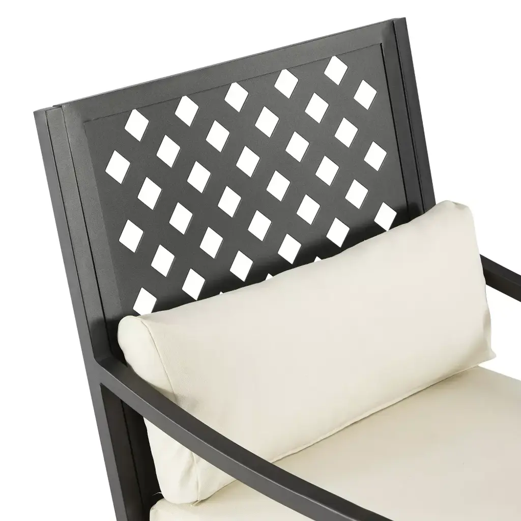 Spend time in the garden or relax by the pool with the Alistair 4pc Conversation Set. With a unique lattice design, the loveseat, chairs, and coffee table feature all-weather powder-coated steel. The plush seat cushions and lumbar pillows offer cozy seating, while the lattice top coffee table provides ample space for drinks and snacks. Create the perfect spot for outdoor entertaining with the Alistair conversation set.