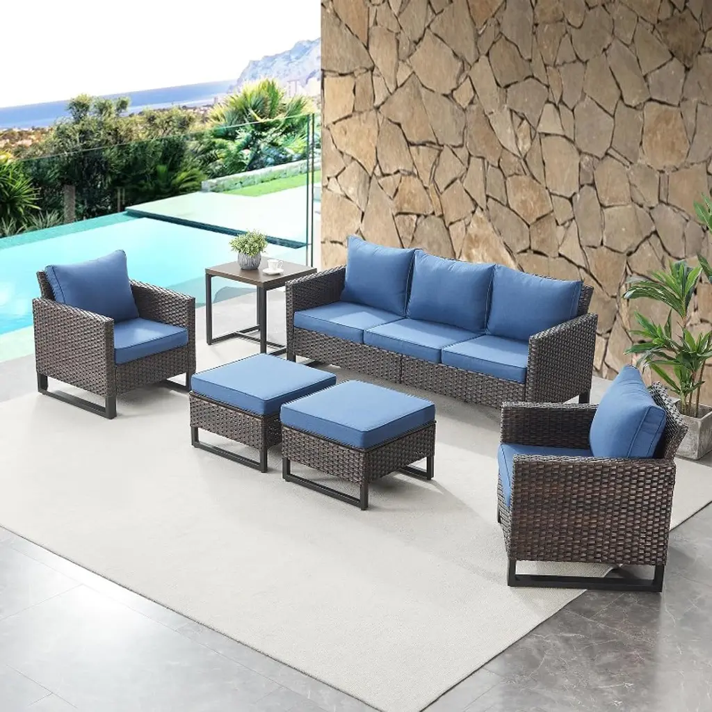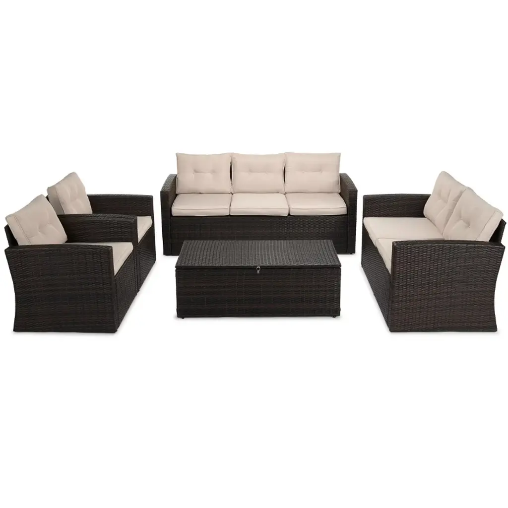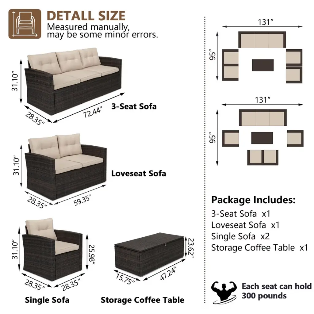 Elevate your outdoor living with this breezy, coastal-inspired 5-Piece Seating Group. Designed for generous gatherings of up to seven, it features a sofa, loveseat, two chairs, and a clever coffee table with hidden storage. Wrapped in weather-resistant wicker and crowned with plush, machine-washable cushions, this waterproof set brings durable style and easy care to your porch or patio ready for every sunny moment.