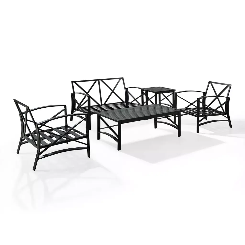 Gather together for a relaxing time outdoors with the Kaplan 5pc Conversation Set. Comprised of a sofa, side table, coffee table, and two armchairs, this set features sturdy steel construction with a transitional x-back design. Both the loveseat and chairs have comfortable seat and back cushions covered with solution-dyed polyester, while the coffee table and side table showcase a classic slatted look. Bring family and friends together for outdoor relaxation with the Kaplan conversation set.