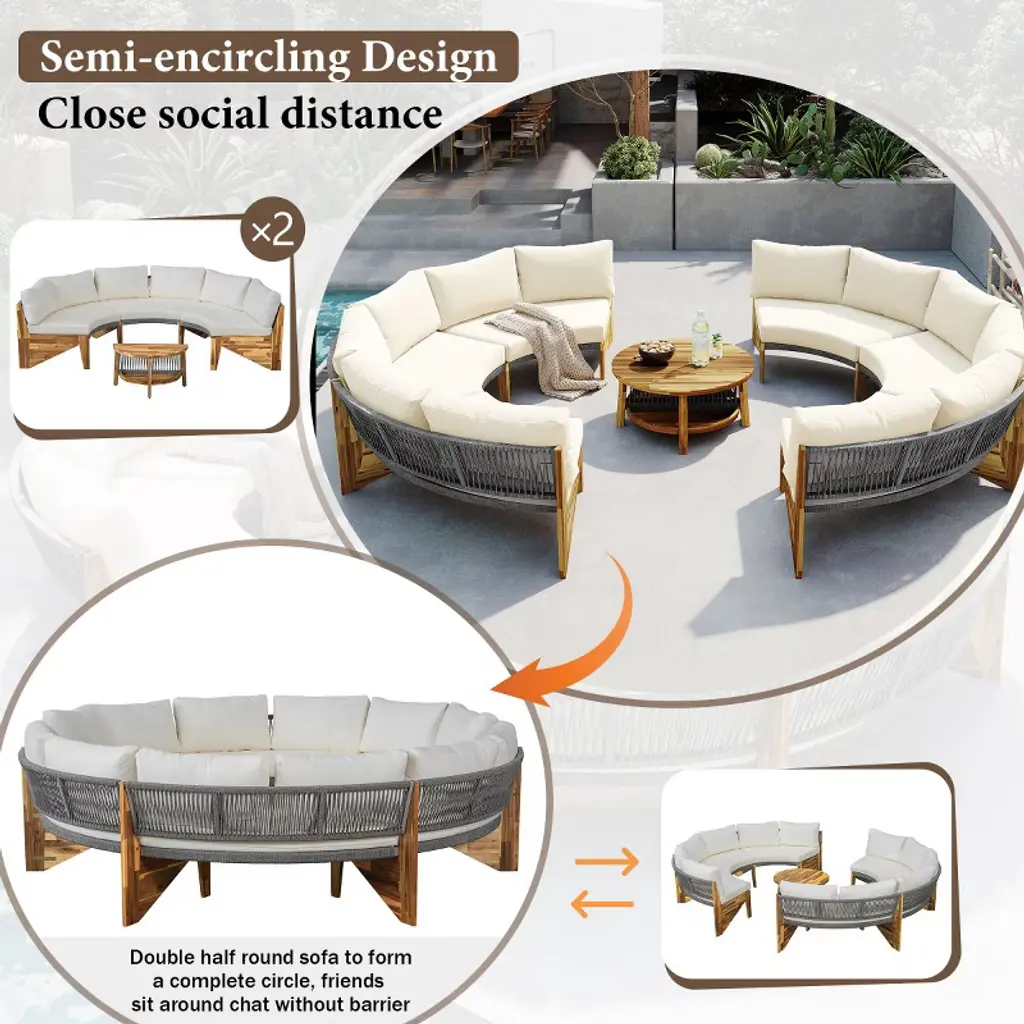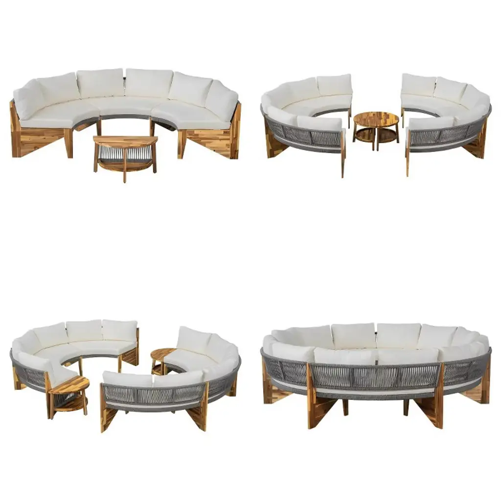 6-person Outdoor Curved Sectional Sofa Set, Acacia Wood Patio Conversation Set Semi Circular Sofas With Beige Cushions And Coffee Table – Cuddlewood