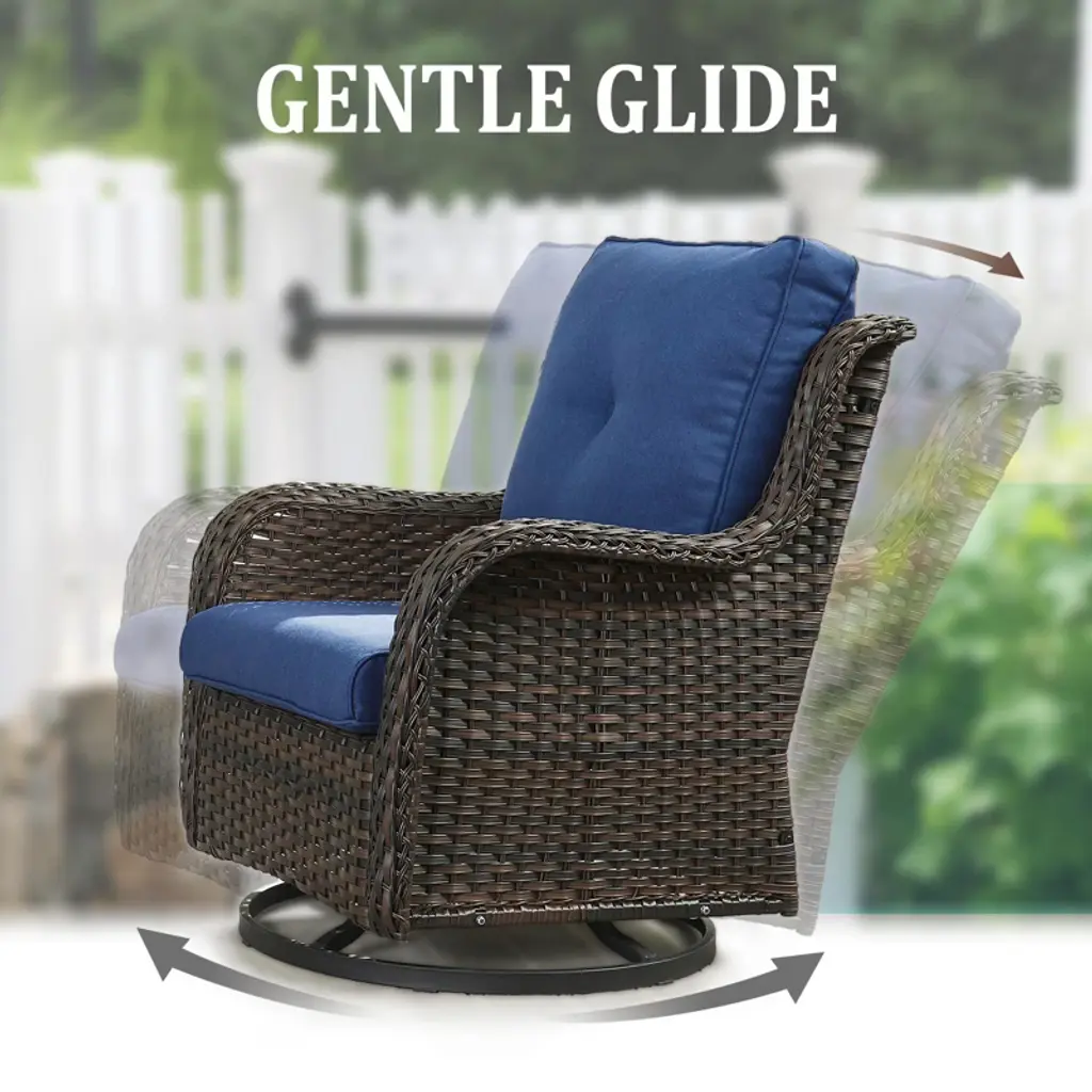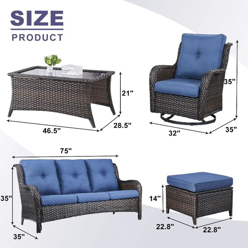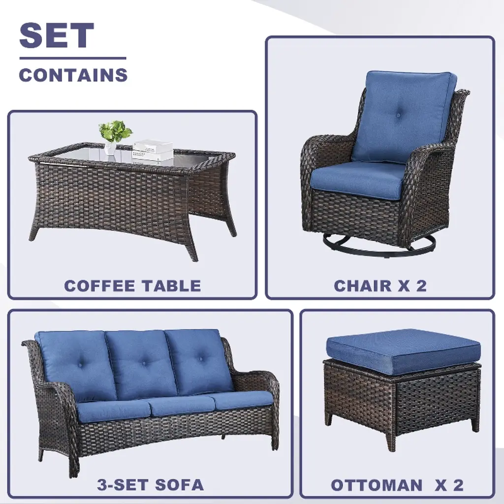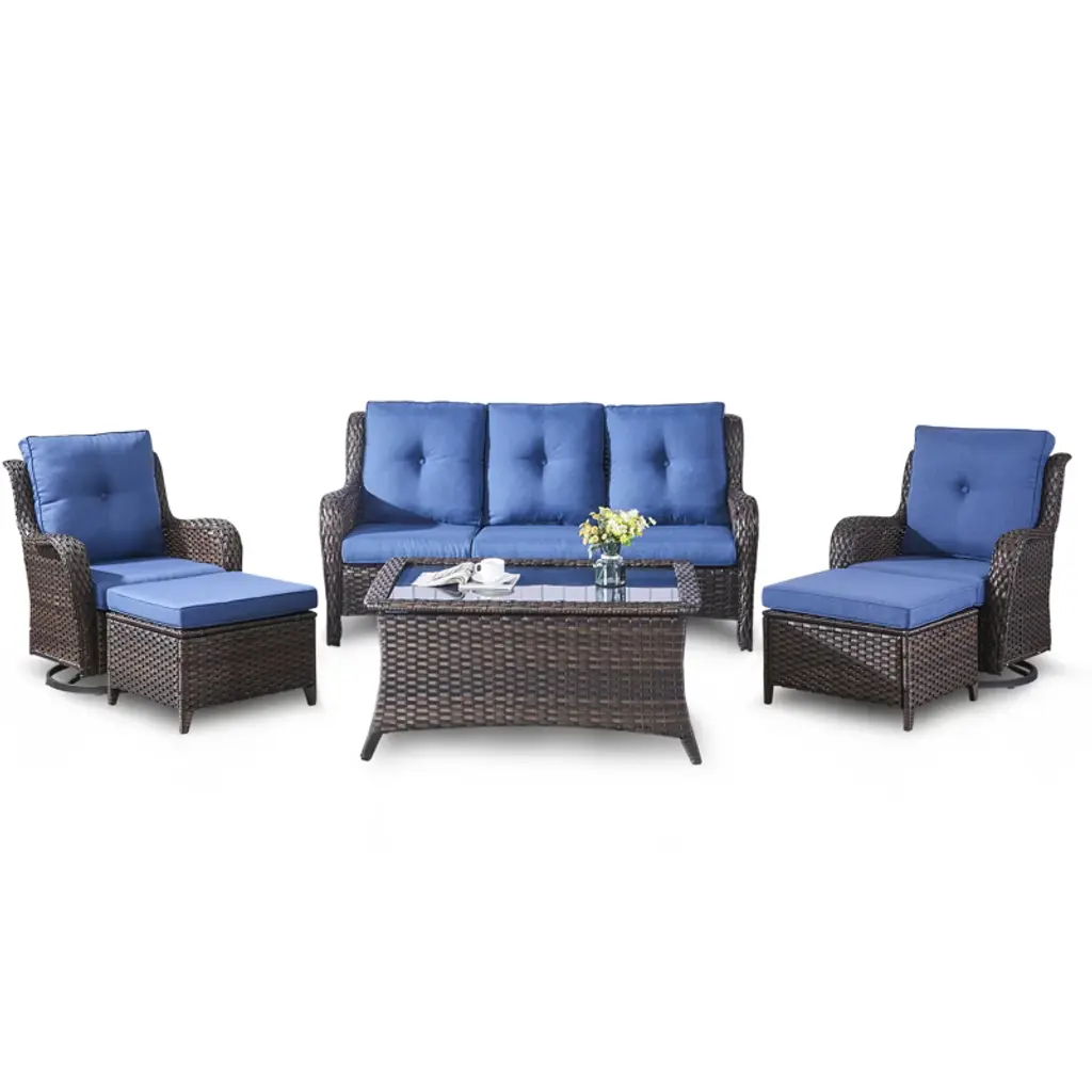 Upgrade your outdoor entertainment space with the All-Weather Wicker Lounge Set featuring swivel chairs - a complete 6-piece ensemble including one plush wicker sofa, two smooth-swiveling rockers, one stylish coffee table, and two versatile ottomans designed for ultimate comfort and style. Available in multiple sophisticated color options to seamlessly blend with your existing decor, this durable set features 4-inch thick premium cushions with ergonomic backrests that provide exceptional comfort while its weather-resistant construction ensures long-lasting performance. Perfect for hosting gatherings or enjoying quiet moments outdoors, this exquisite furniture collection effortlessly bridges indoor elegance with outdoor durability, creating a luxurious extension of your living space that withstands the elements while maintaining its refined aesthetic season after season.
