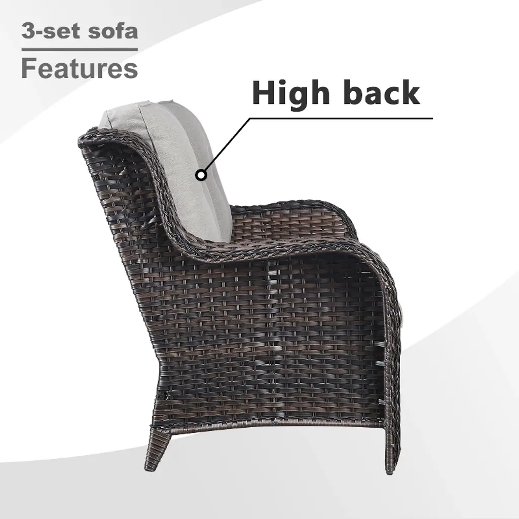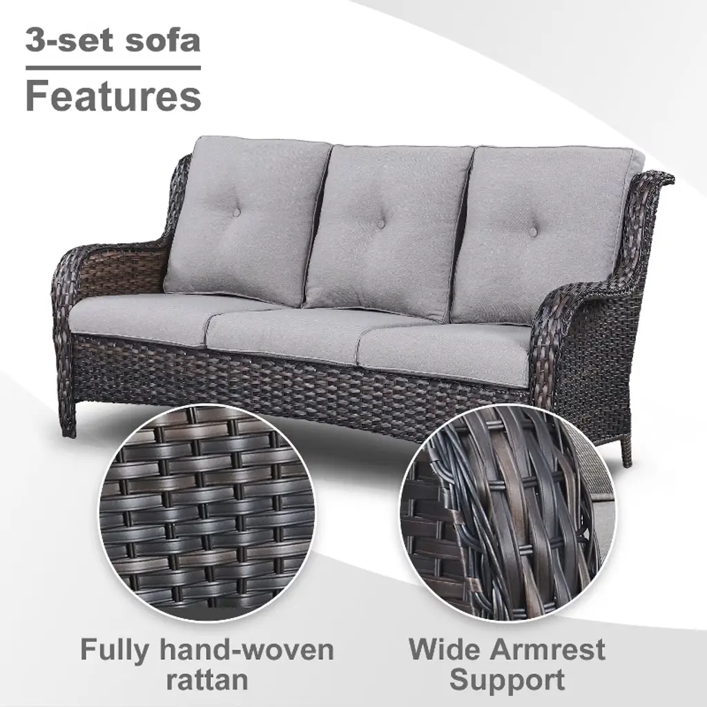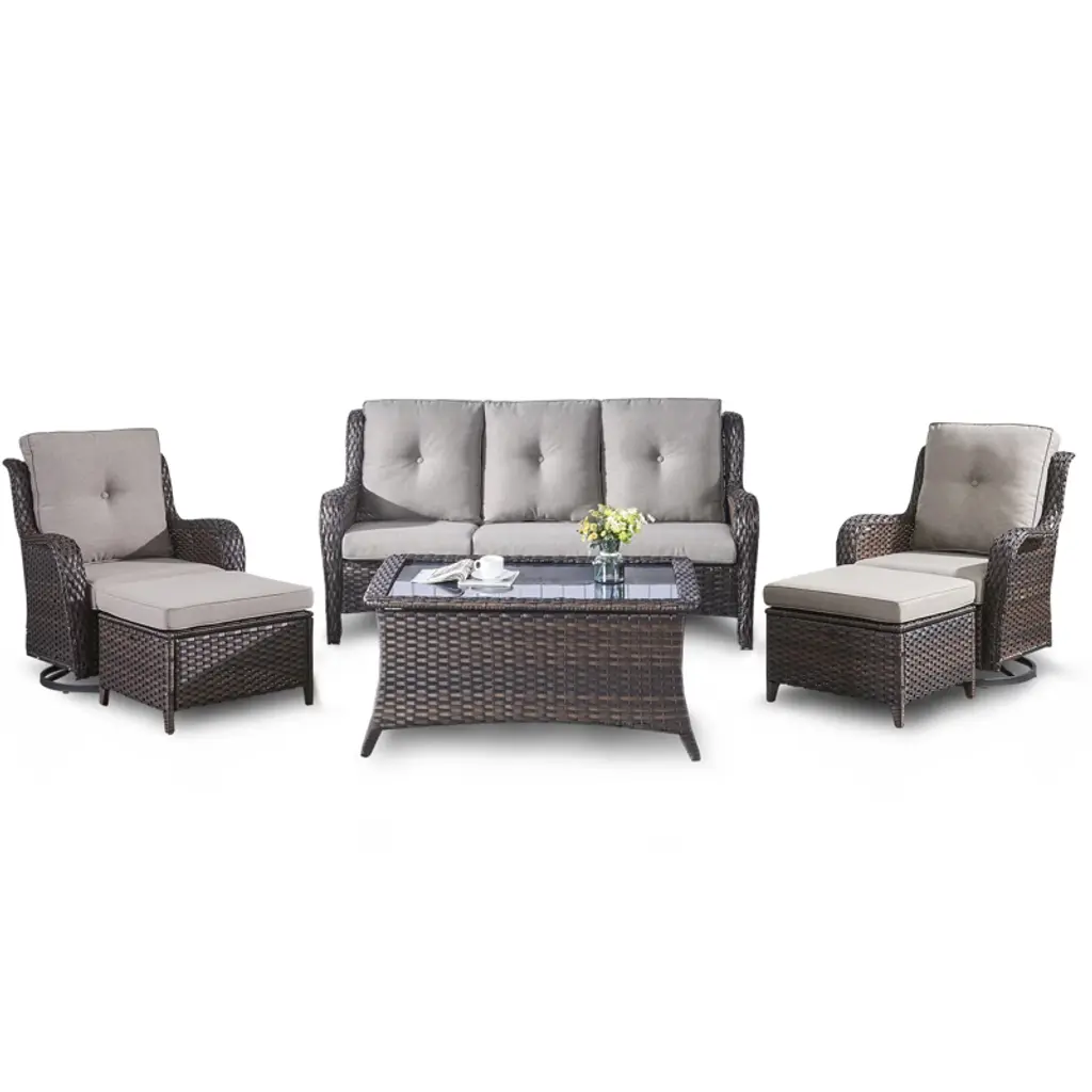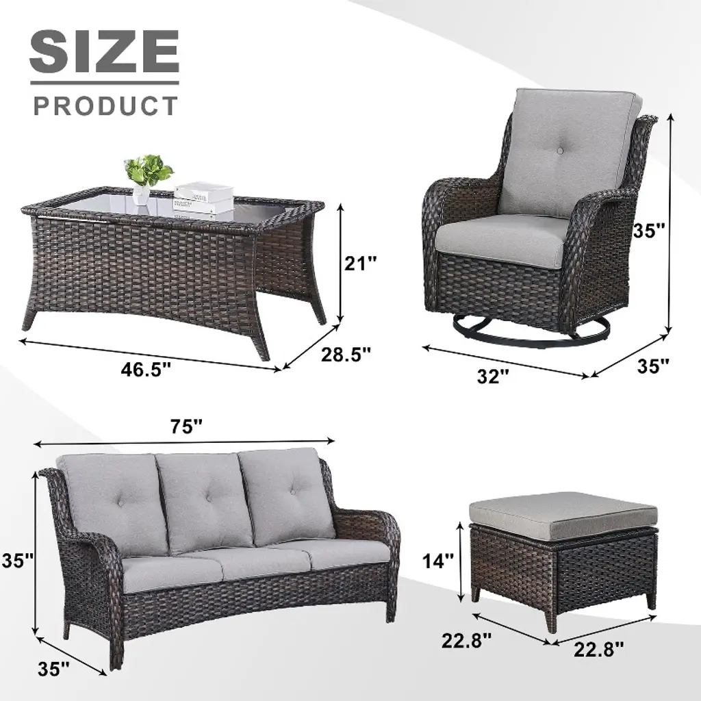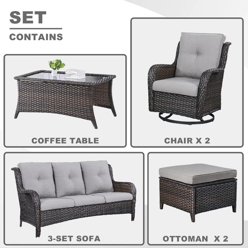 Upgrade your outdoor entertainment space with the All-Weather Wicker Lounge Set featuring swivel chairs - a complete 6-piece ensemble including one plush wicker sofa, two smooth-swiveling rockers, one stylish coffee table, and two versatile ottomans designed for ultimate comfort and style. Available in multiple sophisticated color options to seamlessly blend with your existing decor, this durable set features 4-inch thick premium cushions with ergonomic backrests that provide exceptional comfort while its weather-resistant construction ensures long-lasting performance. Perfect for hosting gatherings or enjoying quiet moments outdoors, this exquisite furniture collection effortlessly bridges indoor elegance with outdoor durability, creating a luxurious extension of your living space that withstands the elements while maintaining its refined aesthetic season after season.