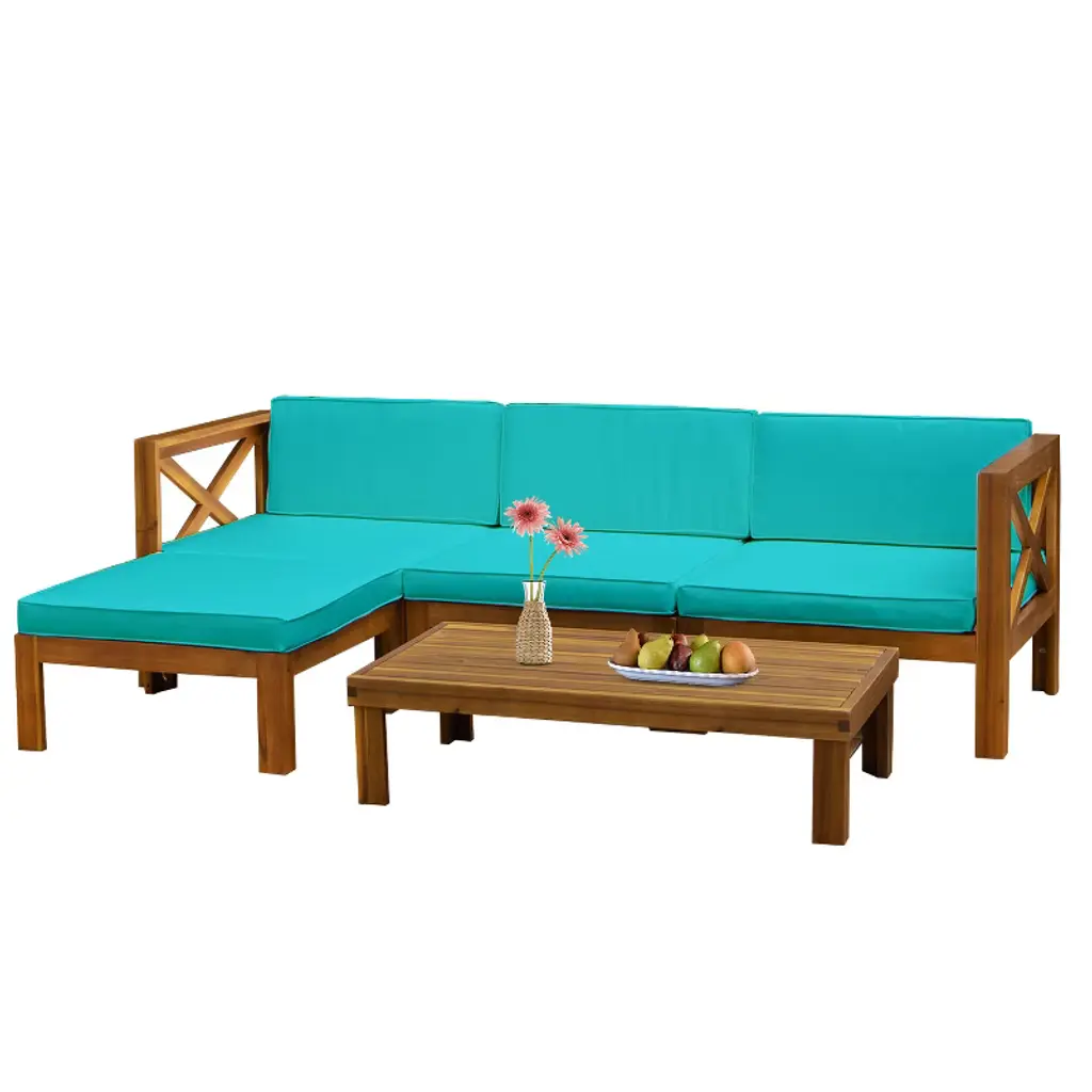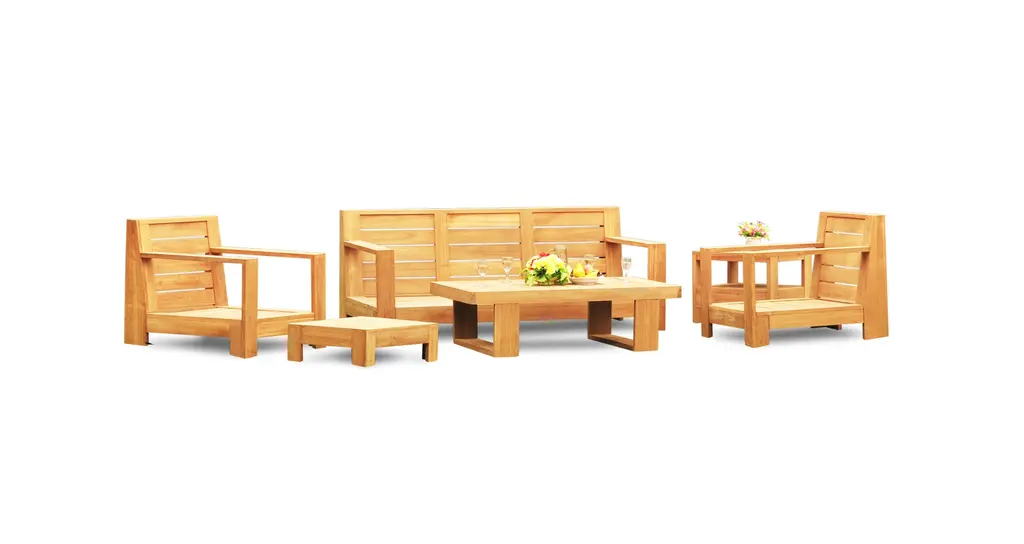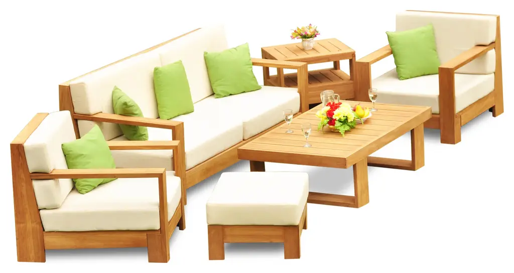 Set includes: 3-Seater Sofa, 2 Sofa Chairs, 1 Coffee Table, 1 Side Table with Shelf and 1 OttomanPlease see second image for swatch of this color variationFeatures include:Teak Crafted with broad arms with smooth sanded natural finish and offered with Sunbrella cushions.Constructed with wide planks & clean lines fine sanded Teak in Natural Finish.Side Table comes with lower shelf to add table surface.The Cushions are made out of Sunbrella fabric which is the best for outdoor.All the Cushions comes with a zipper in the back side and ties for easy removal when needed.Standard seat cushions are 5.5" thick and back cushions are 4.5" thick.Piping, extra thick can be done for additional cost, need more fabric choices, Please contact us.Assembly: Very little assembly is required (Hardware & Instructions included). Assembly is quick and simple.Dimensions:Sofa 3 Seater: 78.5" W x 38.5" D x 31.5" HSofa Chair: 32" W x 38.5" D x 31.5" HSide Table: 25" W x 21.25" D x 20" HCoffee Table: 55" W x 33.5" D x 15.75" HOttoman: 30" W x 22.75" D x 9" H