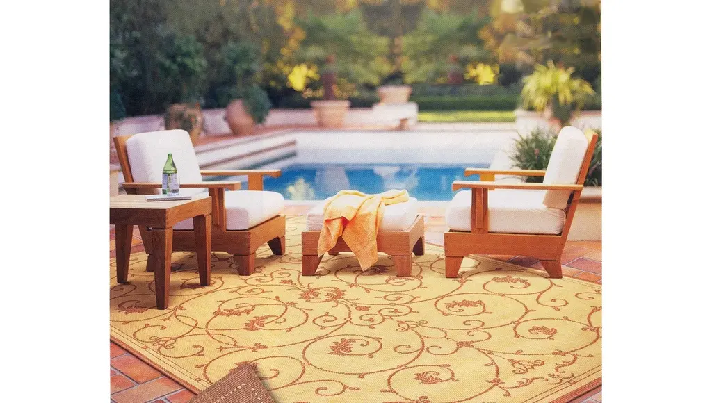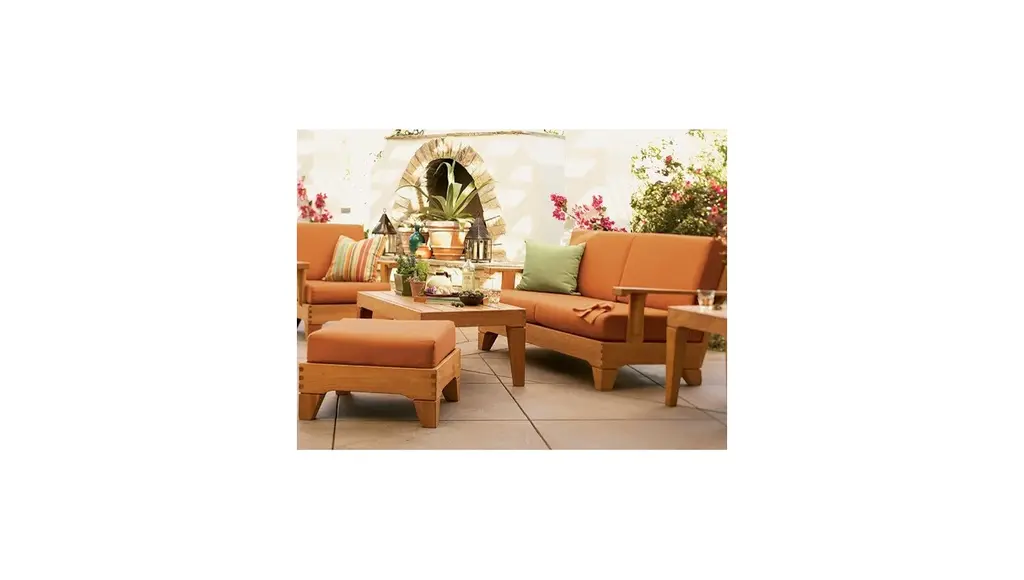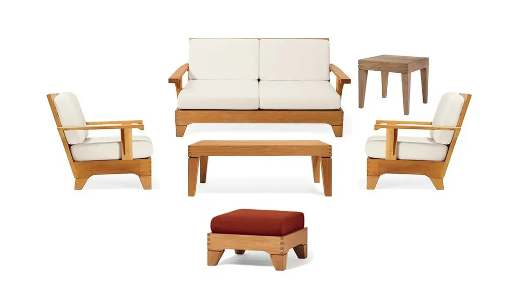 Set includes: Sofa, 2 Lounge Chairs, 1 Coffee Table, 1 Side Table and 1 OttomanFeatures include:Teak Crafted with broad arms with smooth sanded natural finish and offered with Sunbrella cushions.Constructed with wide planks & clean lines fine sanded Teak in Natural Finish.Dimensions:Sofa Bench Dimensions: 80" L x 34" H, 36" DChair Dimensions: 33.5" W x 36" D x 34" HCoffee Table Dimensions: 49" L x 25" W x 17" HEnd Table Dimensions: 22" Square x 20" HOttoman Dimensions: 26" Square x 10.5" H
