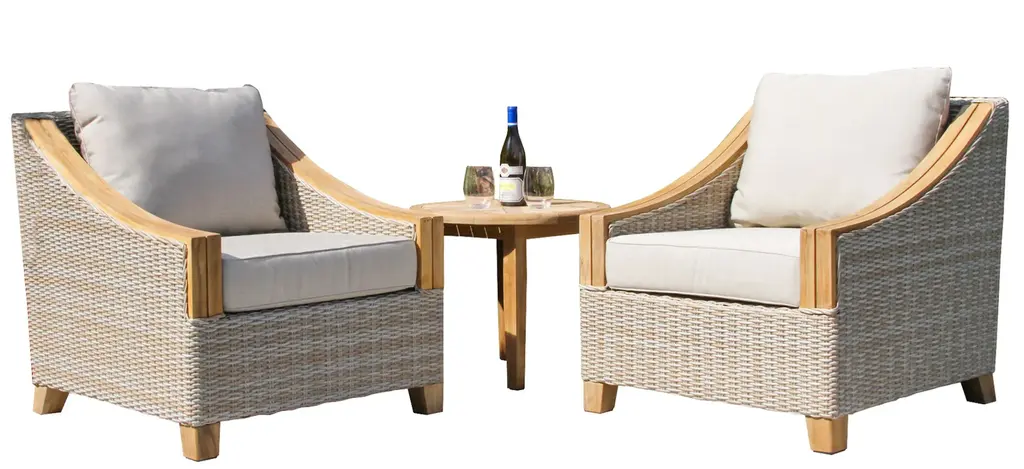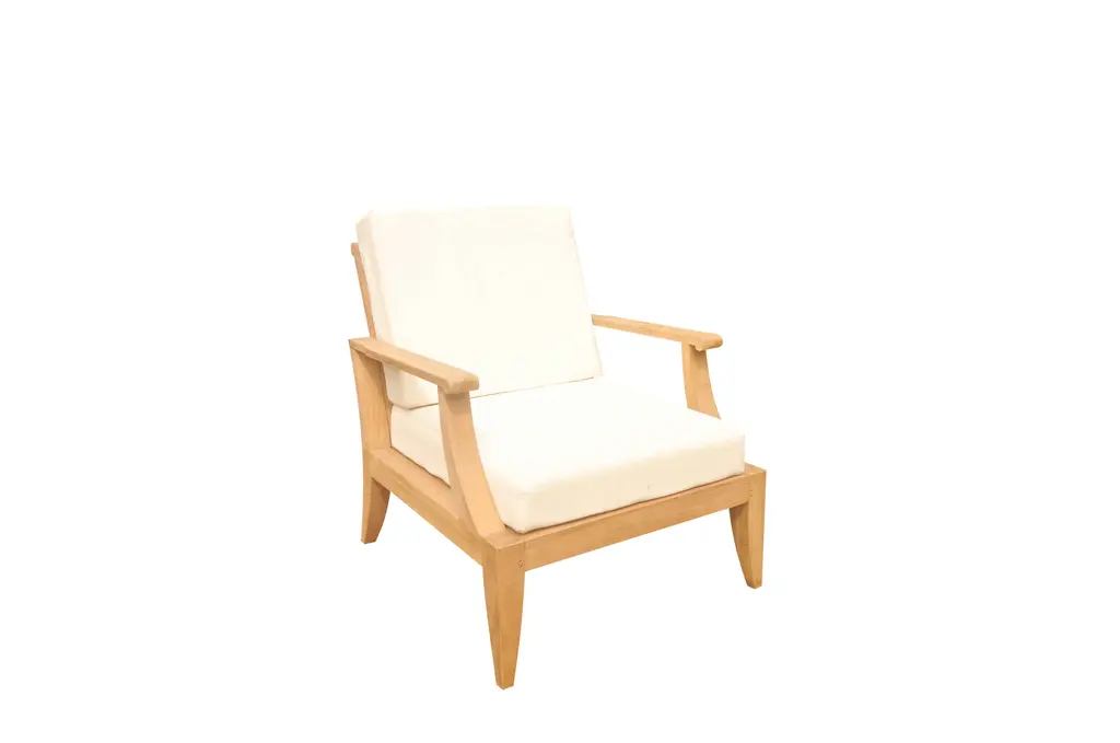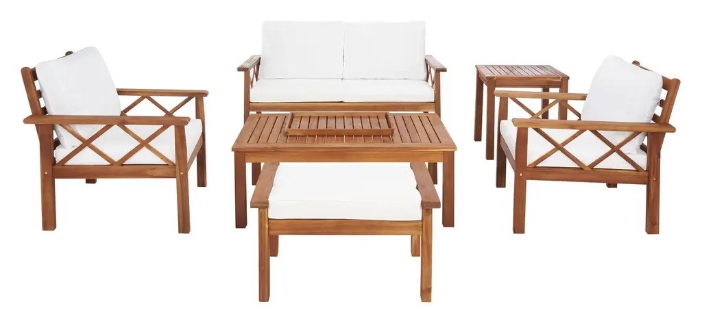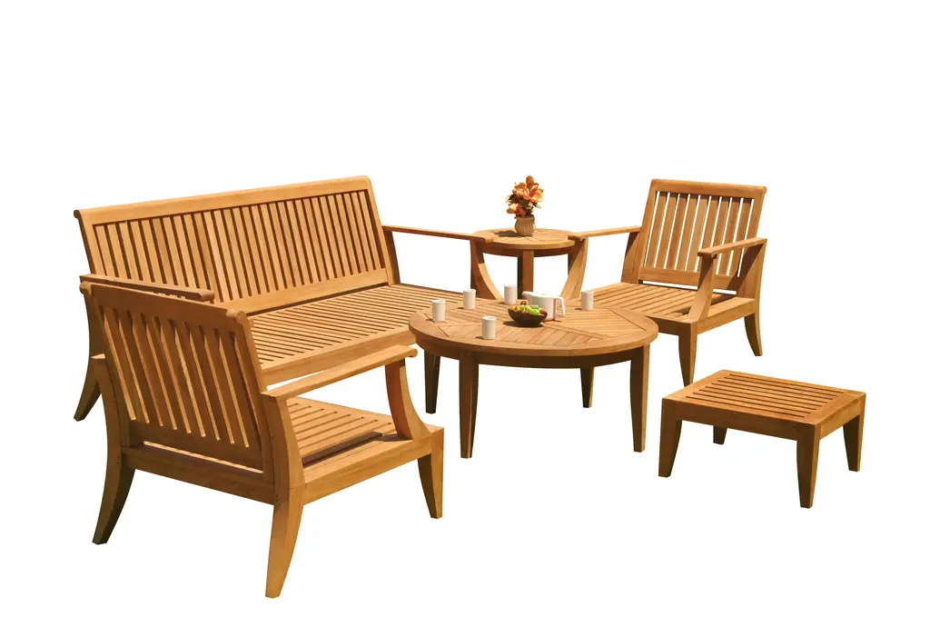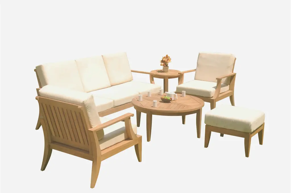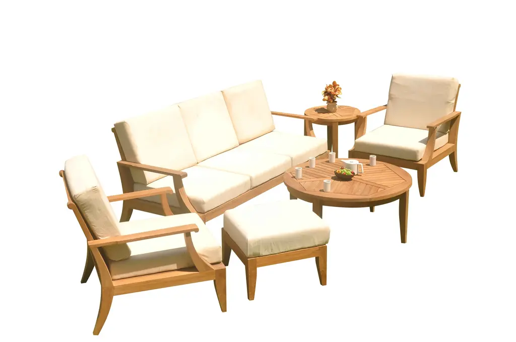 Set includes: Sofa, 2 Arm Chairs, 1 Coffee Table, 1 Side Table and 1 OttomanFeatures include:Teak Crafted with broad arms with smooth sanded natural finish and offered with Sunbrella cushions.Constructed with wide planks and clean lines fine sanded Teak in Natural Finish. The Cushions are made out of Sunbrella fabric which is the best for outdoor.All the Cushions comes with a zipper in the back side and ties for easy removal when needed.Standard seat cushions are 5.5" thick and back cushions are 4.5" thick.Piping, extra thick can be done for additional cost, need more fabric choices, Please contact us.Assembly: Very little assembly is required (Hardware and Instructions included). Assembly is quick and simple.Dimensions:Sofa: 77.95" W x 35" D x 33.5" H; 73.22" SW x 27" SDArm Chair: 29.5" W x 35" D x 33.5" H; 24.40" SW x 27" SDSide Table: 22" Diameter x 22" HCoffee Table: 39" Diameter x 17.75" HOttoman: 22 "W x 22" D x 11.80" H