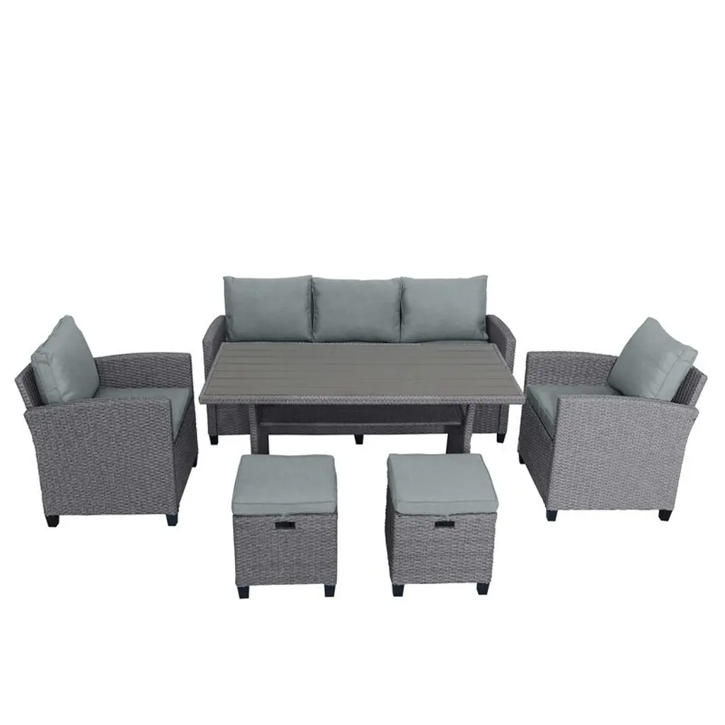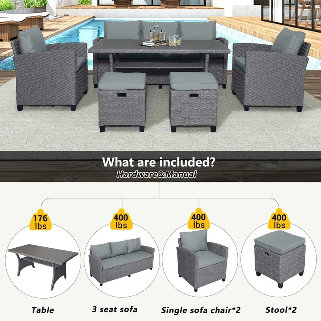 Enjoy Outdoor Time with Your FamilyWith two sofa chairs, one 3 seater sofa and two stools, this massive 6 piece set can comfortably seat 7 people while the spacious table is perfect for placing food, drinks, etc., making this set the perfect match for anyone who wants to transform their outdoor space. Product Features · Enjoy Outdoor Time with Your Family With two sofa chairs, one 3 seater sofa and two stools, this massive 6 piece set can comfortably seat 7 people while the spacious table is perfect for placing food, drinks, etc., making this set the perfect match for anyone who wants to transform their outdoor space.· High Quality PE Rattan Designed with weather resistant PE rattan, not only can you enjoy the great outdoors year round, but each piece will withstand the elements and won't crack, split or incur other wear and tear as you spend years and years building happy memories with friends and family.· Thick Seating and Back Cushions Featuring high density extra stuffed foam cushions with a decadent 7 inches for back and 2.8 inches for seats, this patio set will take away all the stress from your day as you ease back and relax on the warm sun. Cushions covers are removable for easy cleaning.· Beautiful Patio Furniture Set With the understated, elegant gray cushions and exquisitely wrapped rattan, this set will add a subtle touch of class to any space, instantly transforming your back yard or pool area into your go to for relaxation and fun, with an aesthetic that will never go out of style.· Dimensions 3 seater sofa size:63.4x25x28.7inches (LxWxH). Single sofa chair size: 25.9x25x28.7inches (LxWxH). Single Stool Size: 16.1x16.1x17.7(LxWxH) . Table size: 57.1x29.1x26.4inches (LxWxH). Warm Notice: Electric drill and gloves (not included) are recommended for safety. Item will come in three packages which may not come together(Extra colorful pillow&blanket not included.Pls check the numbers of pillow&cushion in white background pictures)Color:Natural/GrayOverall Product Dimension: 3 seater sofa size: 63.4"x25"x28.7" (LxWxH); Single sofa chair size: 25.9"x 25"x28.7" ; Single Stool Size: 16.1"x16.1"x17.7"(LxWxH); Table size: 57.1"x29.1"x26.4" (LxWxH)Overall Product Dimension of Cushion: Single sofa chair seat cushions: 22.6''x21.7"x2.8"(LxWxH); Single sofa chair back cushions: 21.7"x15.7"x7"(LxWxH); 3 seater sofa seat cushion: 63"x22.8"x2.8"(LxWxH); 3 seater sofa back cushions: 21.7"x15.7"x7"(LxWxH); Stool seat cushions: 16.1"x16.1"x2.3"(LxWxH)Overall Weight:Table: 38.6 lbs; Single sofa chair: 25.1lbs; 3 seater sofa: 45.6lbs; Stool: 7.7lbs overall:149.8lbsWeight Capacity:Table: 176 lbs; Single sofa chair: 400 lbs; 3 seater sofa: 400 lbs; Single stool: 400 lbsMaterial: PE Wicker + Steel frame + Polyester+SpongePieces Included:Table +3 seat sofa+Single sofa chair*2+Stool*2Notes:Assembly RequiredThis product will ship to you in multiple boxes.Disclaimers & Disclosures:Contact US:After-sales Email Address: dhalcomb@doorise.comIf the item comes with any defect, damage(include damaged in transit) or missing partsand, please contact us with detailed images for free replacement or refund.