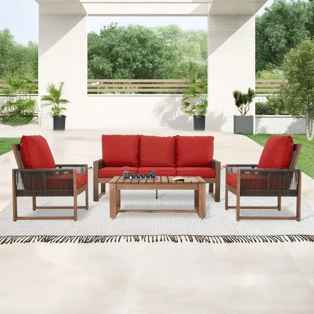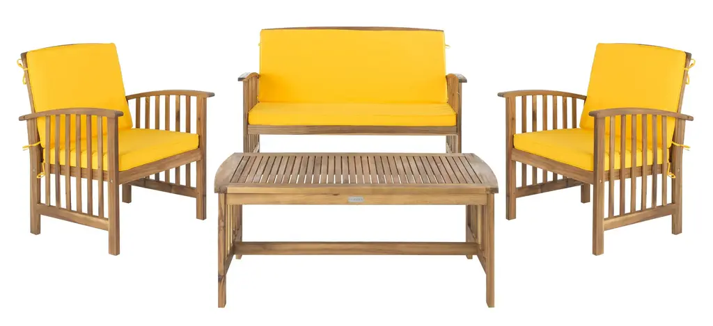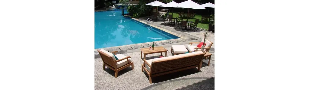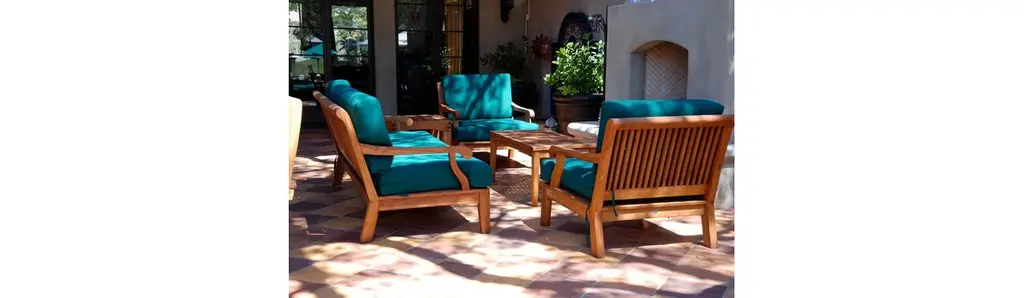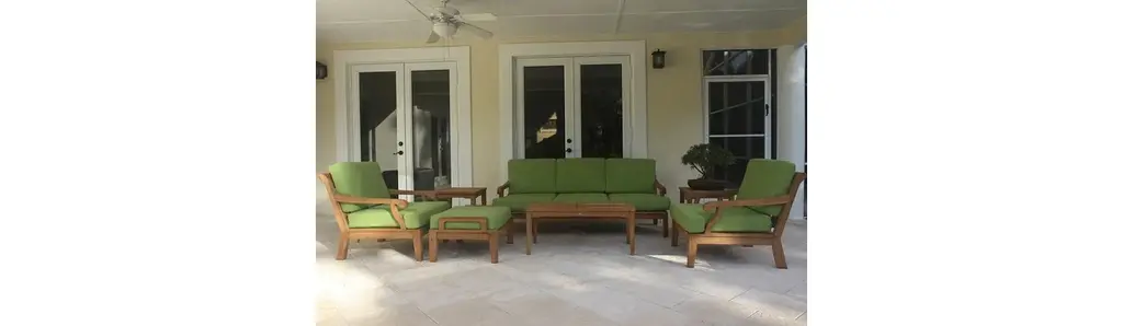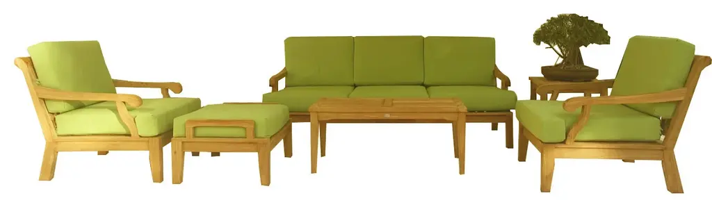 Set includes: Sofa, 2 Lounge Chairs, 1 Coffee Table, 1 Side Table and 1 OttomanFeatures include:Teak Crafted with broad arms with smooth sanded natural finish and offered with Sunbrella cushions.Constructed with wide planks & clean lines fine sanded Teak in Natural Finish. The Cushions are made out of Sunbrella fabric which is the best for outdoor.All the Cushions comes with a zipper in the back side and ties for easy removal when needed.Standard seat cushions are 5.5" thick and back cushions are 4.5" thick.Piping, extra thick can be done for additional cost, need more fabric choices, Please contact us.Assembly: Very little assembly is required (Hardware & Instructions included). Assembly is quick and simple.Dimensions:Sofa: 80" W x 35.5" D x 32.5" HLounge Chair: 31.5" W x 38" D x 32" HSide Table: 20.75" Square x 21.25" HCoffee Table: 47" W x 24" D x 17" HOttoman: 28" W x 26" D x 11" H