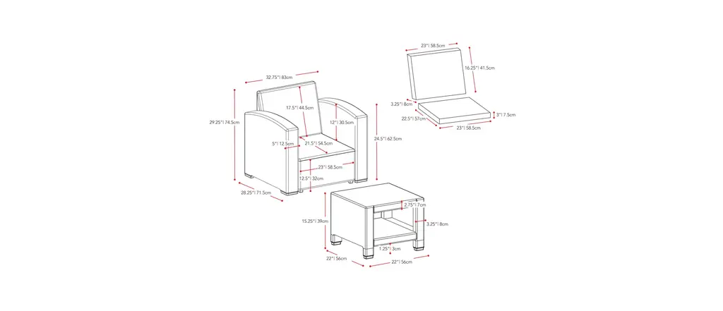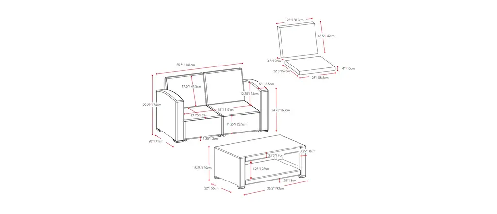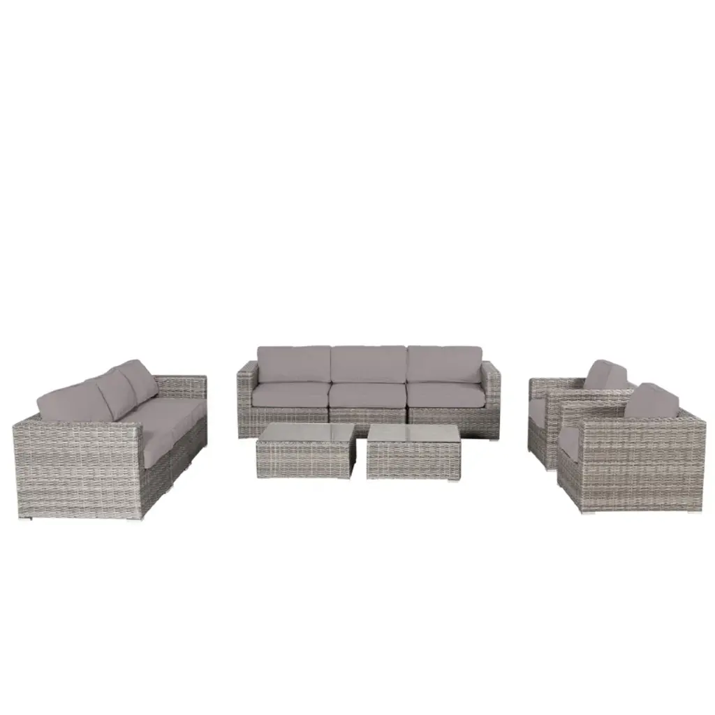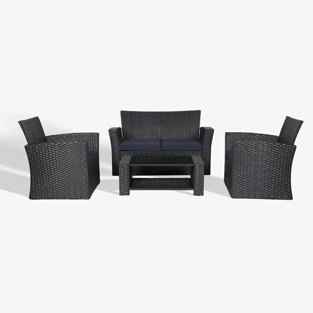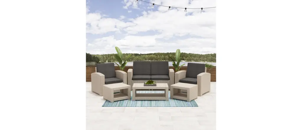 Relax in style this summer with this unique 6 piece patio set. Includes 2 chairs, 2 ottomans and a coffee table crafted entirely from durable, weather-resistant all weather pressed-resin wicker. Engineered to give you a natural-looking wicker rattan design that will complement any patio or garden, this set is virtually maintenance free, rust proof, and decay proof. Assemble your new patio set in minutes allowing you even more time to enjoy your outdoor space. This convenient set is truly built to last.Frame and rattan constructed of high-quality, all weather resin wicker in beigeDimensions:Loveseat - 29" H x 56" W x 28" DChair - 30" H x 33" W x 28" DOttoman - 15" H x 22" W x 22" DCoffee Table - 15" H x 37" W x 22" DUV resistant, maintenance free, rust-proofUnique Quick Click design assembles in minutesHigh quality foam cushions covered with zippered polyester seat covers in dark greySet includes loveseat sofa, 2 chairs, 2 ottomans, coffee table and seat cushions
