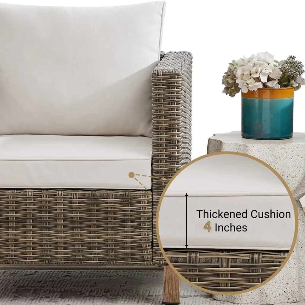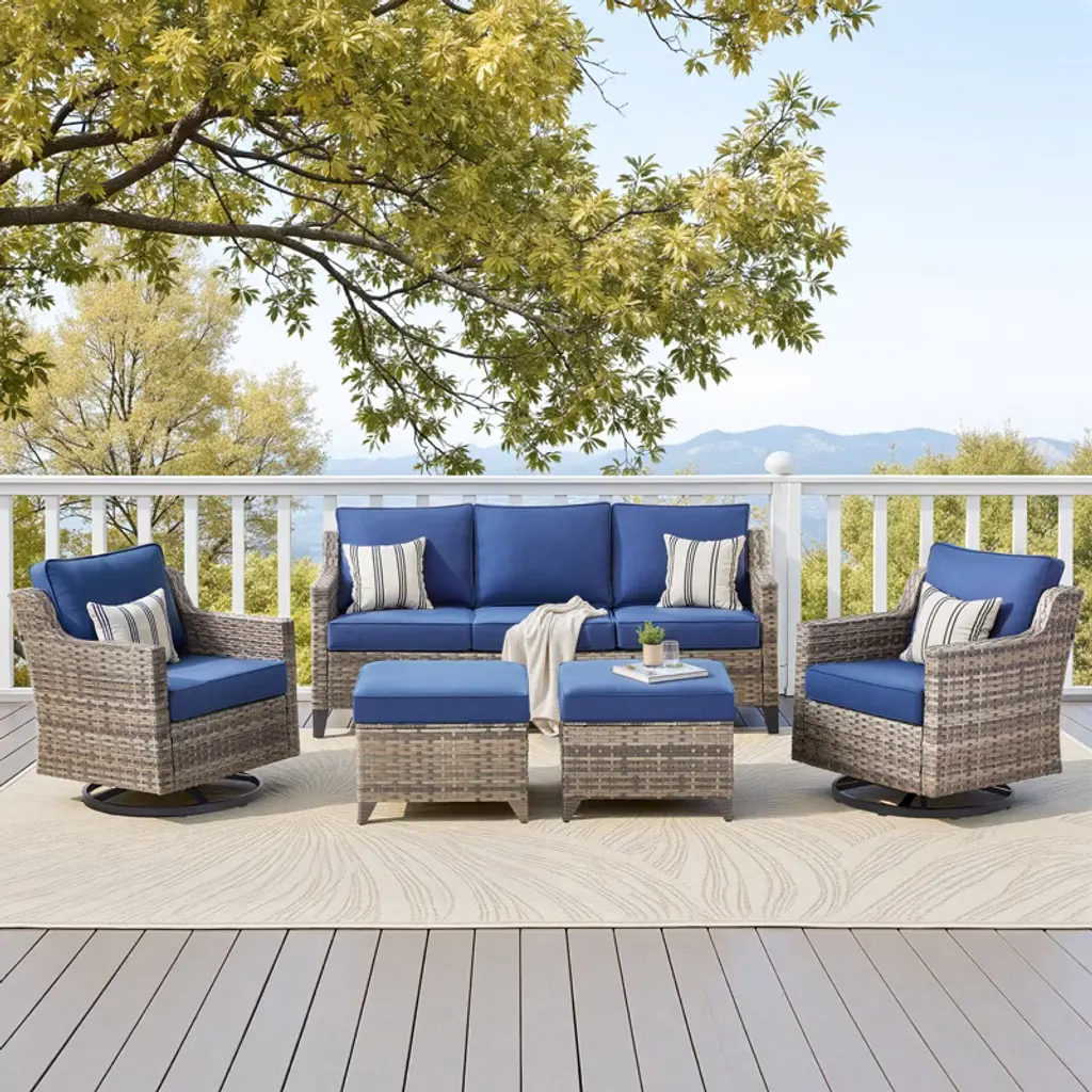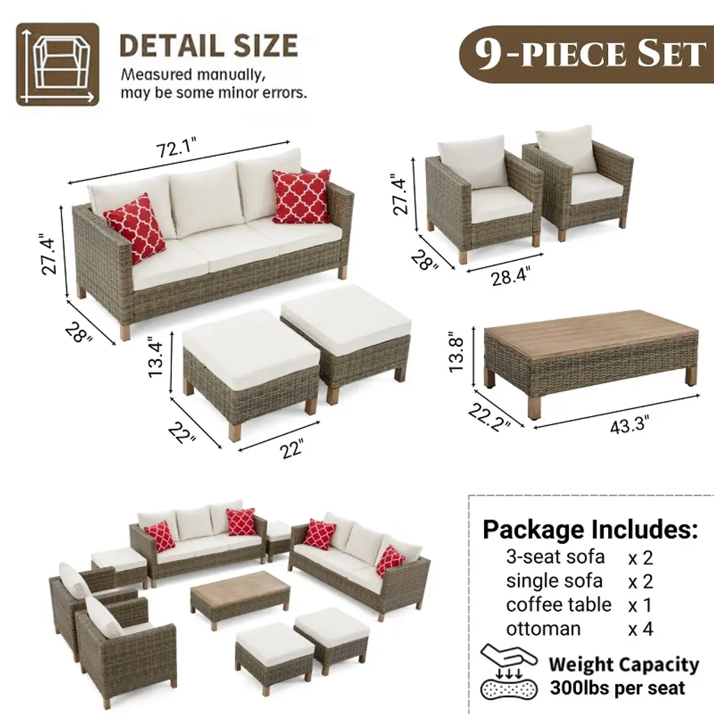 Transform your patio with this elegant resin wicker furniture set. Includes 2 sofas (3-seat), 2 lounge chairs, 1 coffee table, and 4 ottomans with 20 cushions + 4 toss pillows. Features an all-weather steel frame, UV-resistant fabrics, deep seats with lumbar support, and zero-maintenance durability.