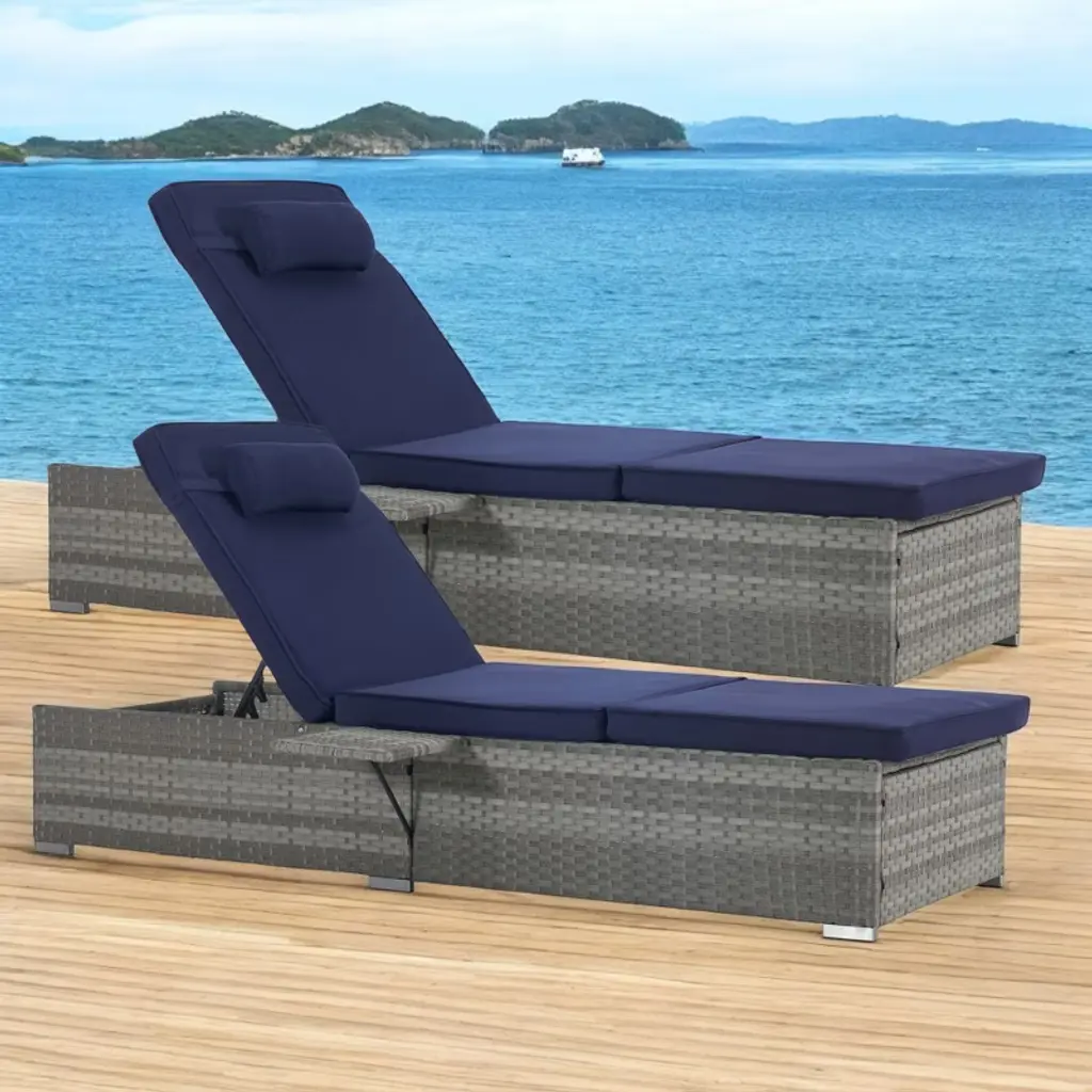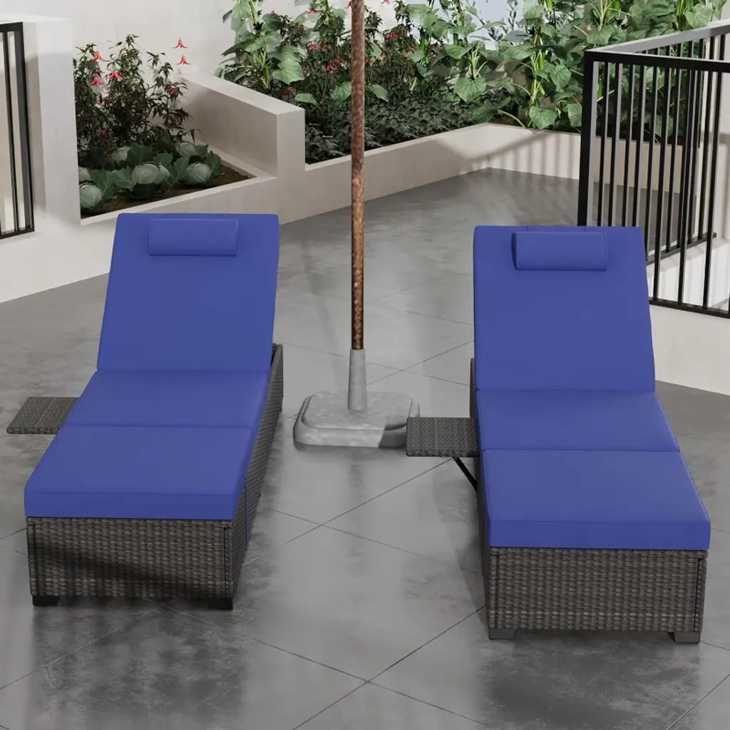The Acekool 2-Piece Outdoor Chaise Lounge Set provides a stylish and comfortable solution for lounging outdoors. With adjustable backrests and thick cushions, these chairs invite you to unwind by the pool, patio, or garden.Built with weather-resistant brown/gray rattan, the set withstands outdoor conditions while maintaining its appearance. Cushions are plush and supportive, enhancing your relaxation experience. The adjustable backrests allow you to choose the ideal angle for sitting or reclining, creating a personalized oasis.This set combines form and function, fitting well with modern outdoor spaces. It’s an excellent choice for enhancing your backyard or pool area with style and comfort.Specifications:Set Includes: 2 chaise lounge chairs with cushionsFrame Color: Brown/GrayCushions Color: Blue/Red/GrayAdjustable Backrest: Multiple reclining positions availableUse: Suitable for patio, poolside, garden, backyardDimensions: Please refer to product packaging for detailed size info