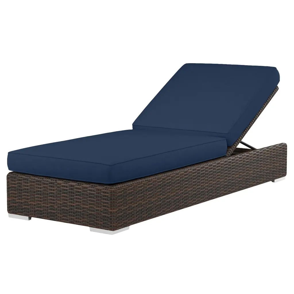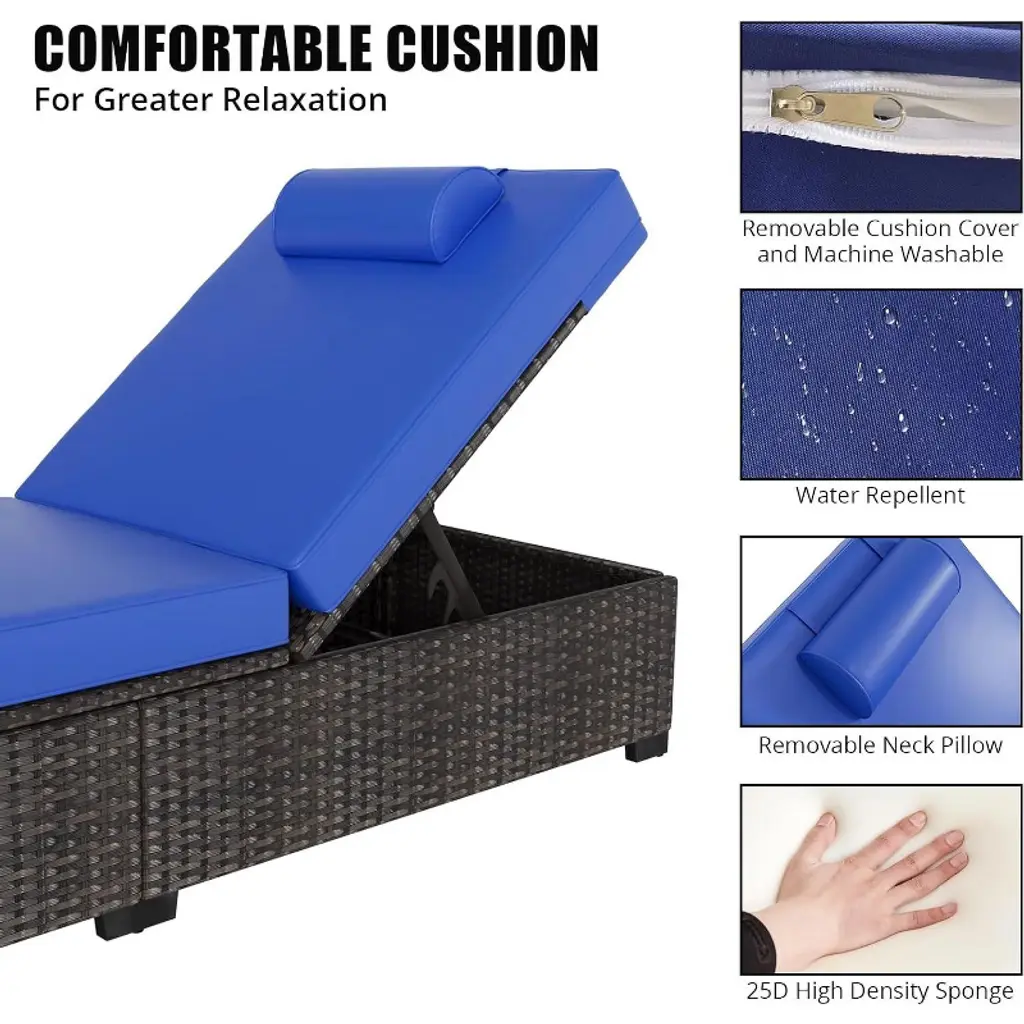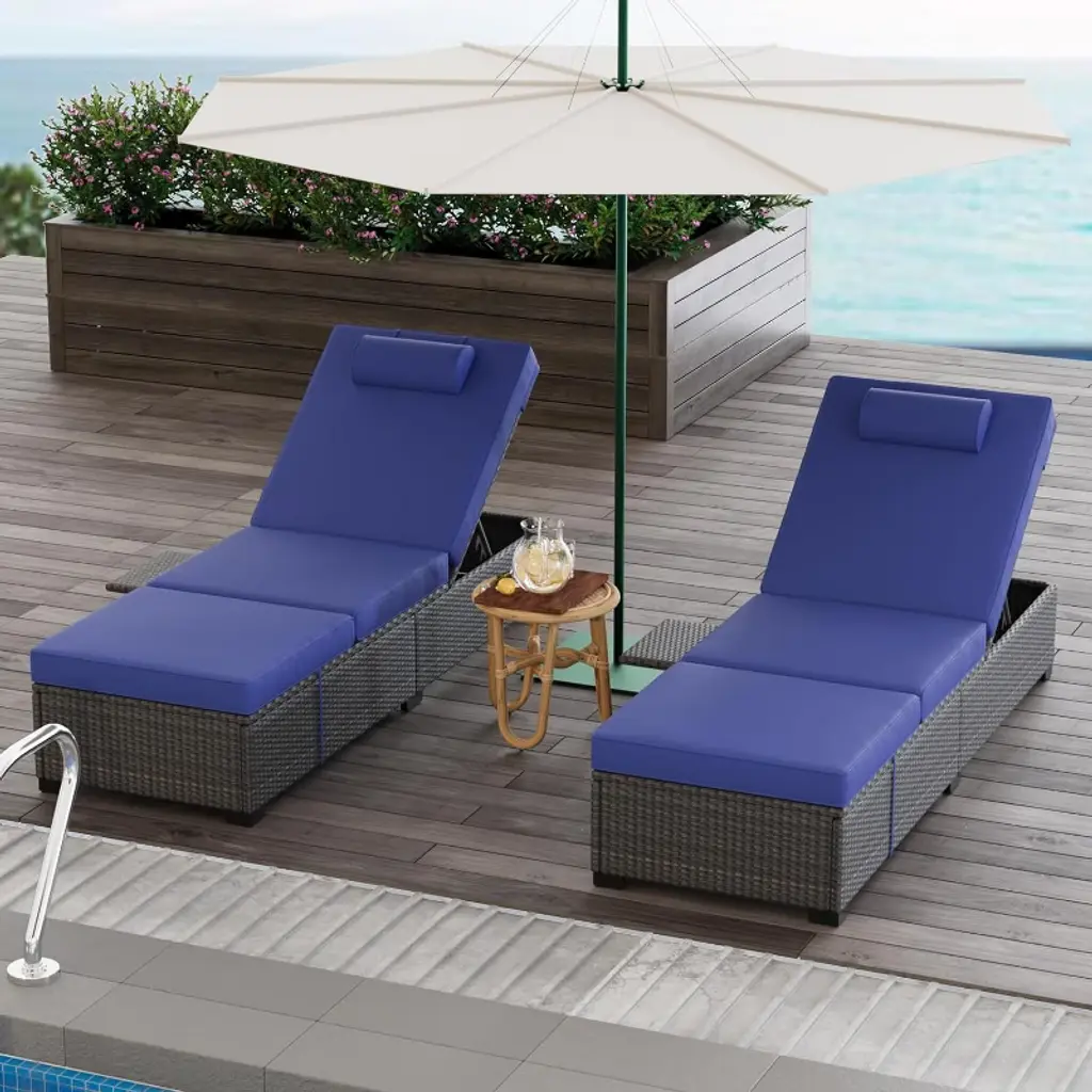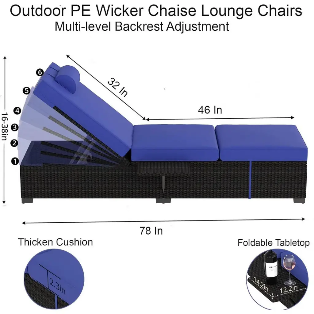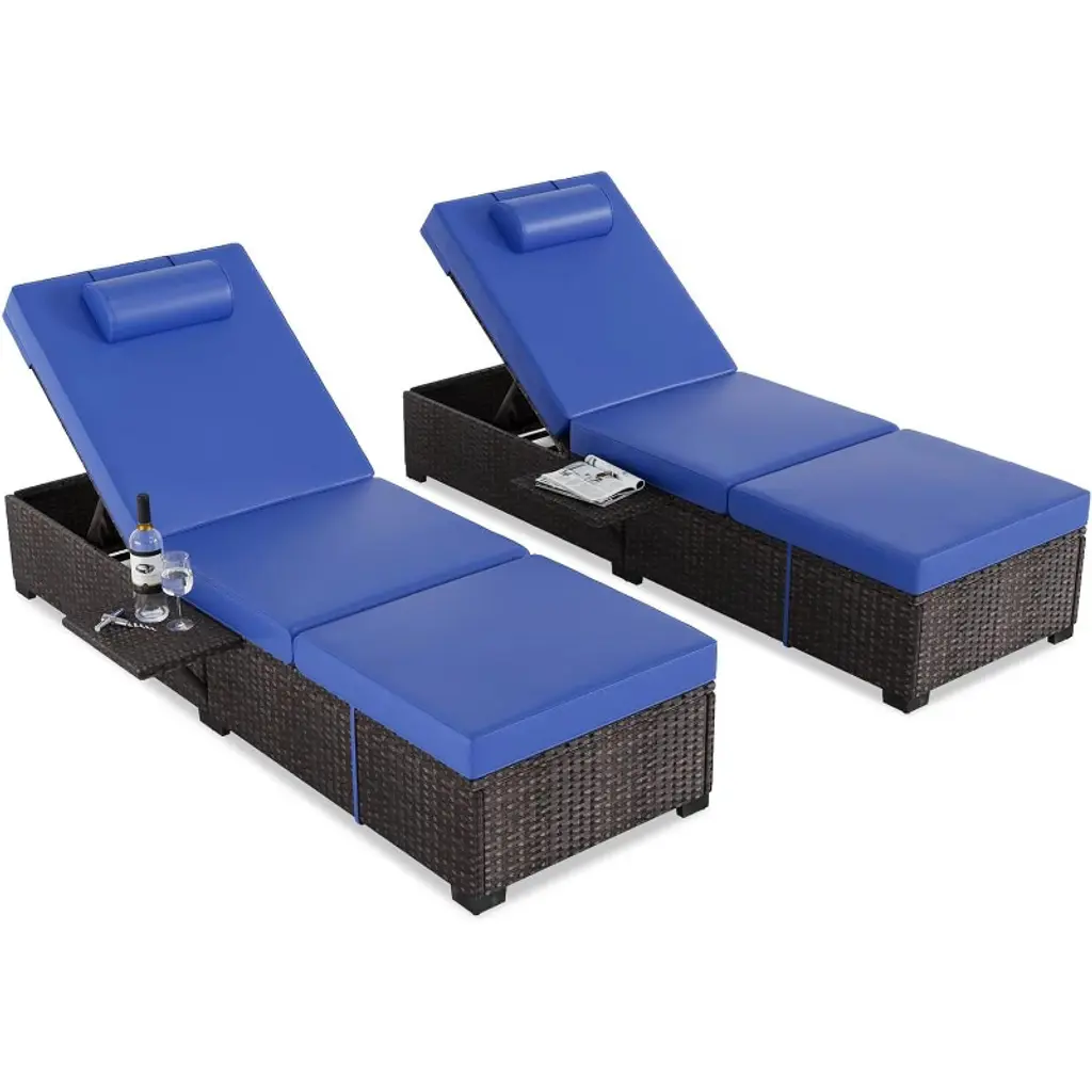 Acekool 2-piece Outdoor Chaise Lounge Set With Adjustable Backrests And Blue Thick Cushions, Brown Rattan Reclining Chairs For Patio & Poolside
