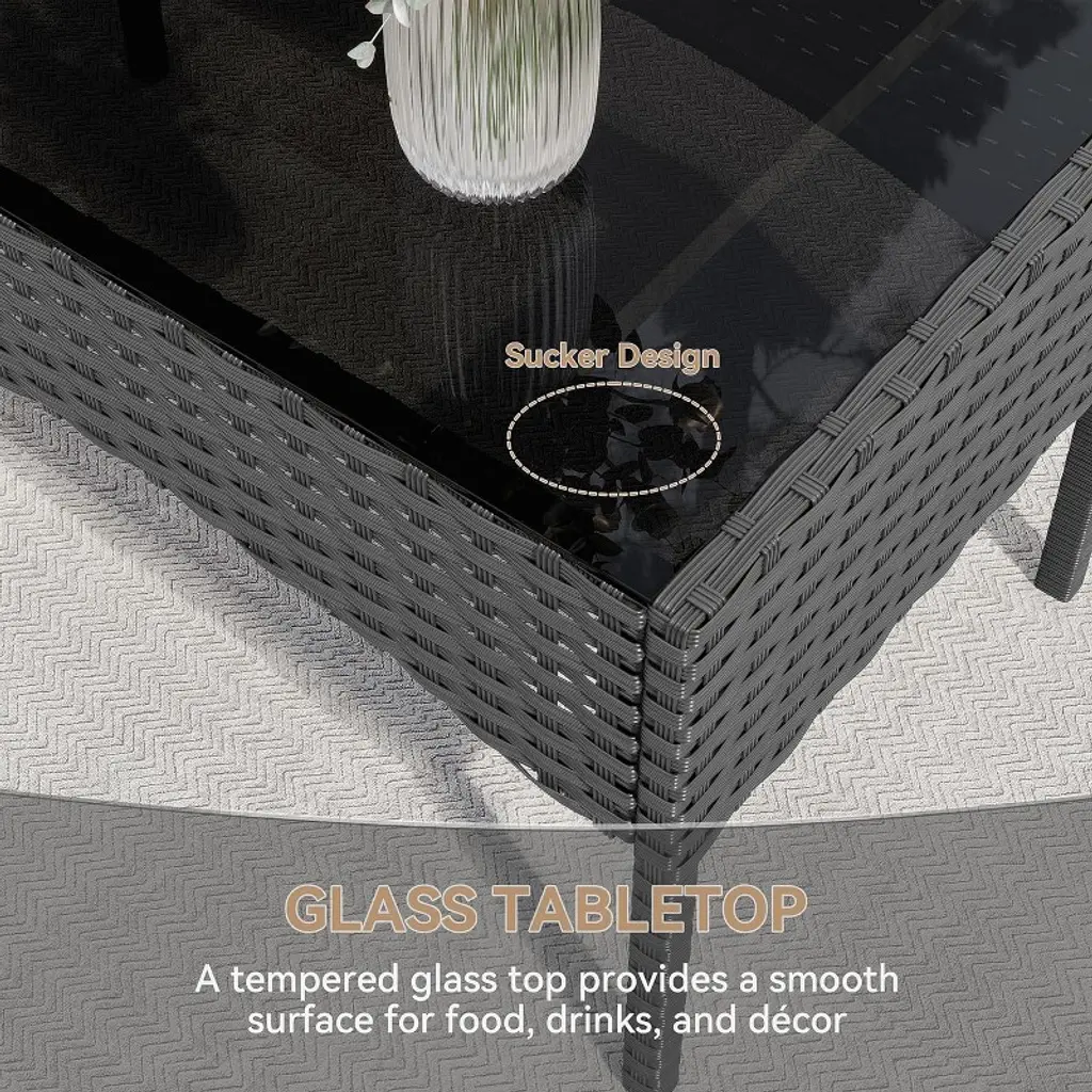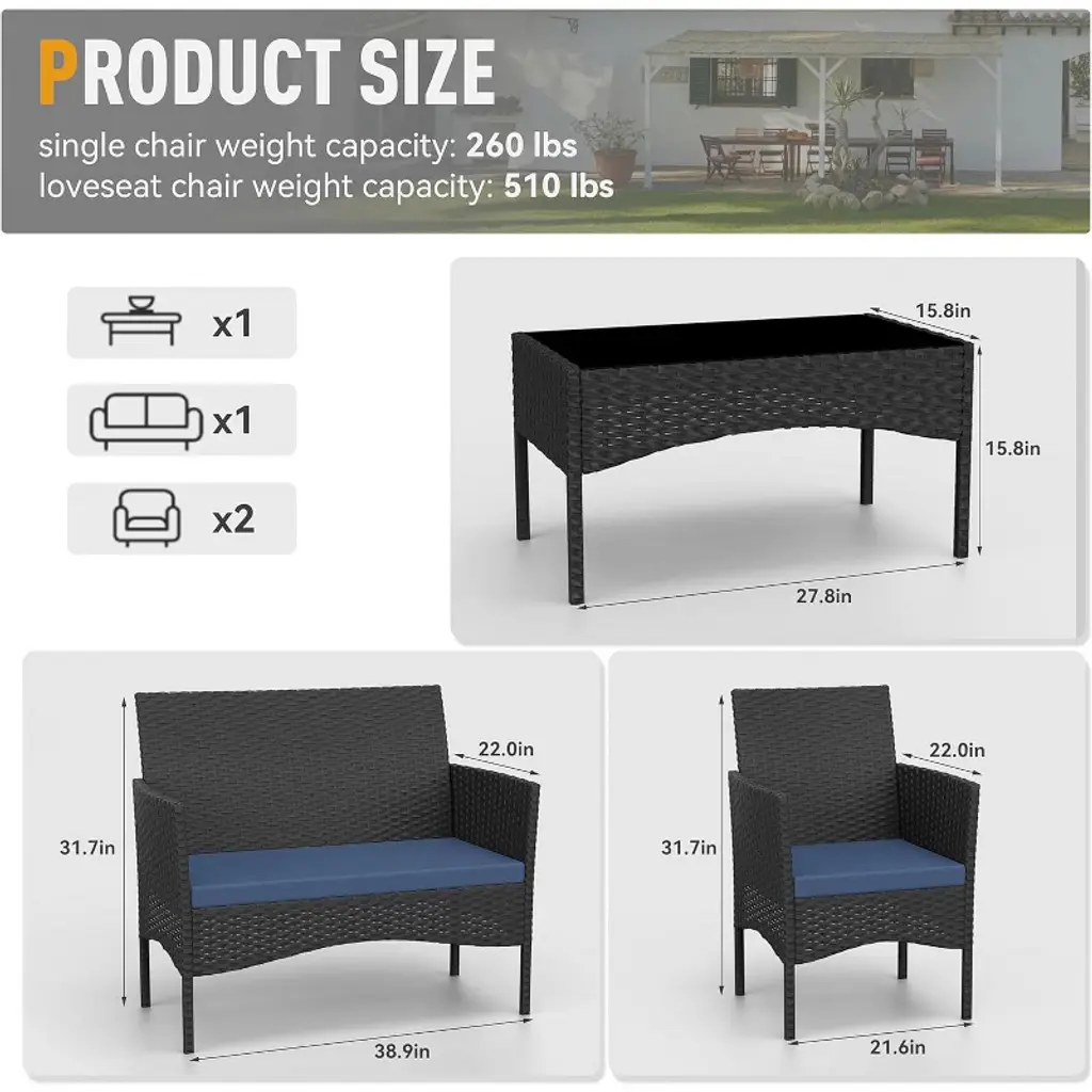This high-quality outdoor wicker sofa set is available in two colors: khaki and navy blue. The set includes one two-seater sofa, two single-seater sofas, and one long coffee table. The sofa stands 31.7 inches tall. Each single-seater sofa measures 22.1 inches long and 21.3 inches wide. The two-seater sofa measures 39 inches in length and 22.1 inches in width. The long coffee table stands 15.2 inches tall, with dimensions of 27.6 inches in length and 15.8 inches in width.