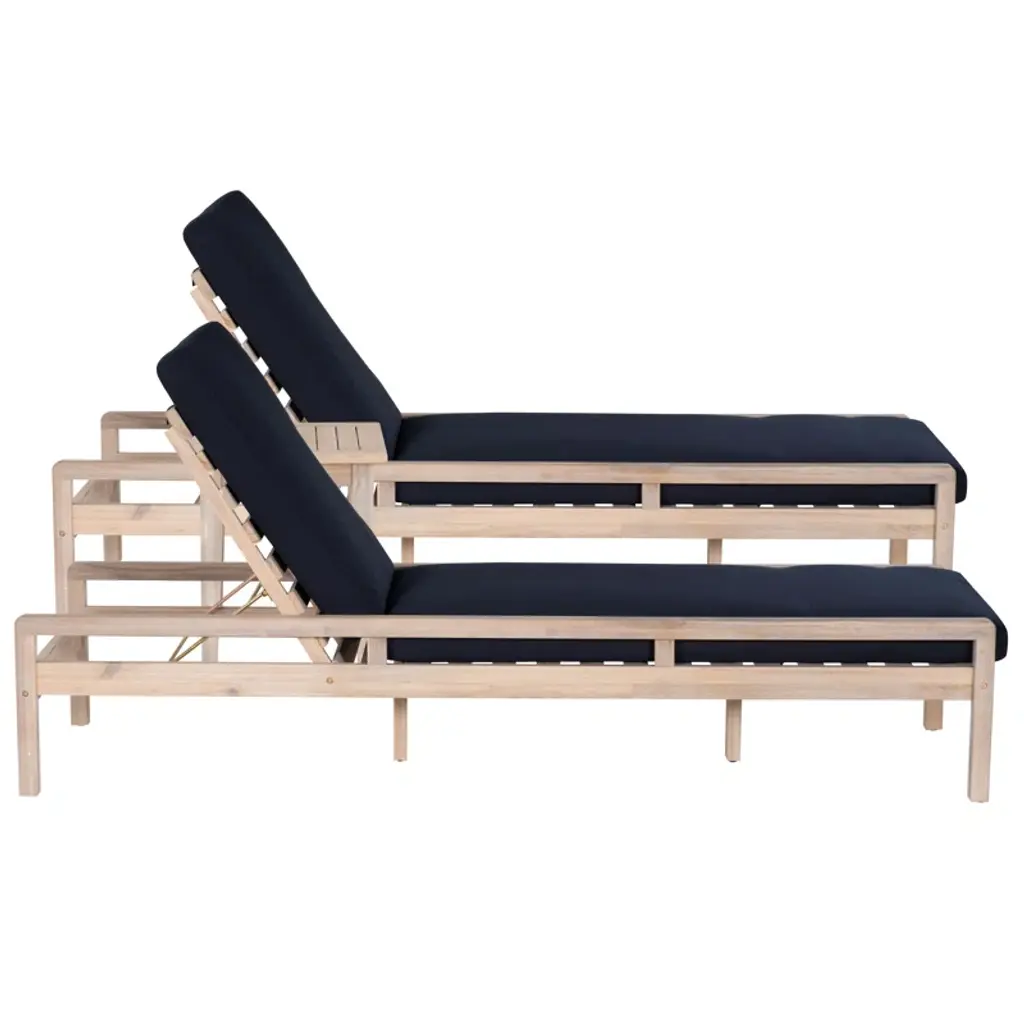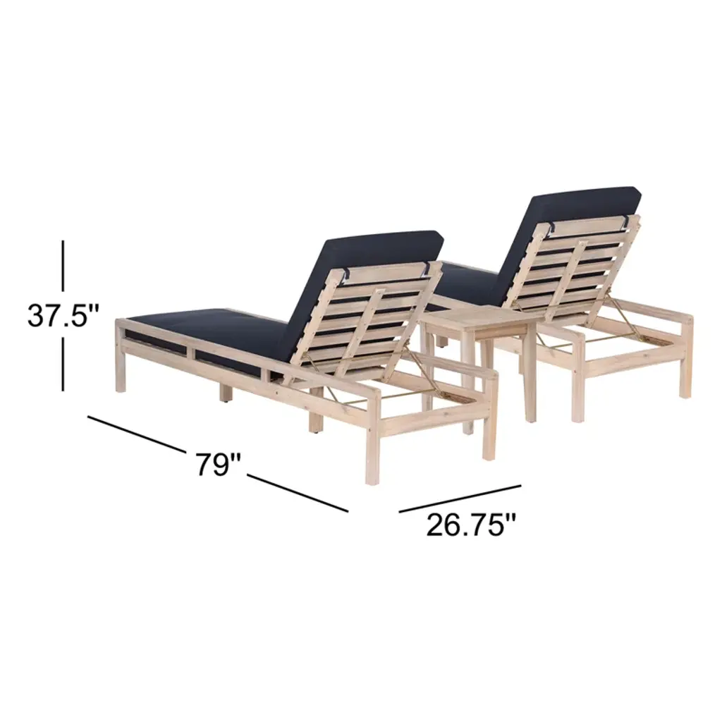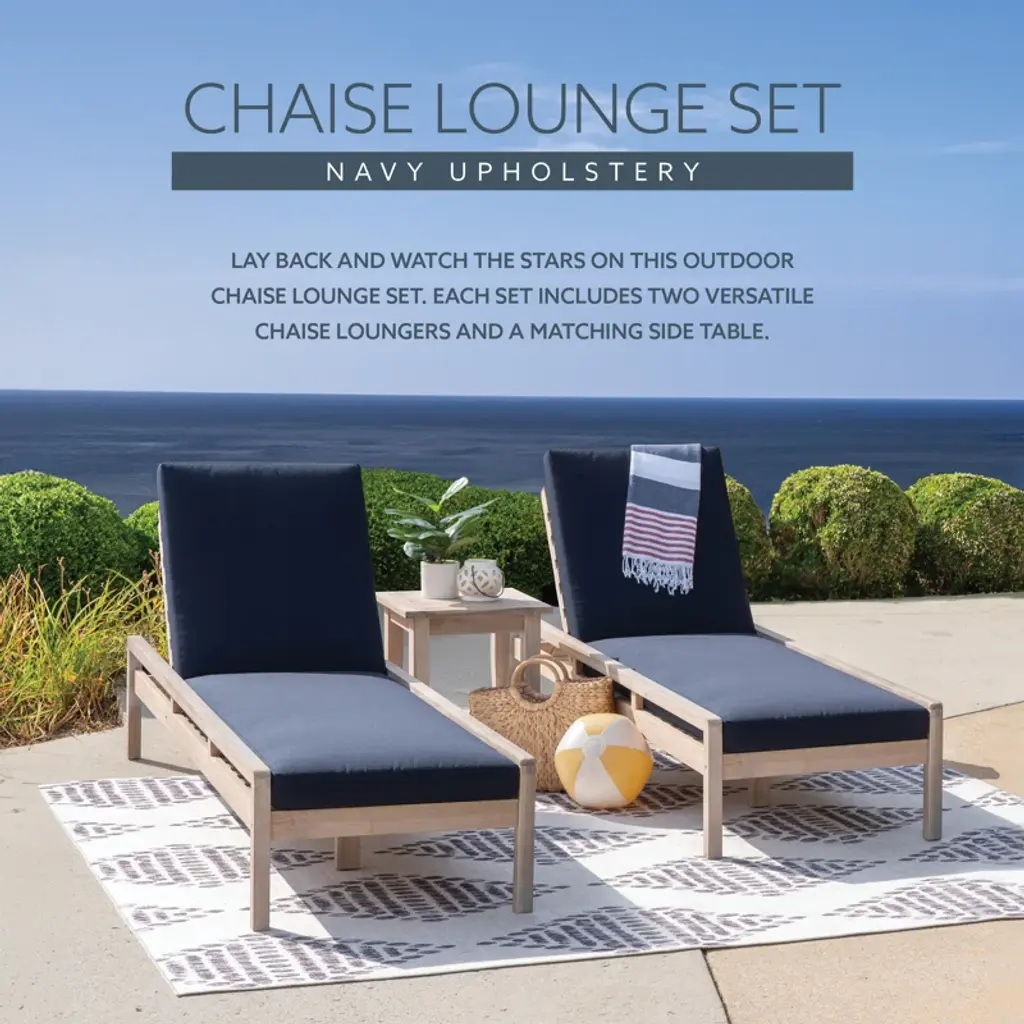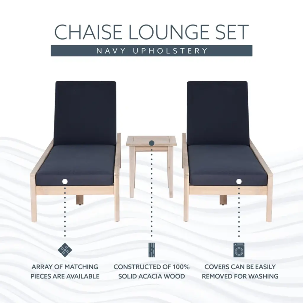 Indulge in outdoor relaxation with our two chaise loungers and a matching side table. Crafted from durable acacia wood with a natural oil stain, these loungers exude warmth and resilience. Paired with navy cushions in 100% olefin fabric, they offer comfort and chic elegance. With a weight capacity of 275lbs and a seat height of 15", these loungers ensure a confident and relaxing experience. The accompanying side table, standing at 20.25" in height with a weight capacity of 100lbs, provides a convenient surface for drinks or essentials, completing your outdoor oasis with both style and functionality.