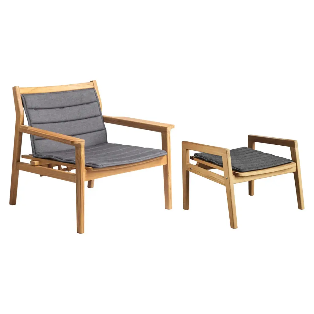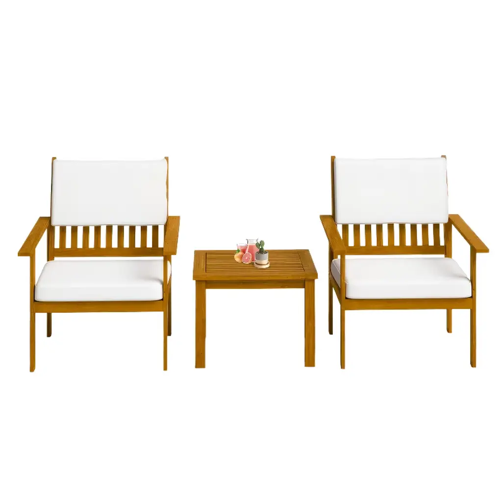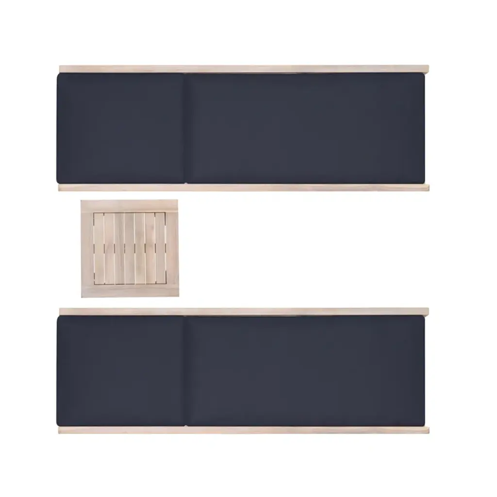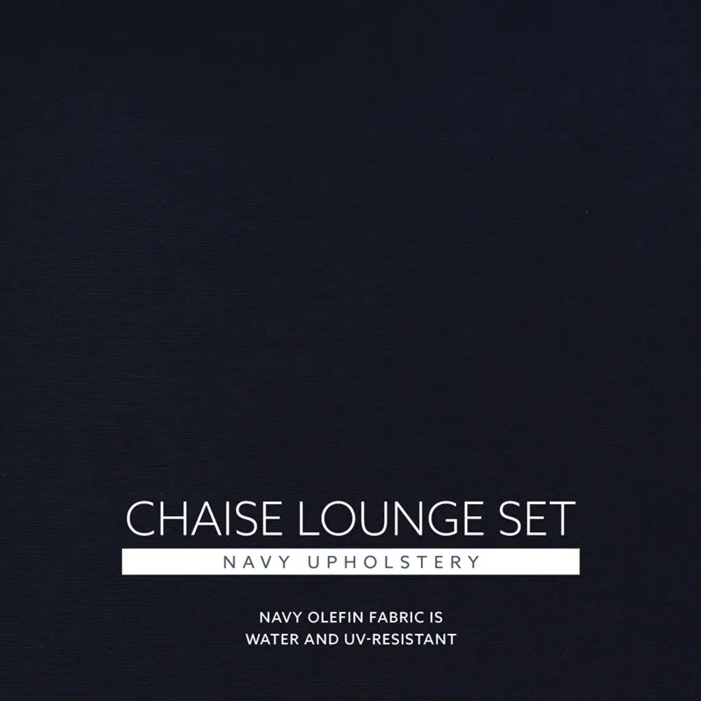 Indulge in outdoor relaxation with our two chaise loungers and a matching side table. Crafted from durable acacia wood with a natural oil stain, these loungers exude warmth and resilience. Paired with navy cushions in 100% olefin fabric, they offer comfort and chic elegance. With a weight capacity of 275lbs and a seat height of 15", these loungers ensure a confident and relaxing experience. The accompanying side table, standing at 20.25" in height with a weight capacity of 100lbs, provides a convenient surface for drinks or essentials, completing your outdoor oasis with both style and functionality.