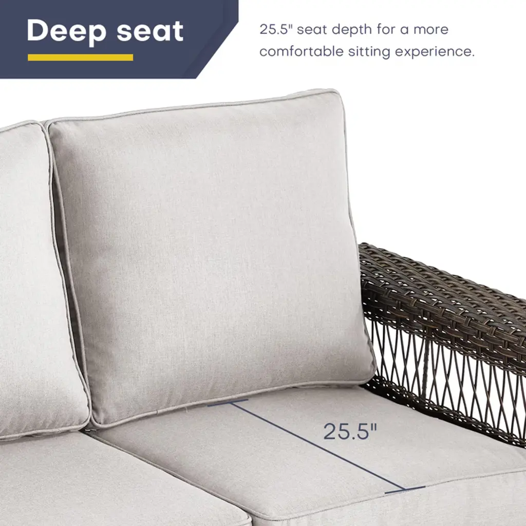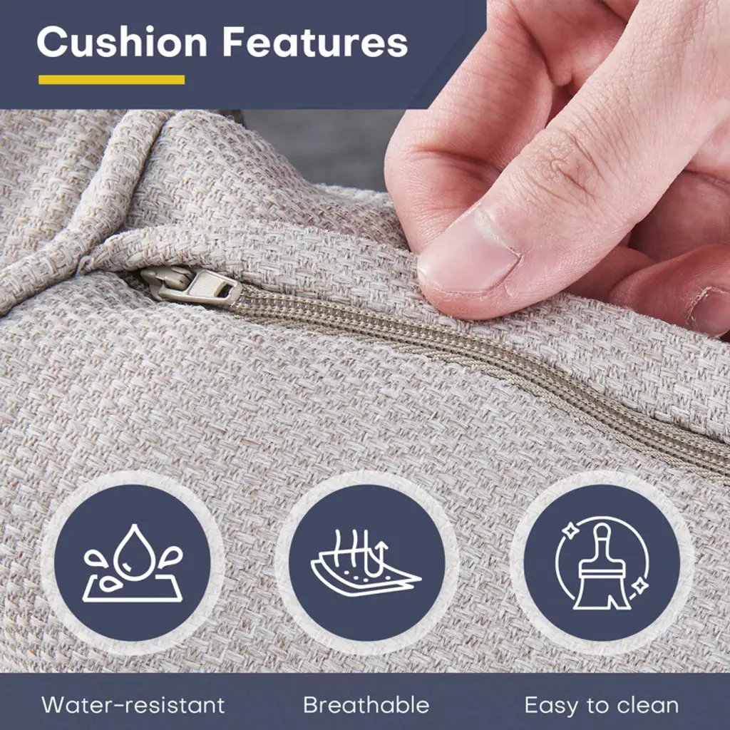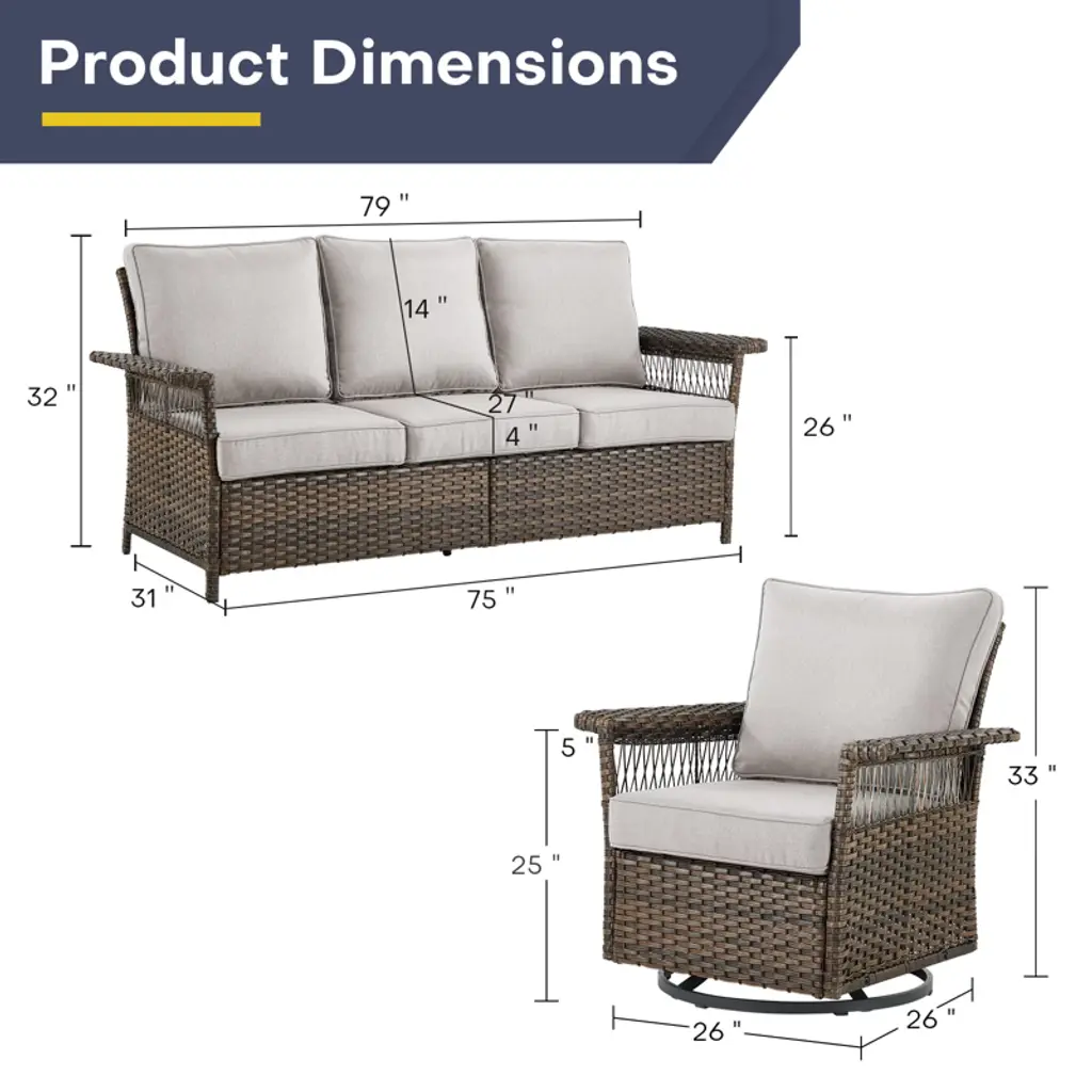 Elevate your outdoor space with the "Seagull" patio conversation set, a perfect blend of elegance and durability. This exquisite ensemble features one outdoor 3-seater sofa and two patio swivel rocking chairs, meticulously crafted from weather-resistant PE rattan and supported by a powder-coated steel frame for lasting resilience. Inspired by the graceful form of seagulls, the patio set's ventilated cut-outs ensure optimal airflow, while the inverted trapezoidal back cushions provide exceptional comfort, making it ideal for long, leisurely conversations. Designed for both style and performance, the "Seagull" boasts wider armrests for added relaxation and premium Olefin fabric cushion covers - breathable, UV-resistant, and water-repellent - ensuring beauty that endures season after season. Whether hosting gatherings or enjoying quiet moments outdoors, this set delivers unmatched sophistication and functionality, making it the ultimate choice for your summer retreat.