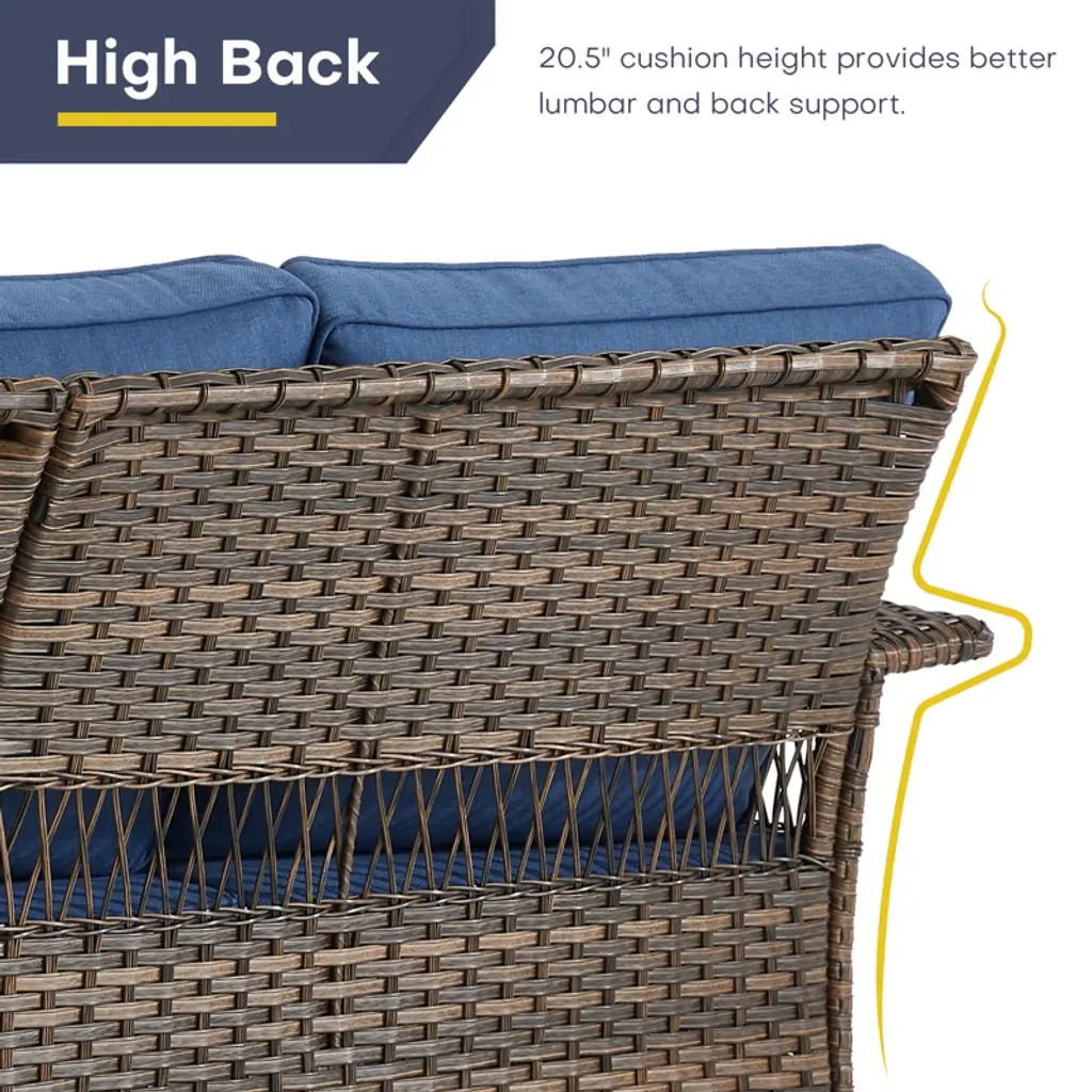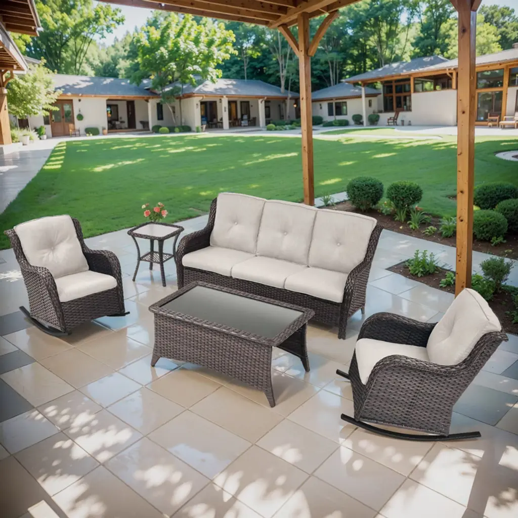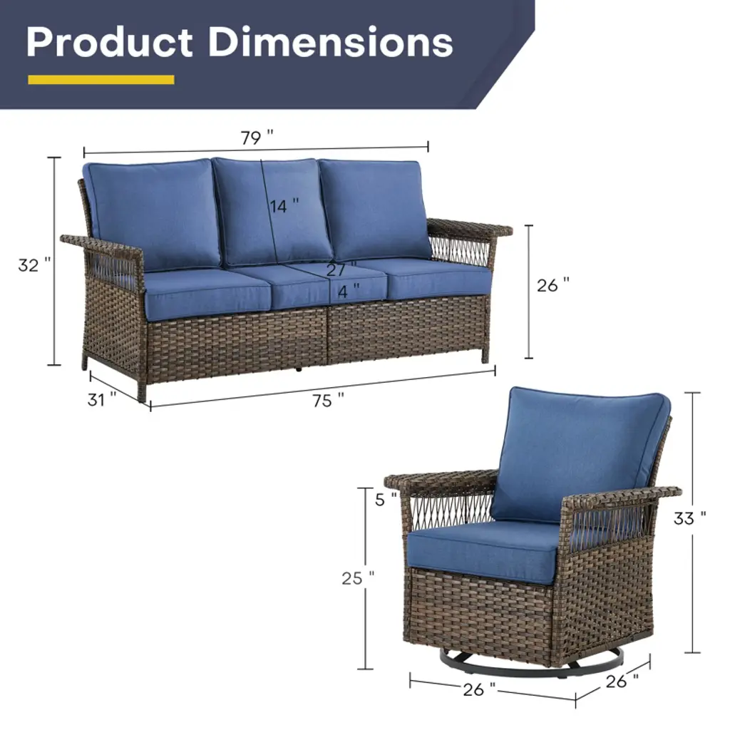 Elevate your outdoor space with the "Seagull" patio conversation set, a perfect blend of elegance and durability. This exquisite ensemble features one outdoor 3-seater sofa and two patio swivel rocking chairs, meticulously crafted from weather-resistant PE rattan and supported by a powder-coated steel frame for lasting resilience. Inspired by the graceful form of seagulls, the patio set's ventilated cut-outs ensure optimal airflow, while the inverted trapezoidal back cushions provide exceptional comfort, making it ideal for long, leisurely conversations. Designed for both style and performance, the "Seagull" boasts wider armrests for added relaxation and premium Olefin fabric cushion covers - breathable, UV-resistant, and water-repellent - ensuring beauty that endures season after season. Whether hosting gatherings or enjoying quiet moments outdoors, this set delivers unmatched sophistication and functionality, making it the ultimate choice for your summer retreat.