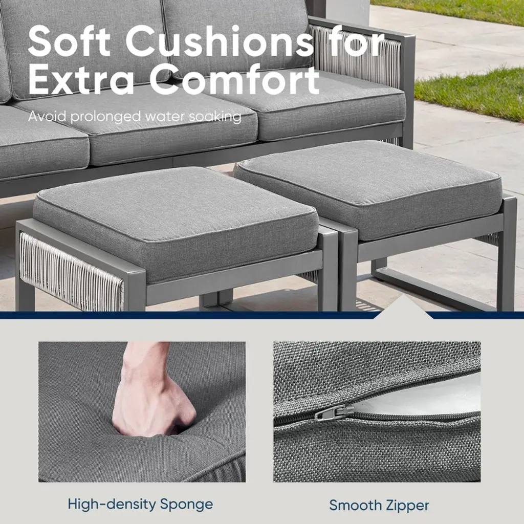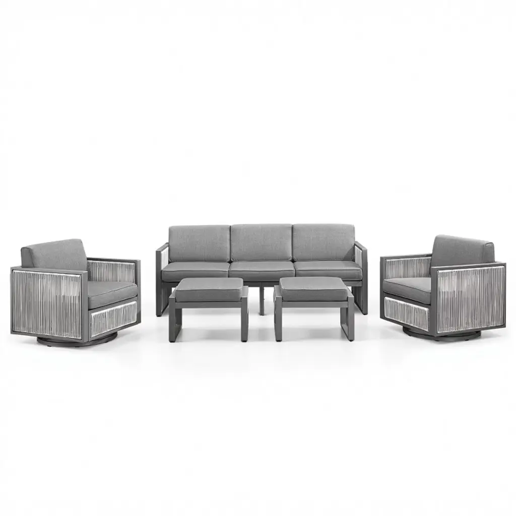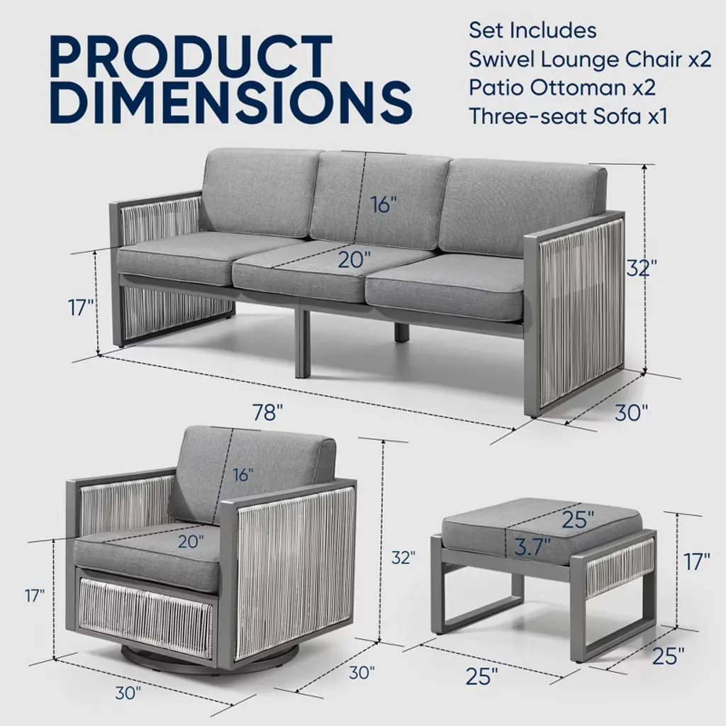 Transform your outdoor area with the elegant Belord 5-Piece Luxury Patio Furniture Set, designed to bring both style and comfort to your backyard, deck, or garden. This premium lounge set features plush 4.7-inch thick seat cushions made with high-resilience polyurethane foam and soft polyester fiber batting, offering lasting support for all-day relaxation. The back cushions, filled with airy polyester fiber, gently cradle your back for added comfort. Wrapped in durable 100% olefin fabric, these cushions are built to withstand the elements¡ªresisting sun, rain, and fading. With a smooth swivel and gentle rocking motion, each chair turns your outdoor downtime into a truly enjoyable and relaxing experience.
