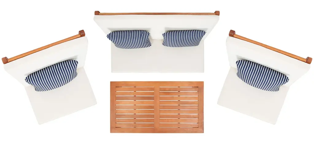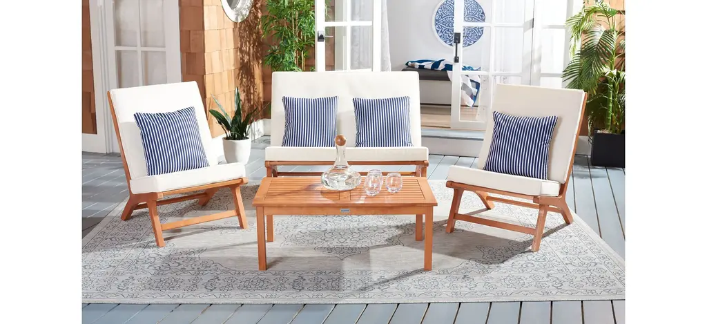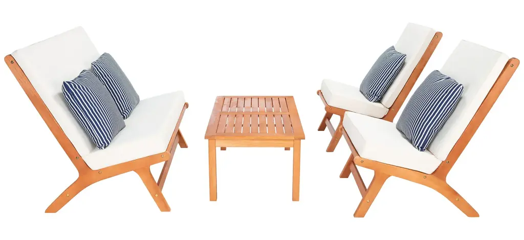 Alive with surf and sand, Sao Paulo's legendary beaches inspired the outdoor living Bishop 4-pc. Patio Set. Crafted of rich natural wood, its clean lines and plush upholstery is ideal for afternoon lounging by the pool. Includes bolster pillows to provide a complementary color accent.