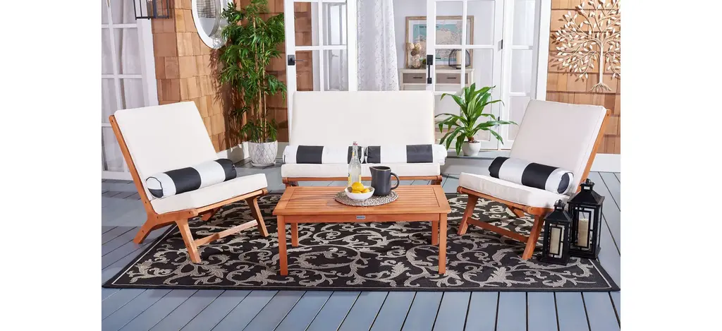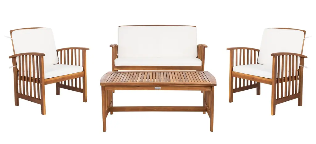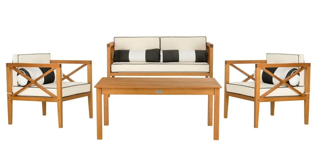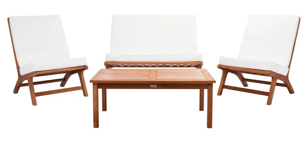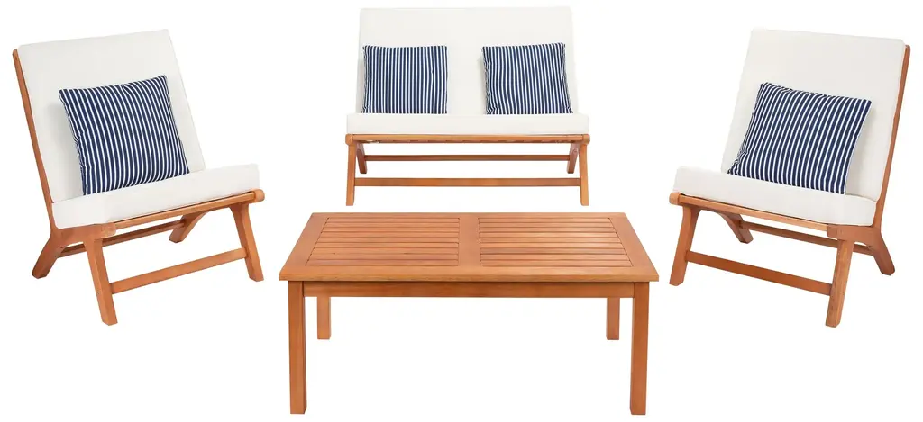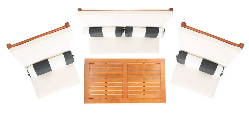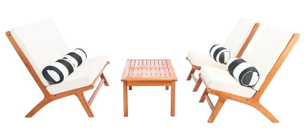 Alive with surf and sand, Sao Paulo's legendary beaches inspired the outdoor living Bishop 4-pc. Patio Set. Crafted of rich natural wood, its clean lines and plush upholstery is ideal for afternoon lounging by the pool. Includes bolster pillows to provide a complementary color accent.